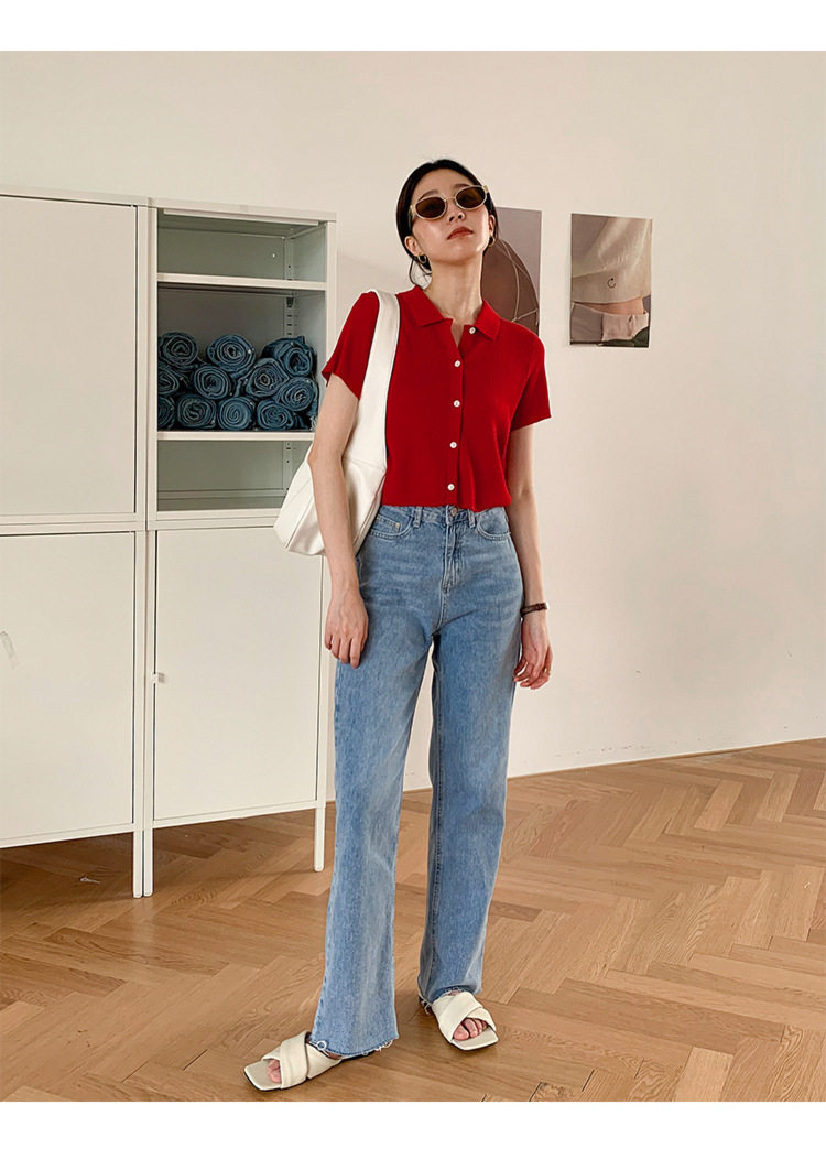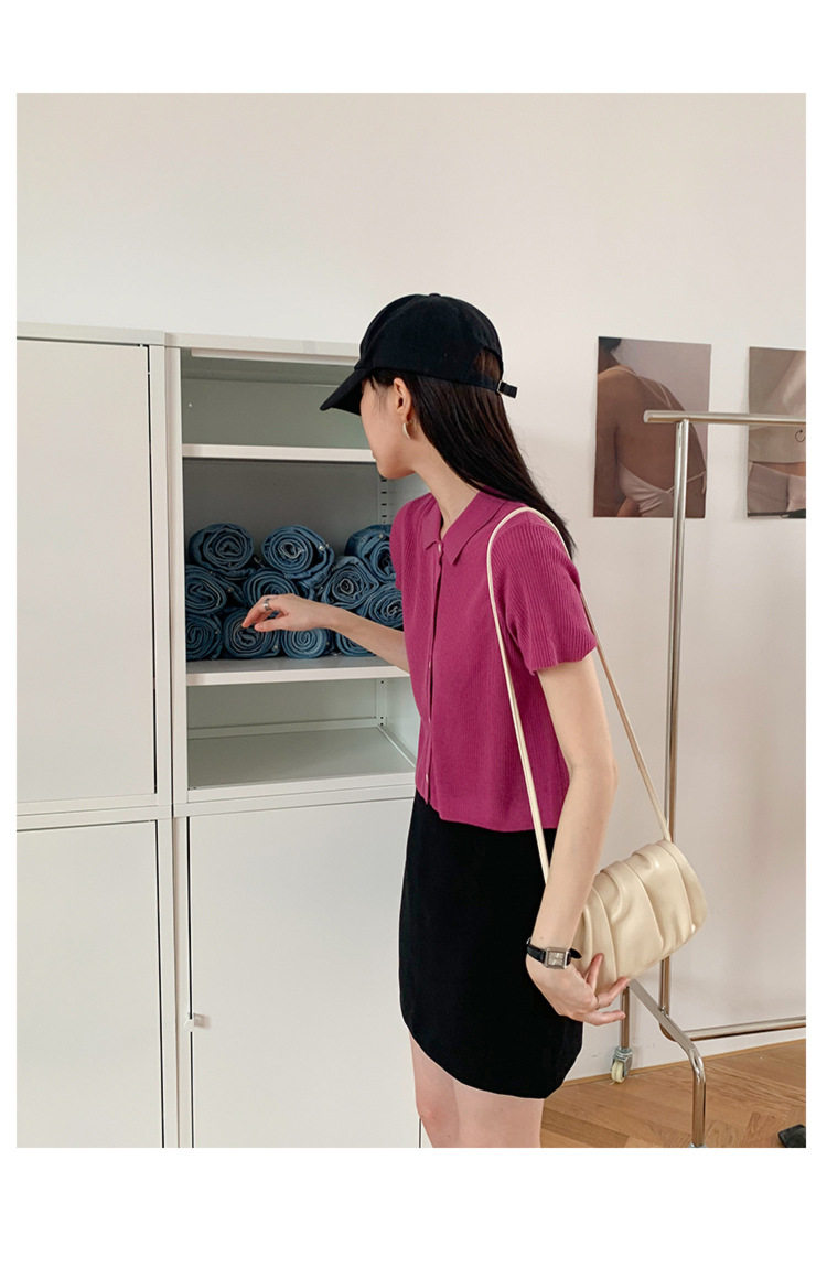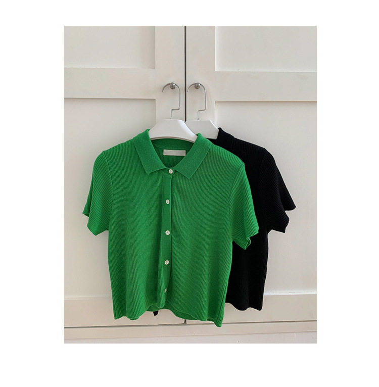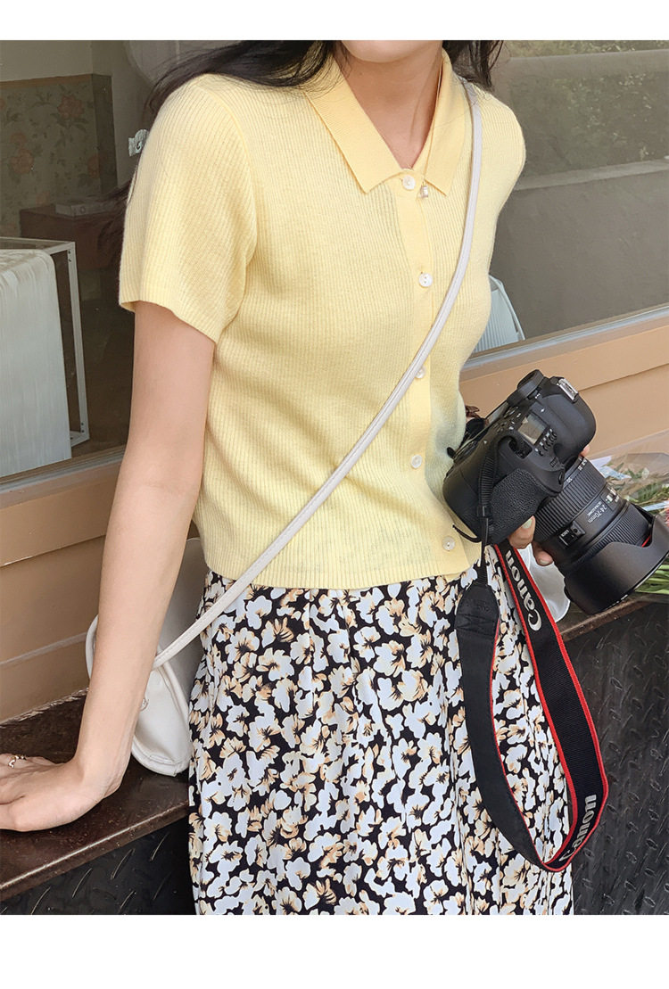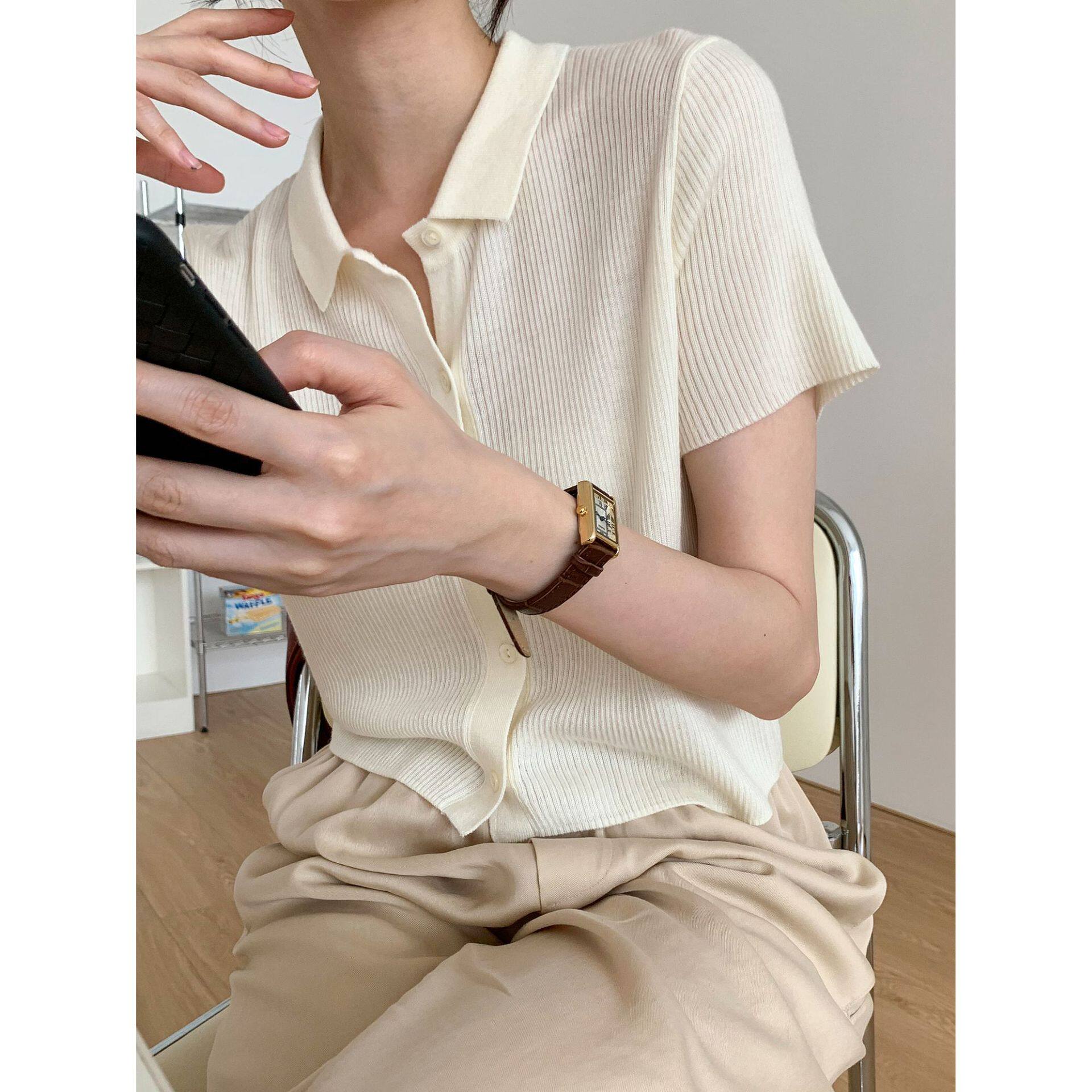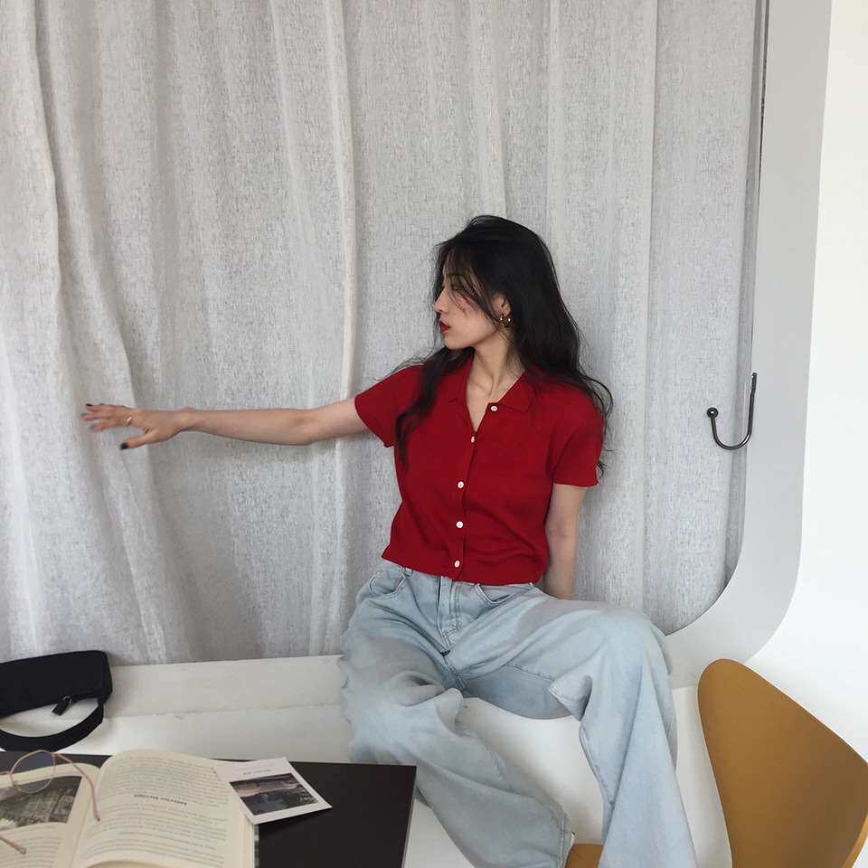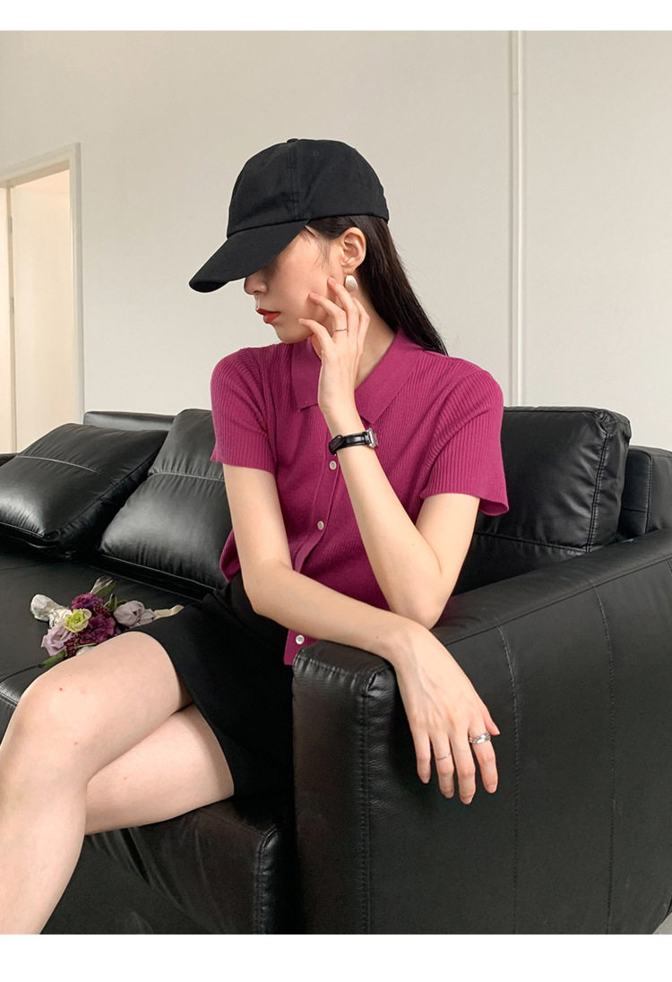 Дизайнерский короткий трикотажный кардиган, высокая талия, тренд сезона, французский стиль, воротник поло, короткий рукав