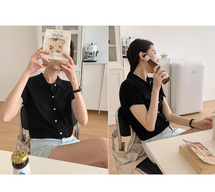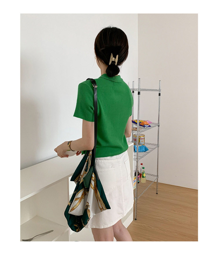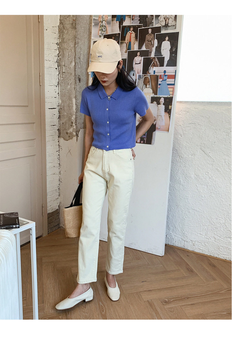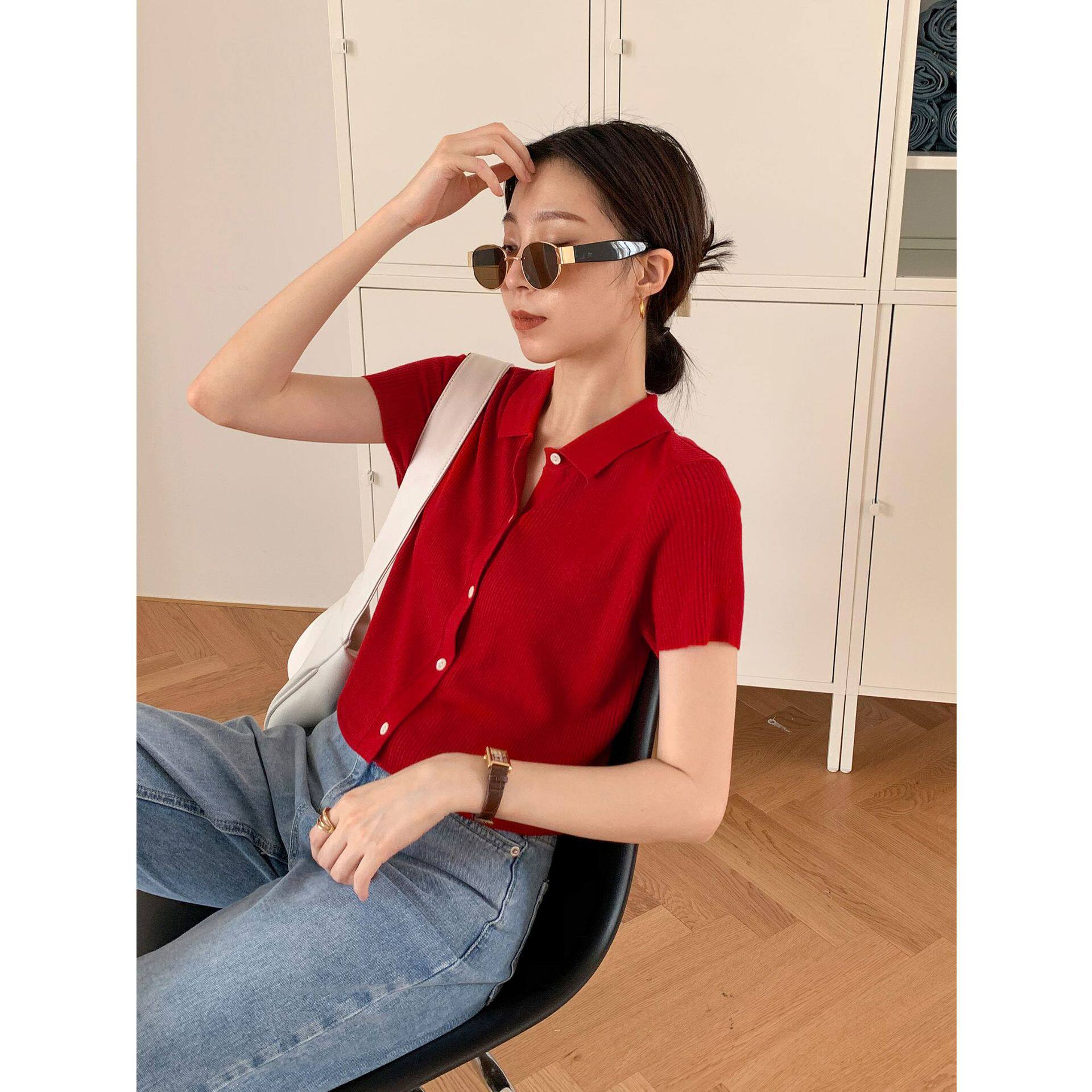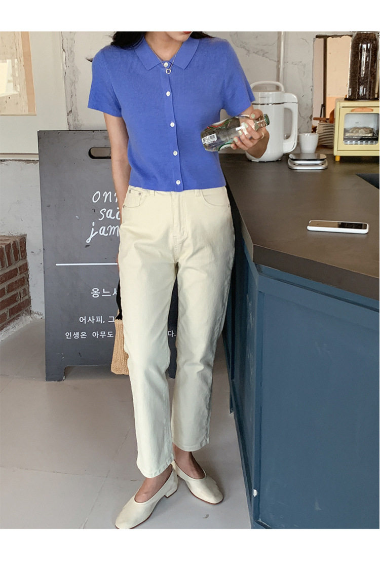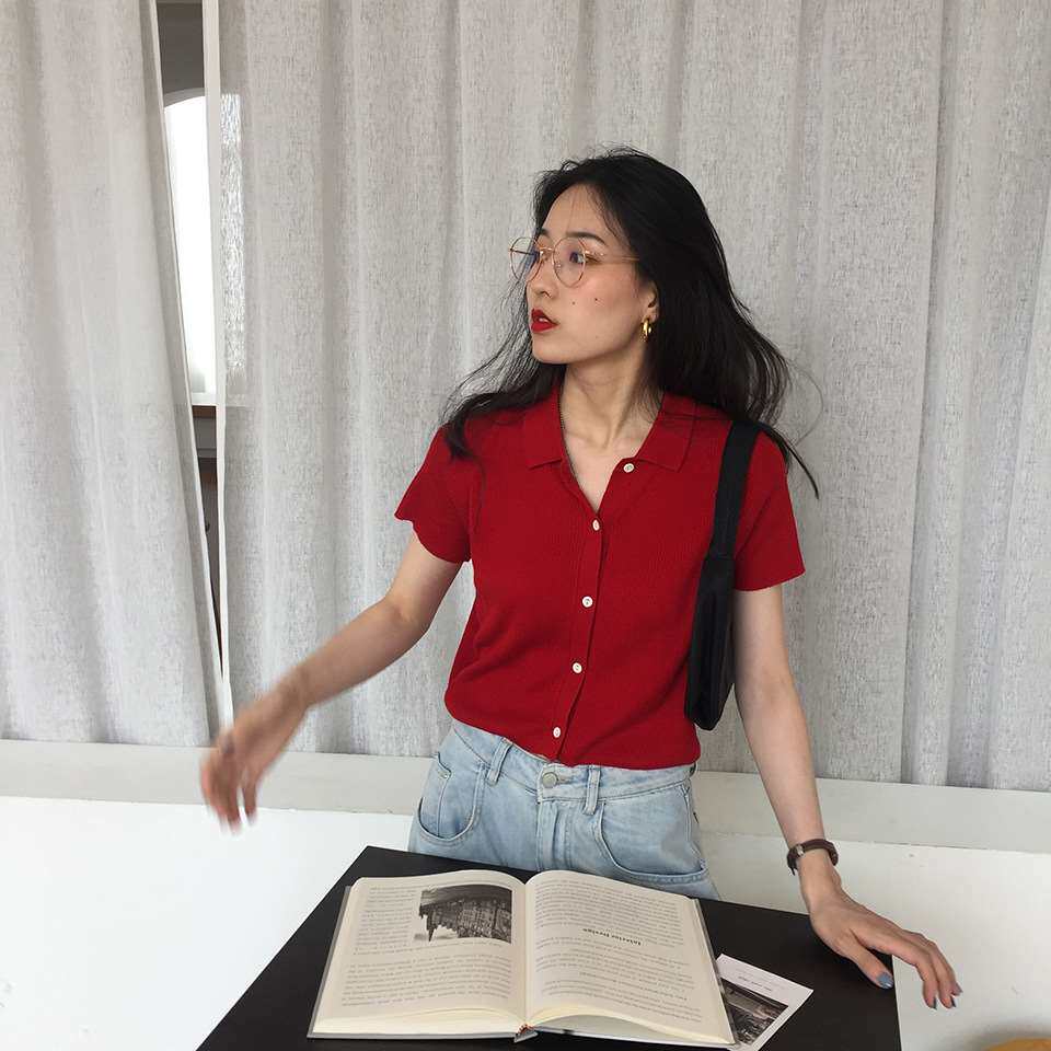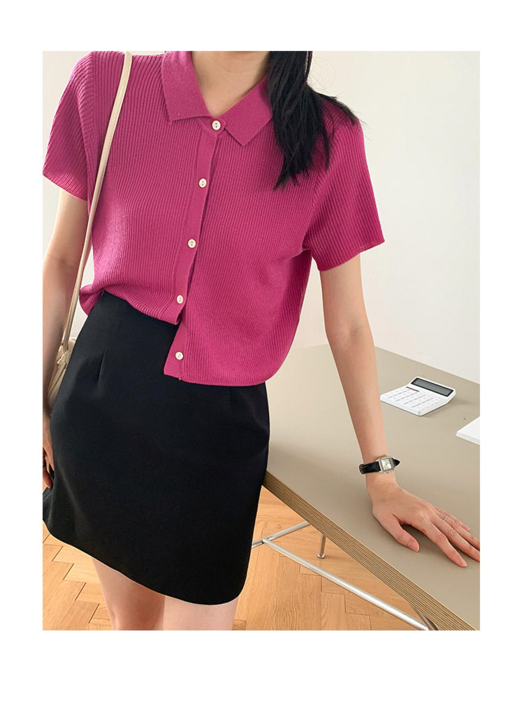 Дизайнерский короткий трикотажный кардиган, высокая талия, тренд сезона, французский стиль, воротник поло, короткий рукав