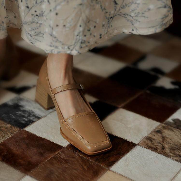Одинарные туфли, женские туфли Мэри Джейн в стиле ретро, новинка весны 2022 года, французские туфли с квадратным носком и пряжкой в одно слово, кожаные туфли на толстом каблуке из натуральной кожи на среднем каблуке