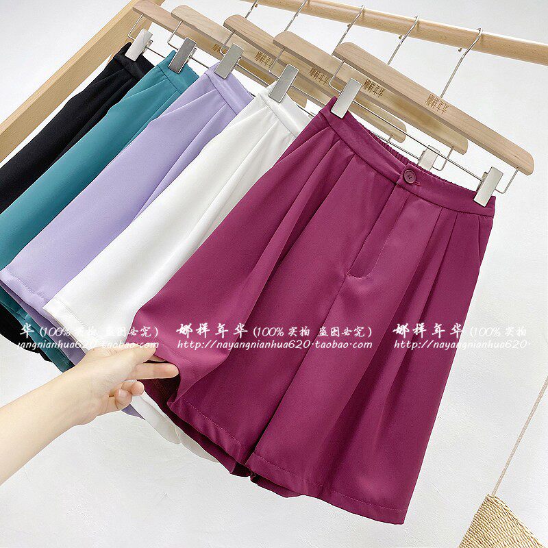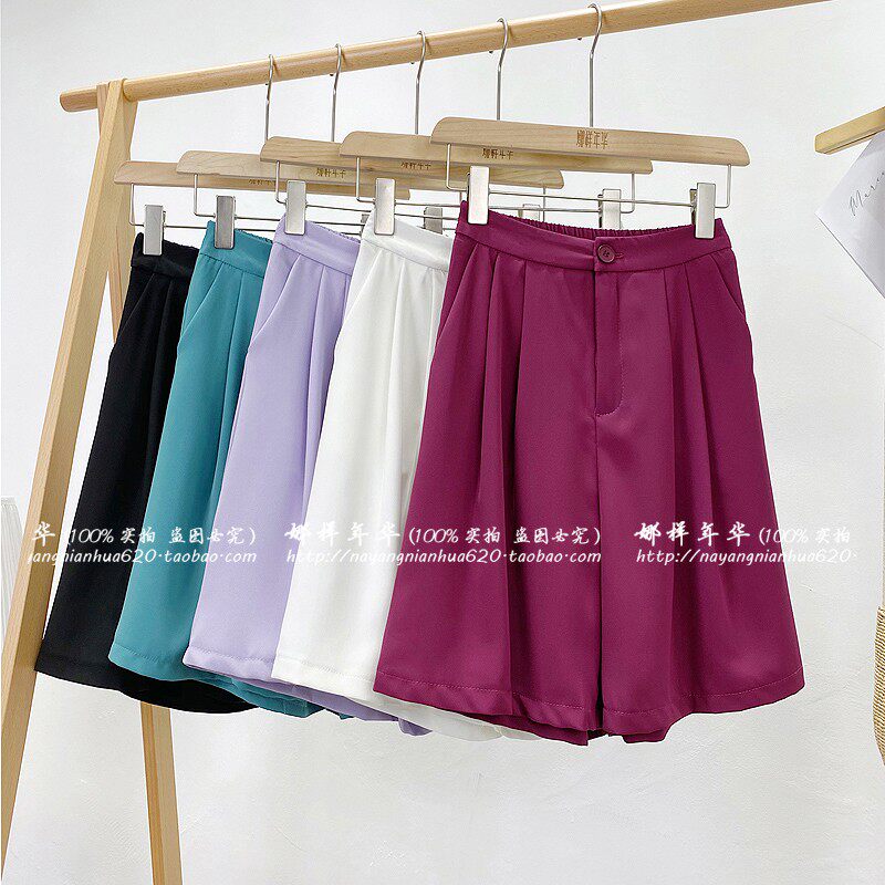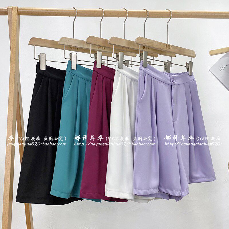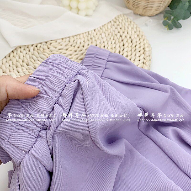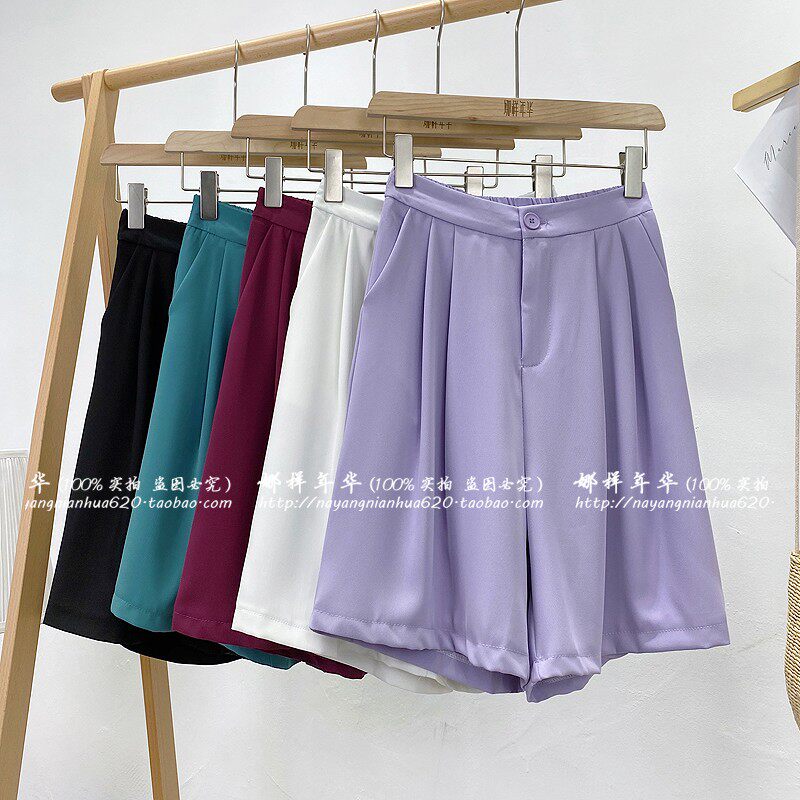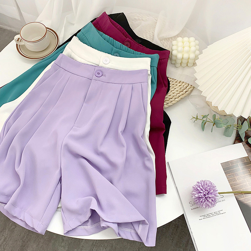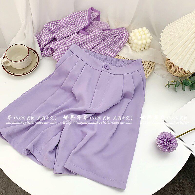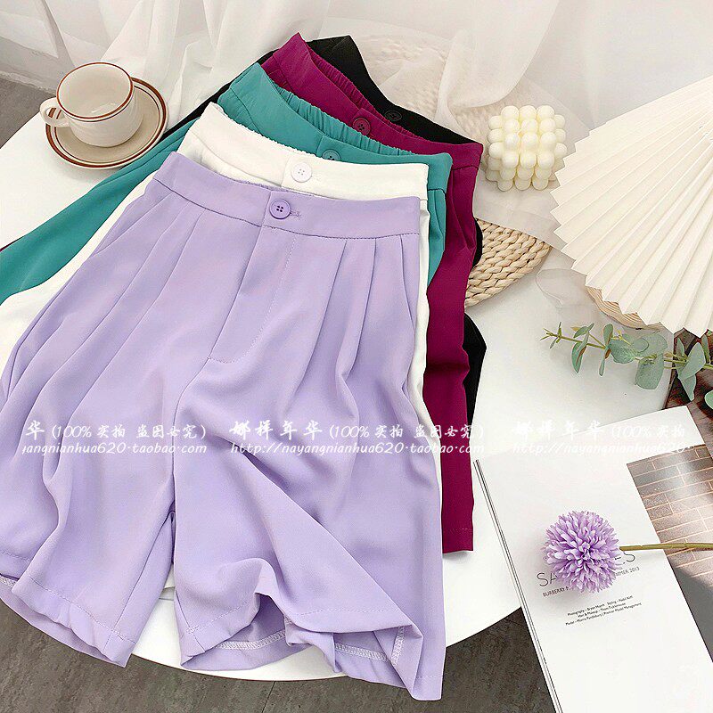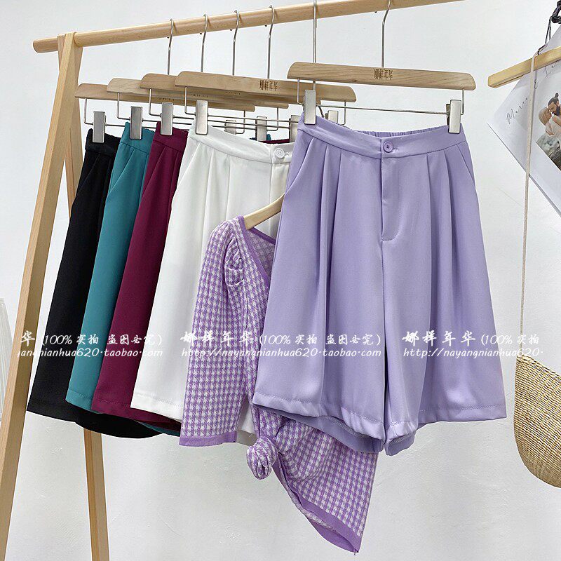 Сиреневый цветной шелковый костюм, шорты, штаны, повседневные брюки, высокая талия, свободный прямой крой