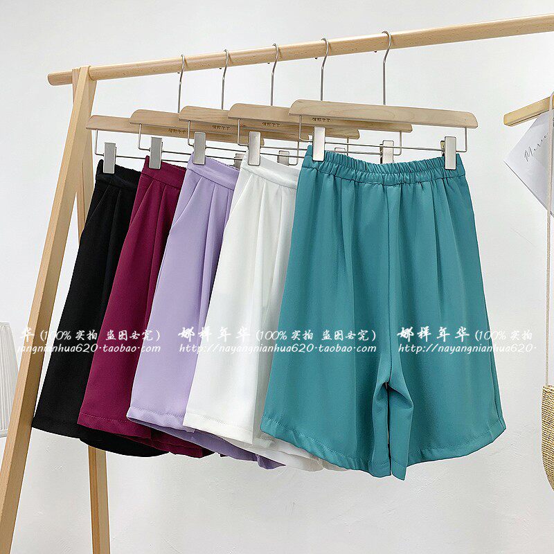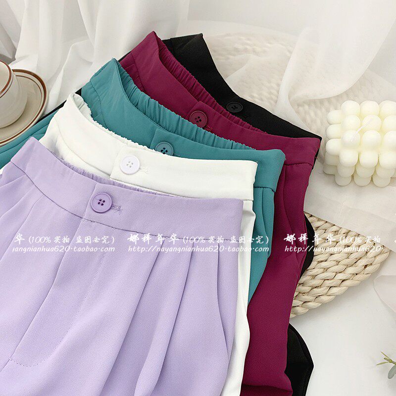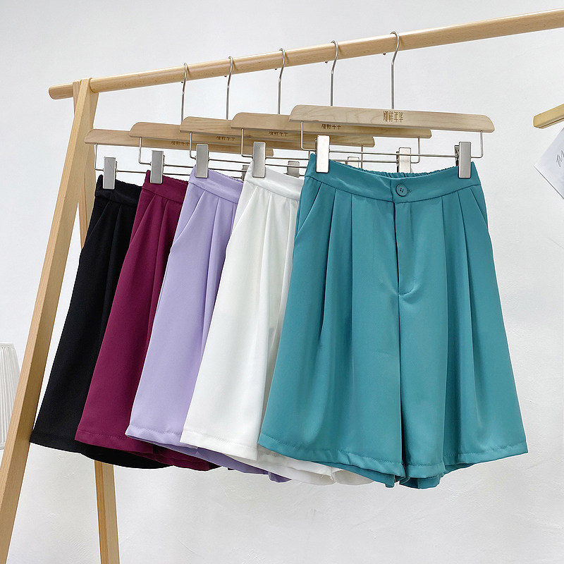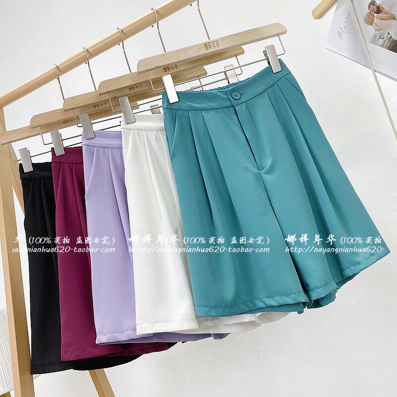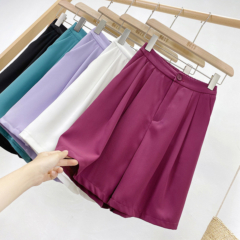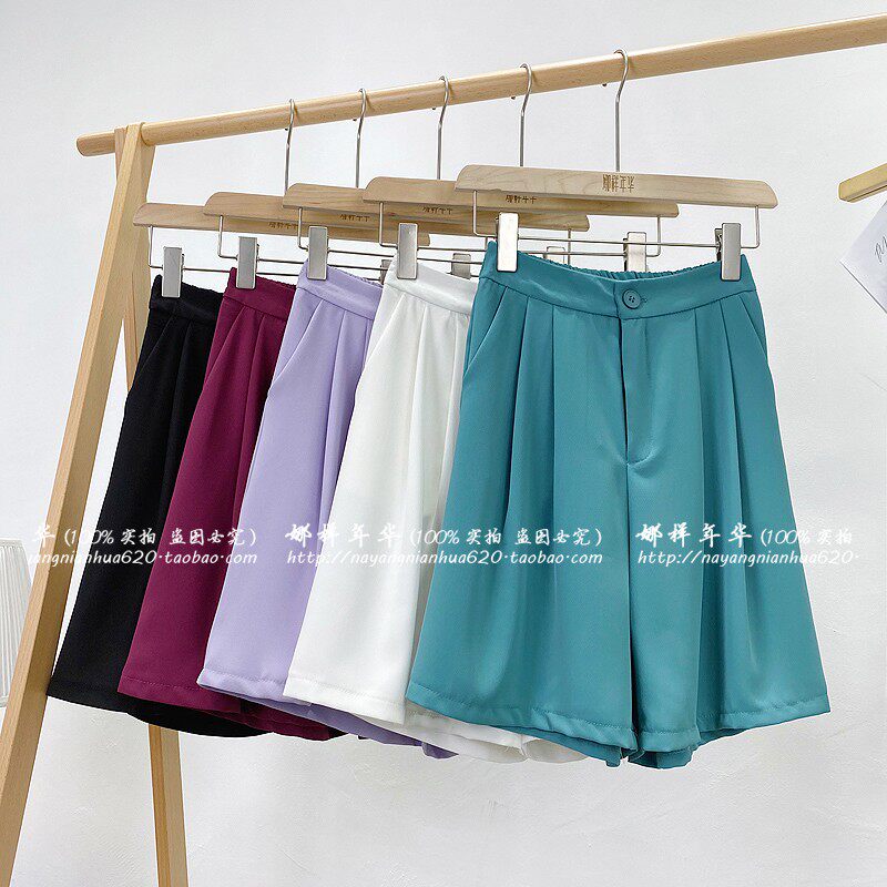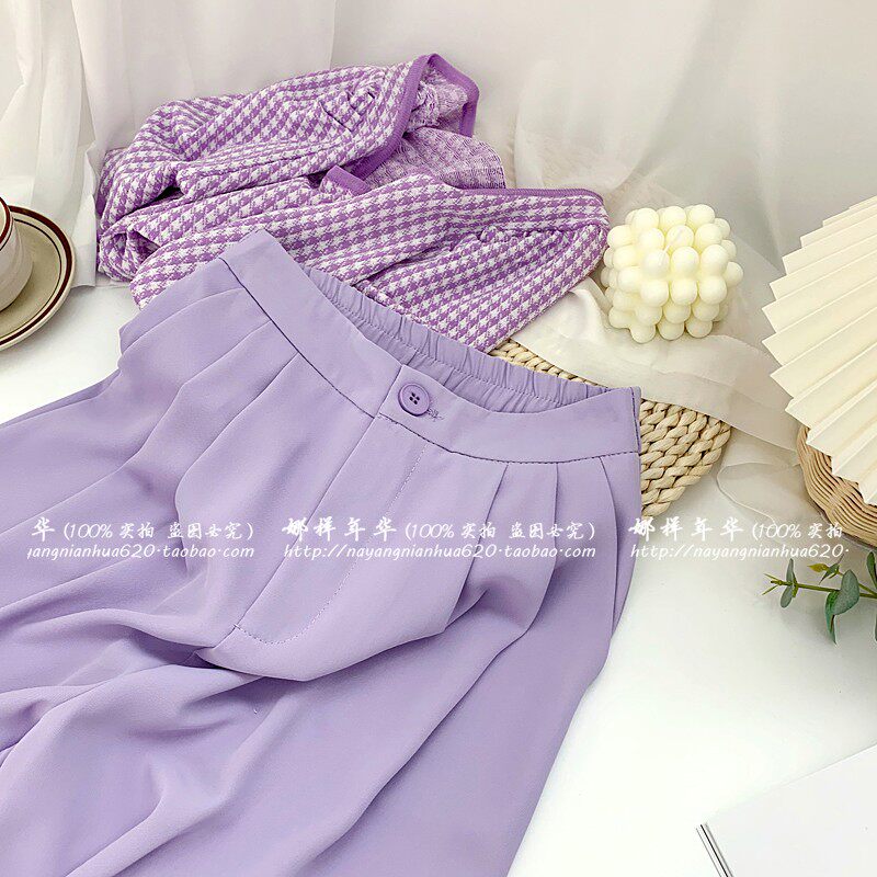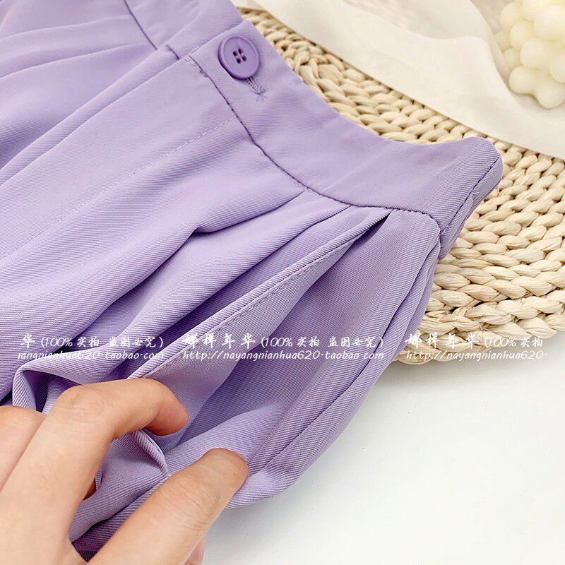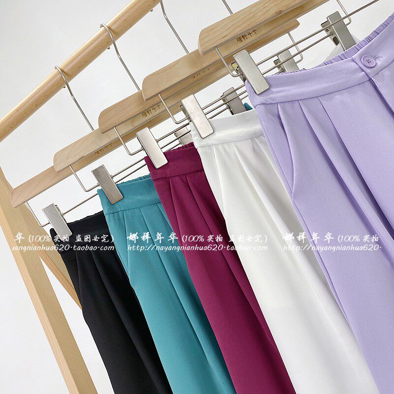 Сиреневый цветной шелковый костюм, шорты, штаны, повседневные брюки, высокая талия, свободный прямой крой