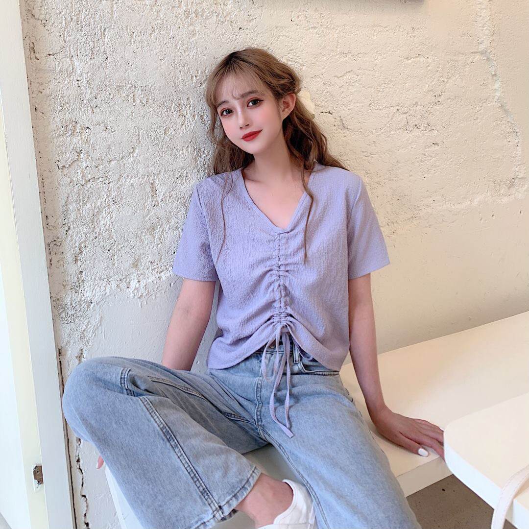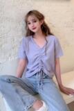 Летняя сиреневая футболка с коротким рукавом, большой размер, на шнурках, подходит для полных девушек, в корейском стиле, по фигуре