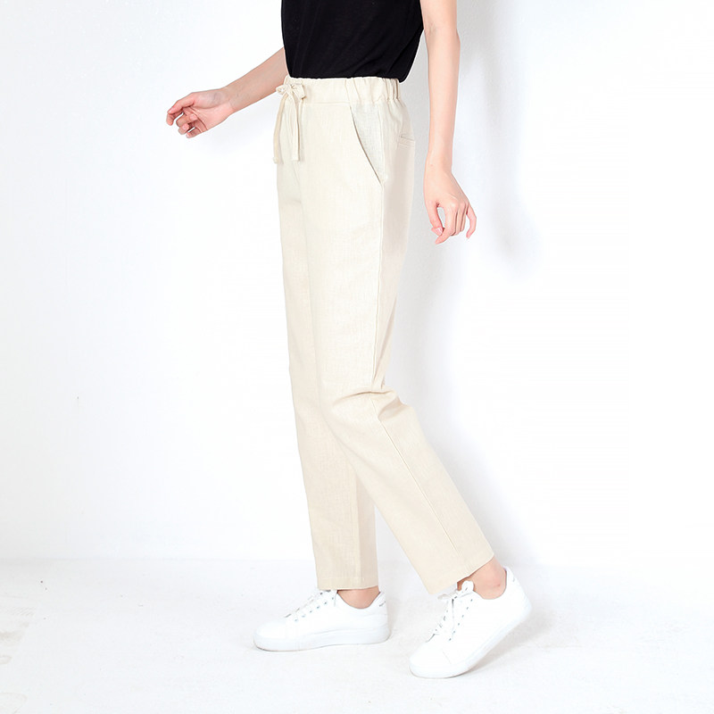Штаны, спортивная летняя одежда для отдыха, однотонный карандаш, из хлопка и льна, сезон 2021, эластичная талия