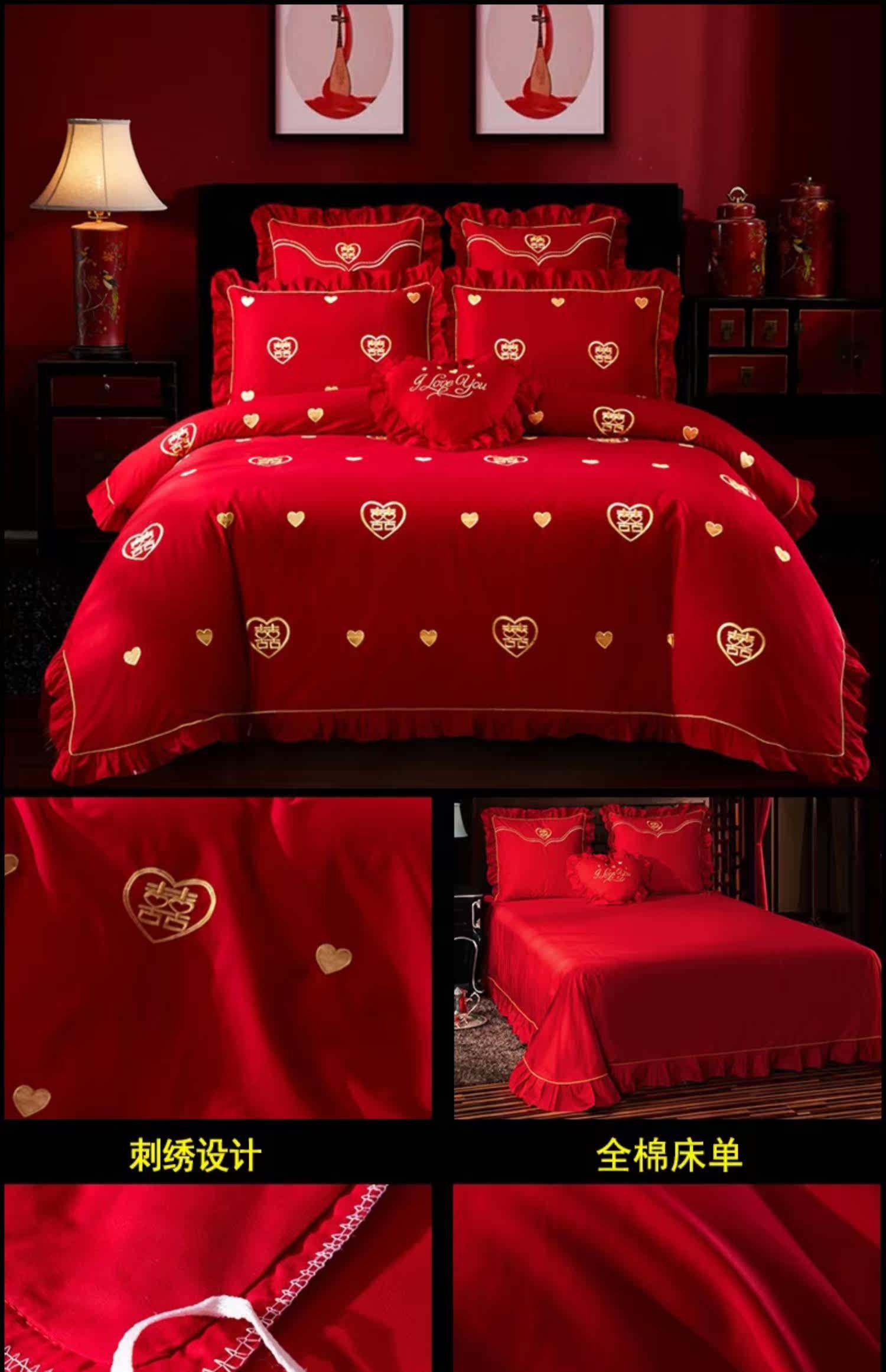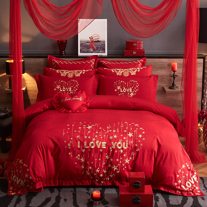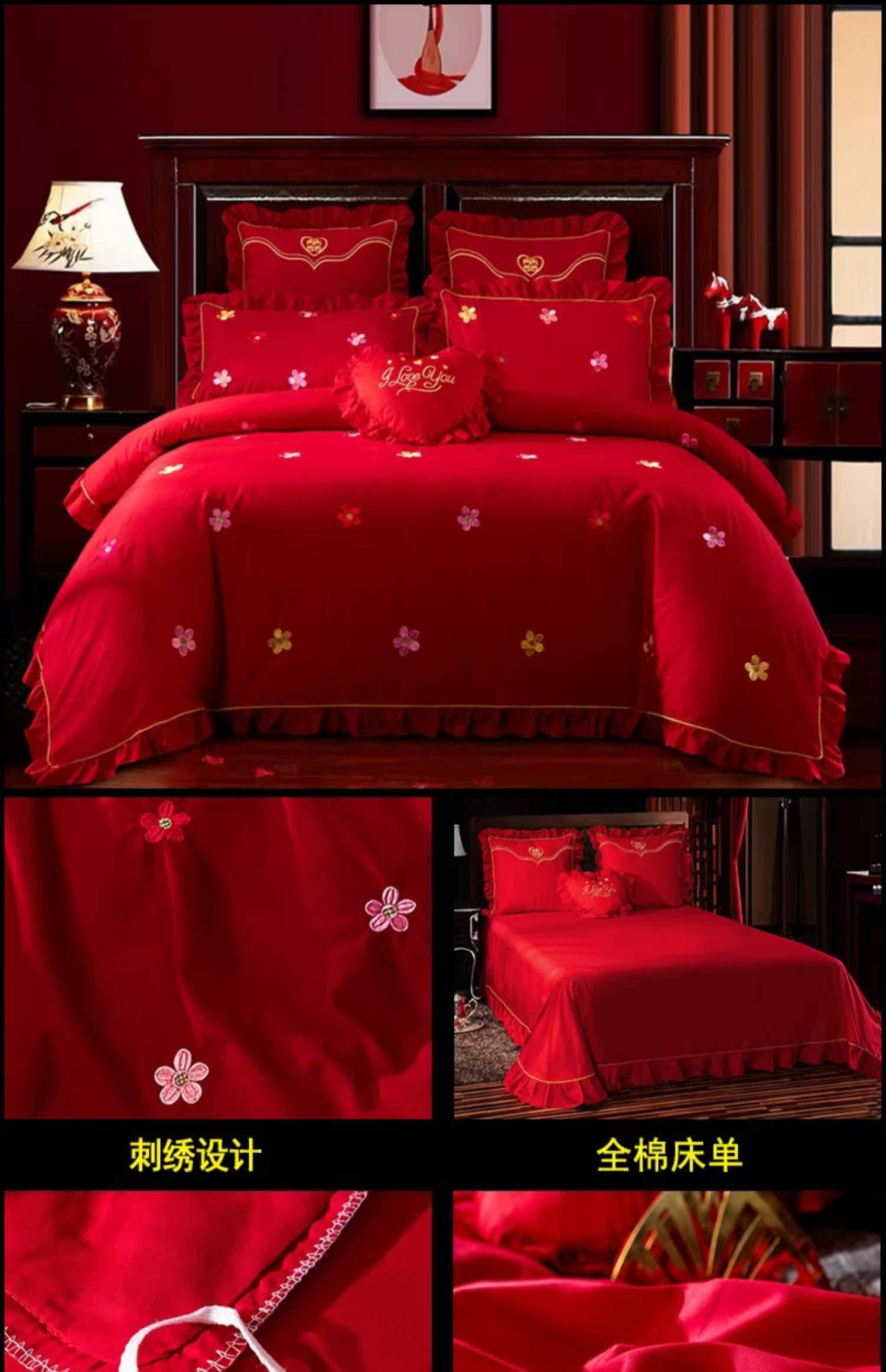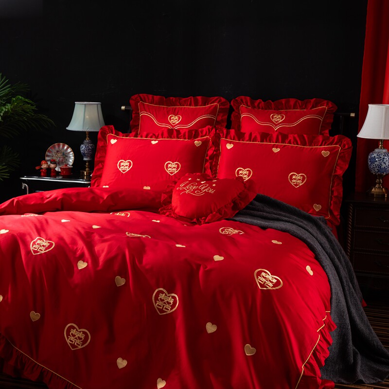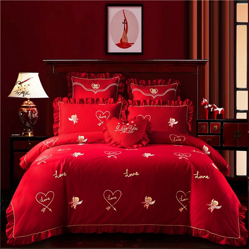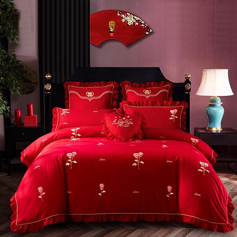 Хлопковый комплект, красная хлопковая простыня, покрывало, 4 предмета, с вышивкой