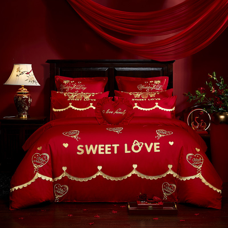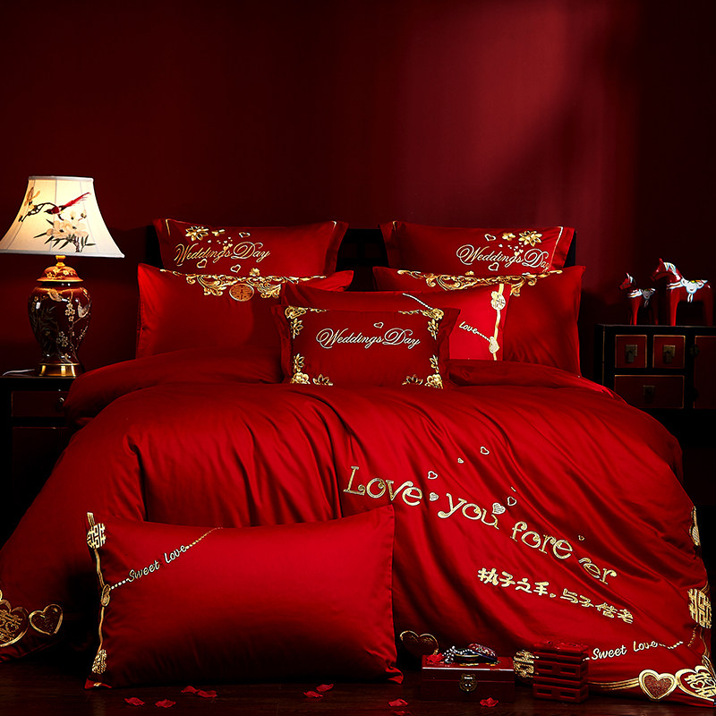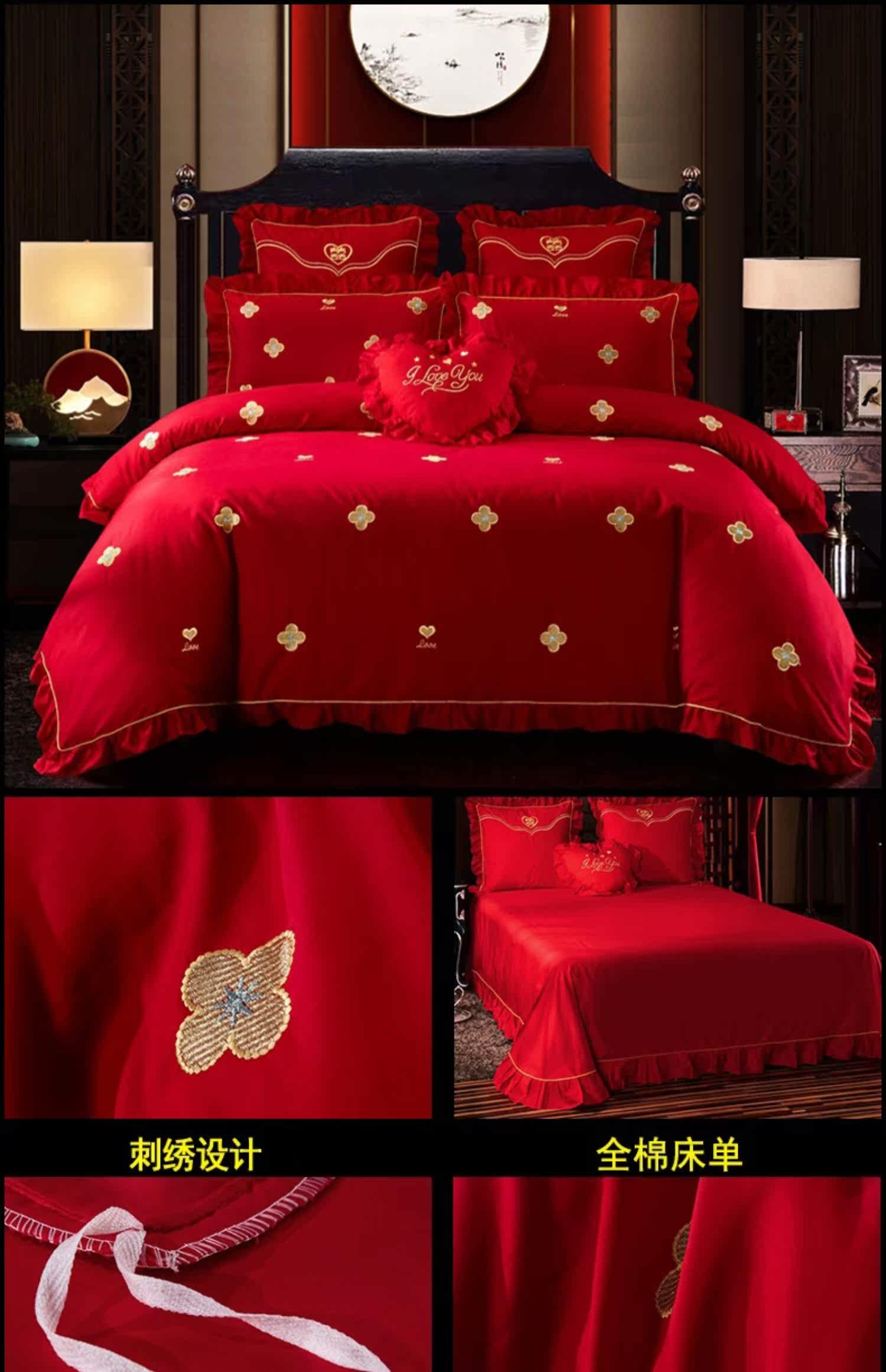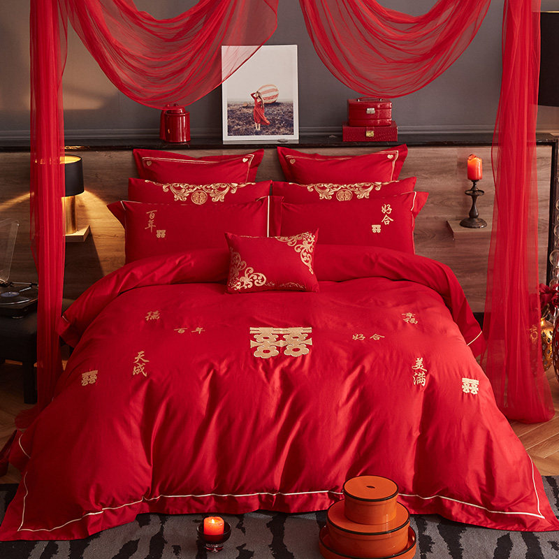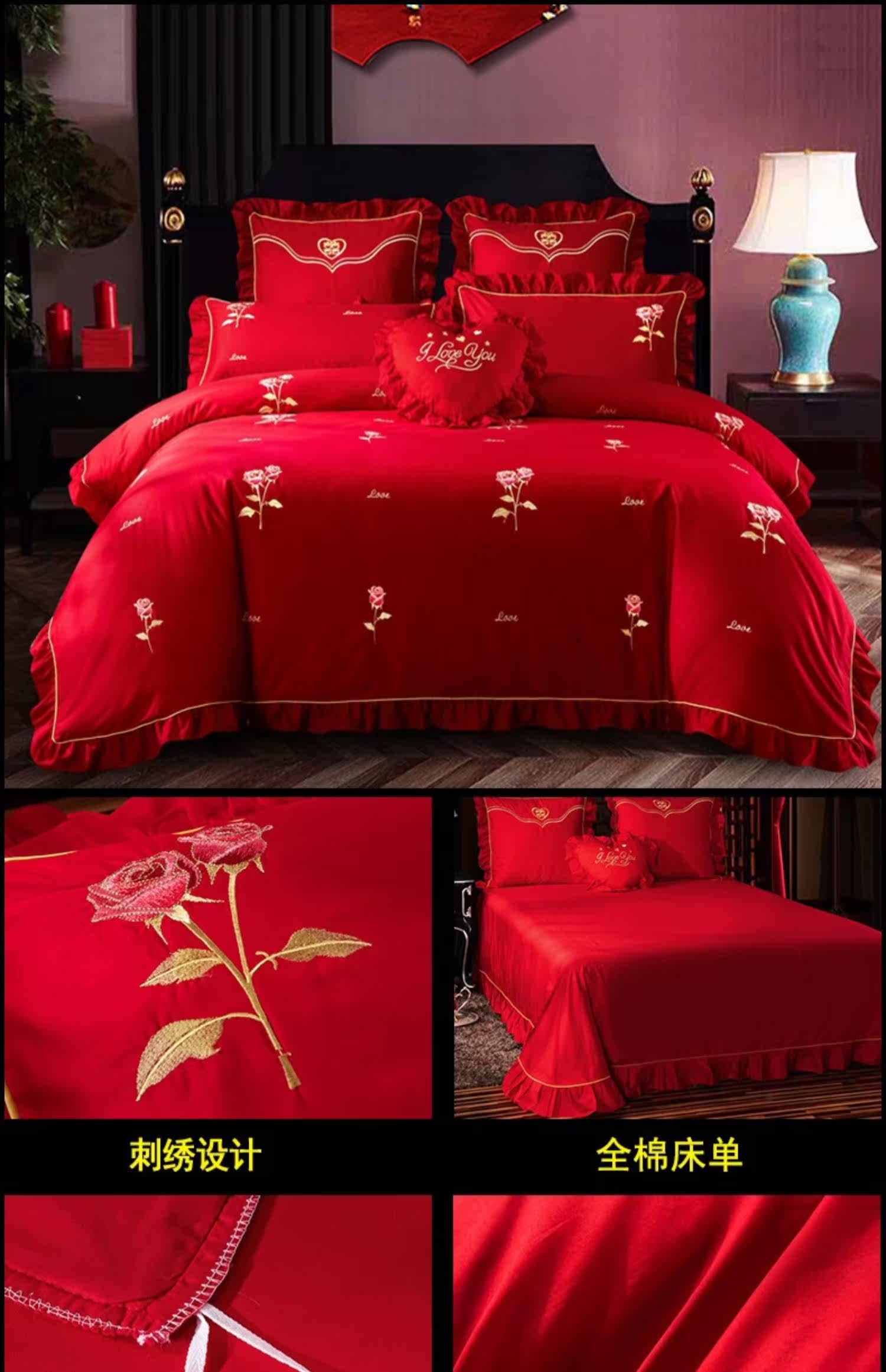 Хлопковый комплект, красная хлопковая простыня, покрывало, 4 предмета, с вышивкой