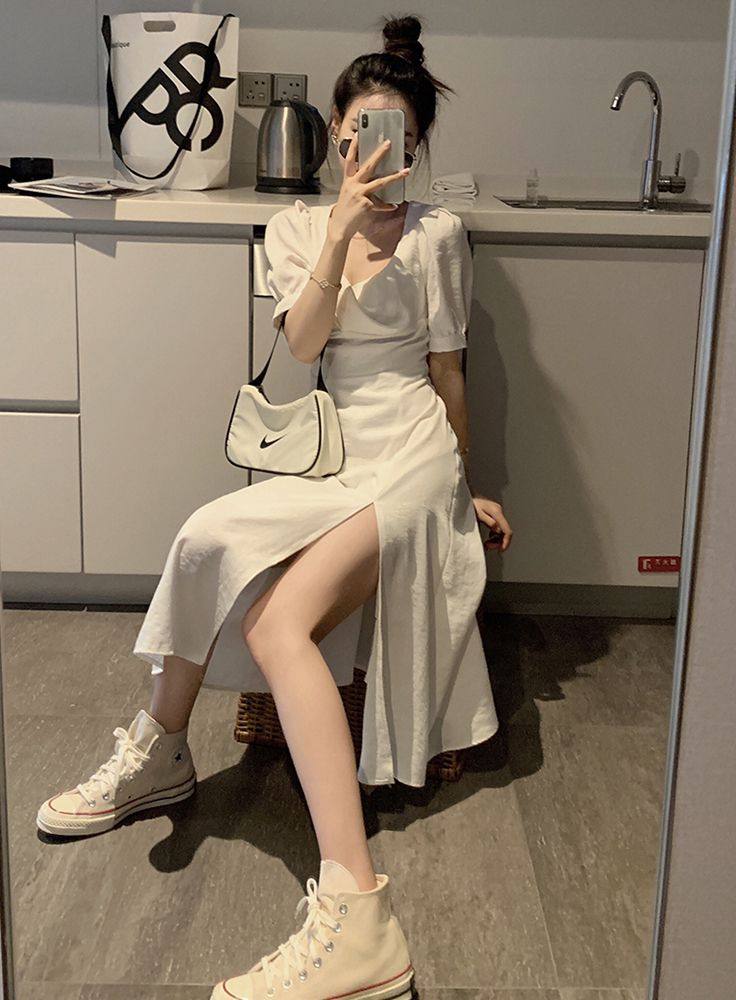 Белое летнее платье, приталенный корсет, длинная юбка, французский стиль