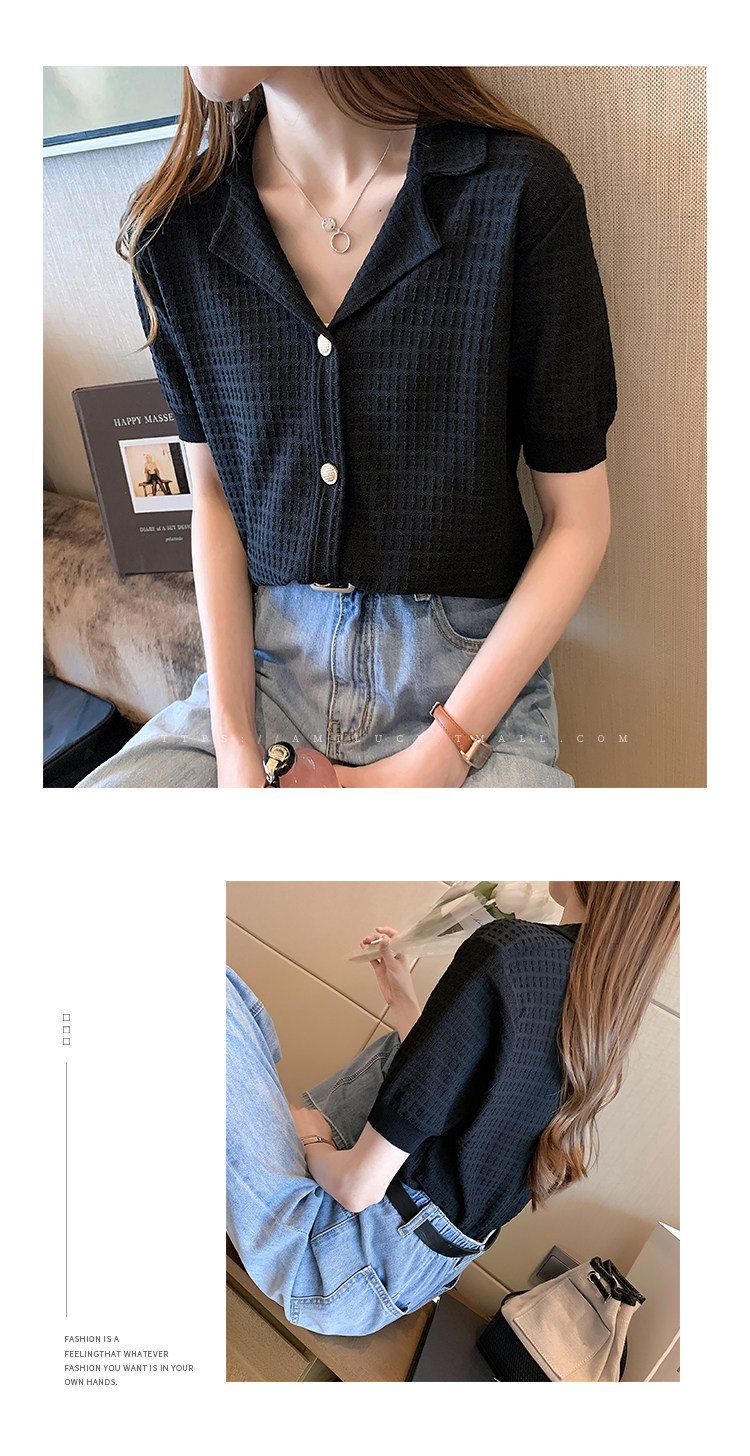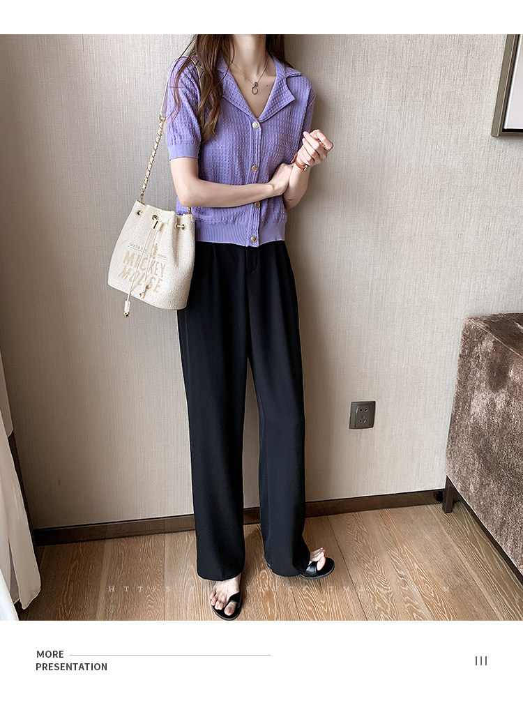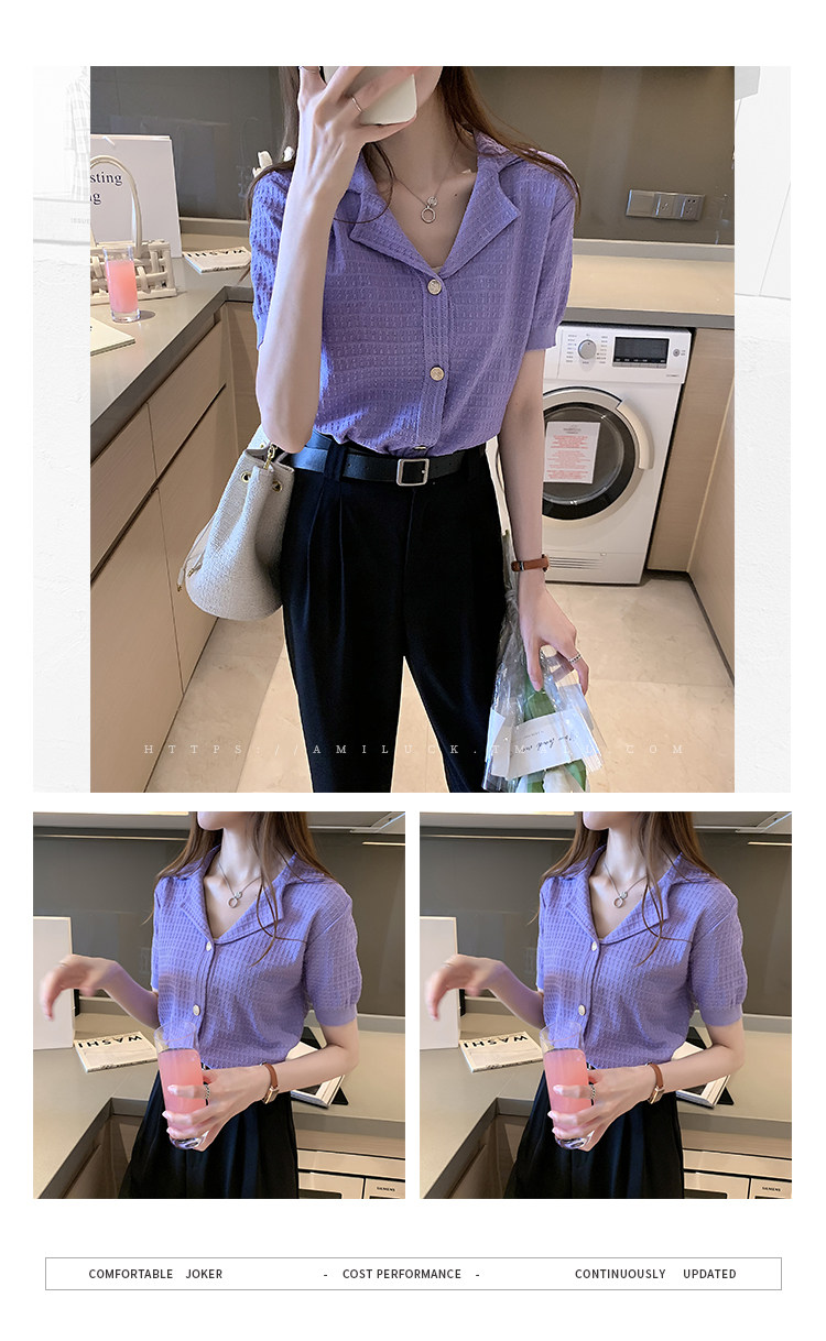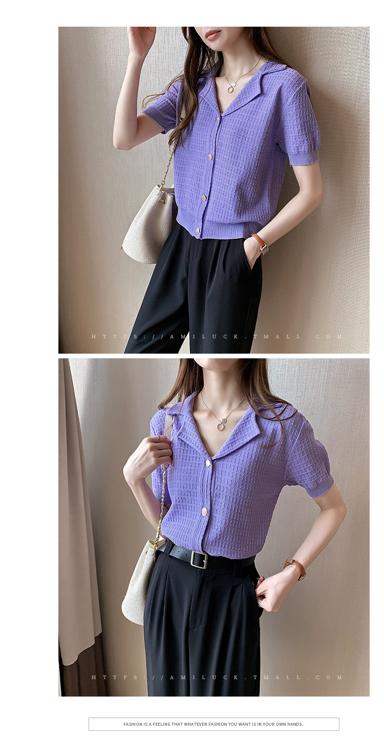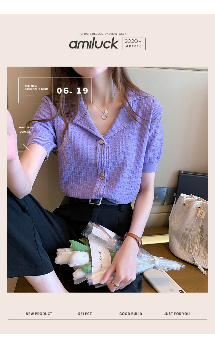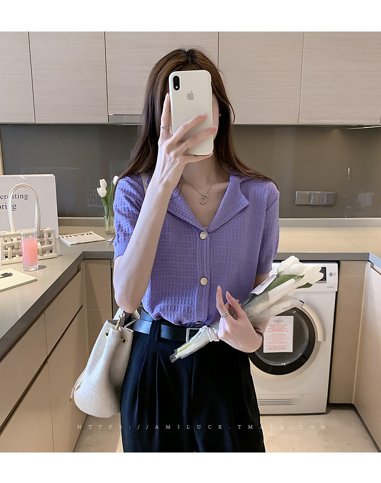 Сиреневый трикотажный летний свитер, футболка с коротким рукавом, в корейском стиле