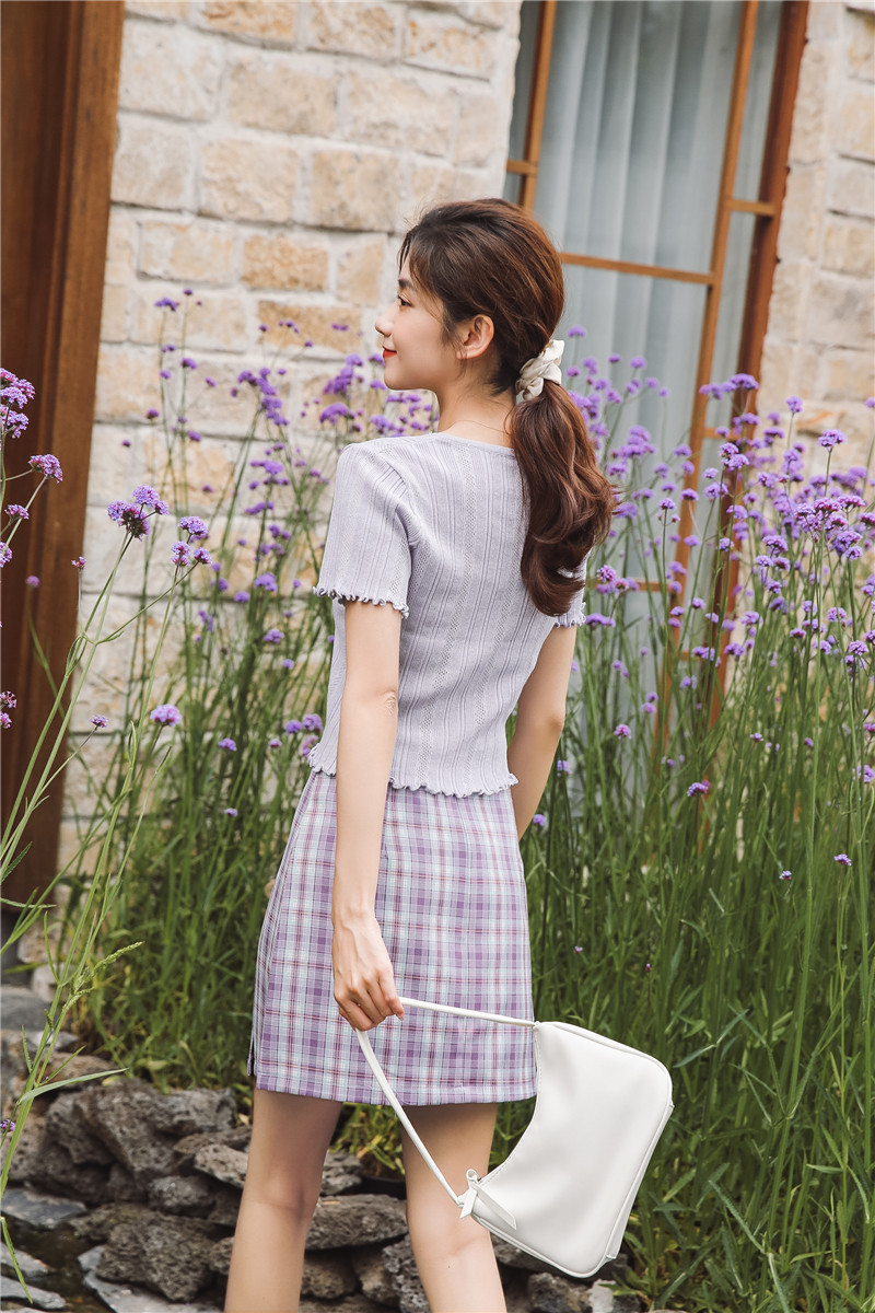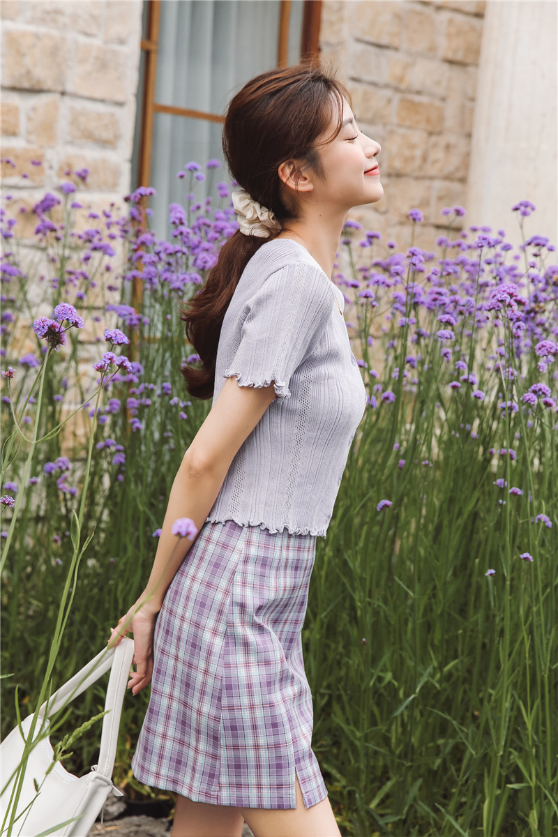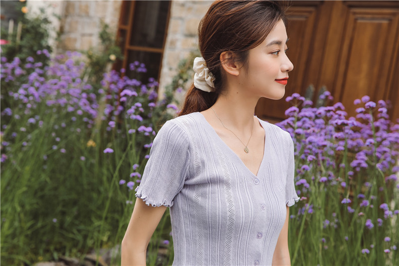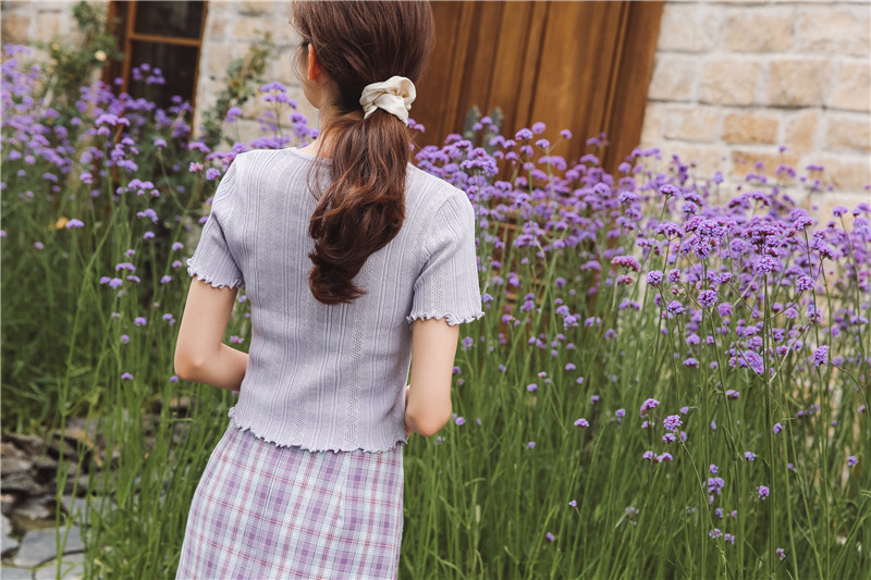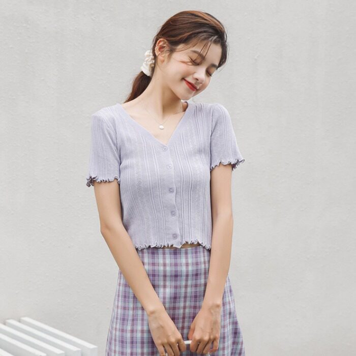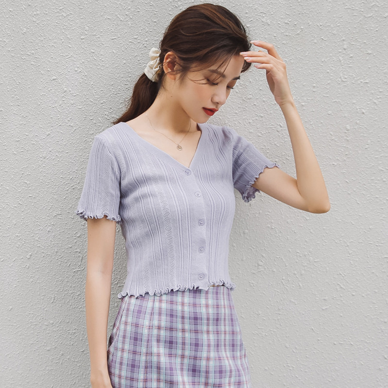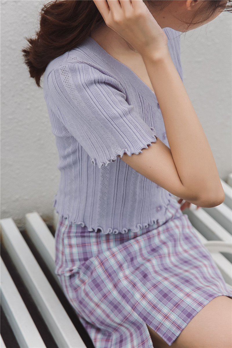 Трикотажный свежий милый сиреневый свитер, короткий рукав