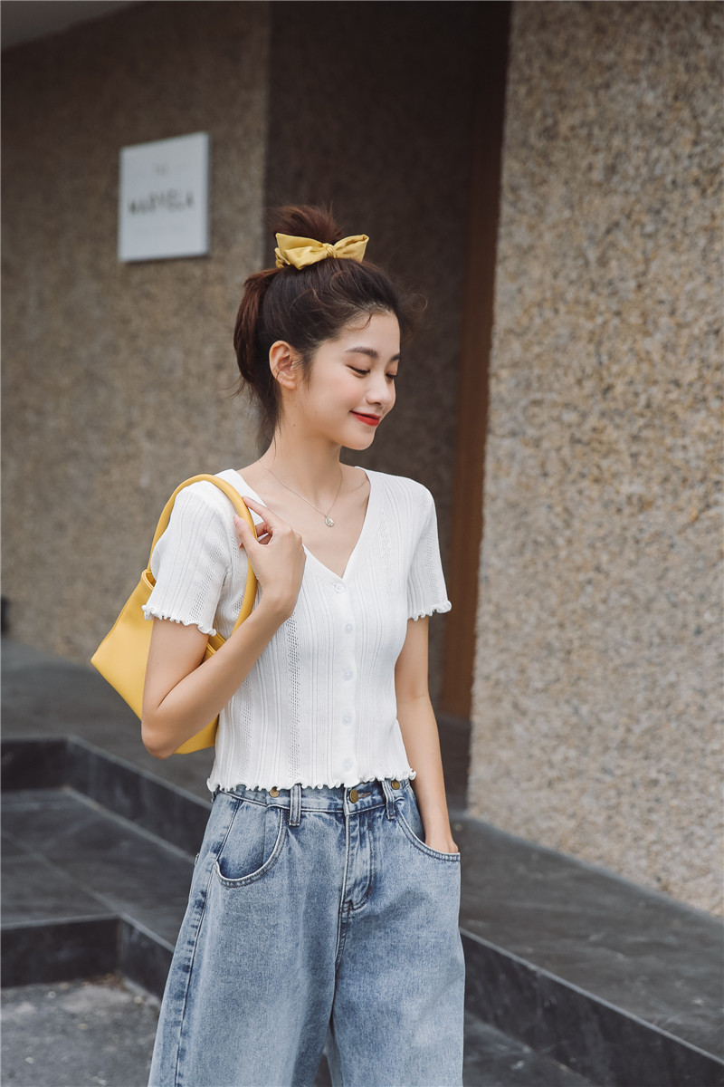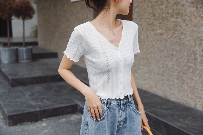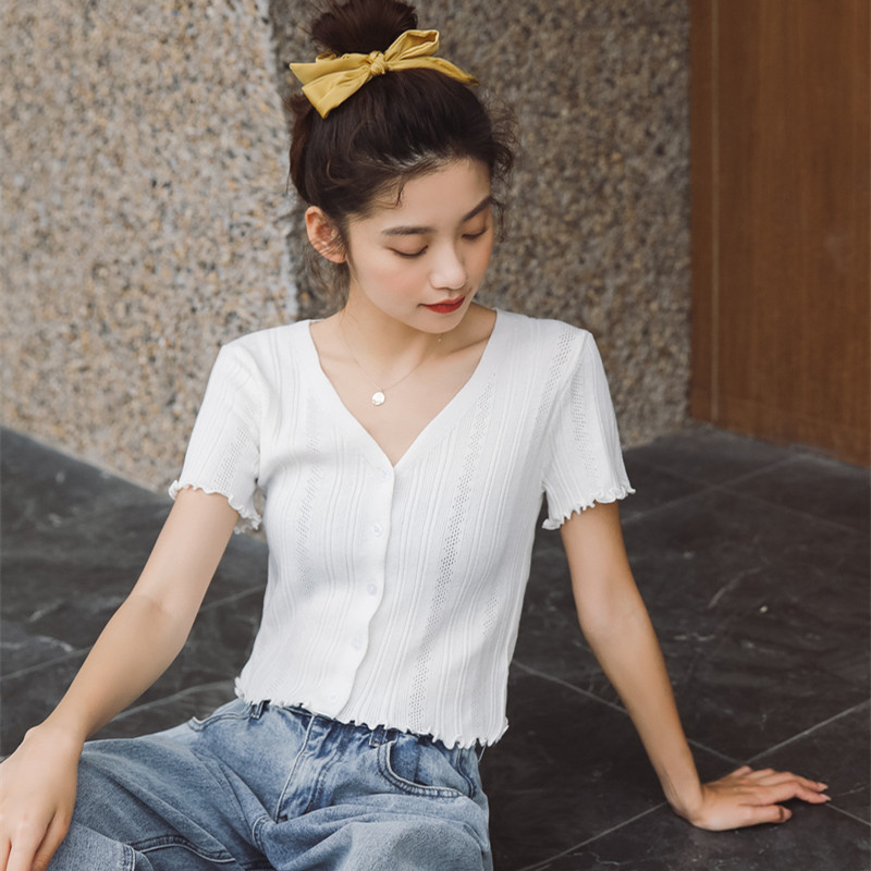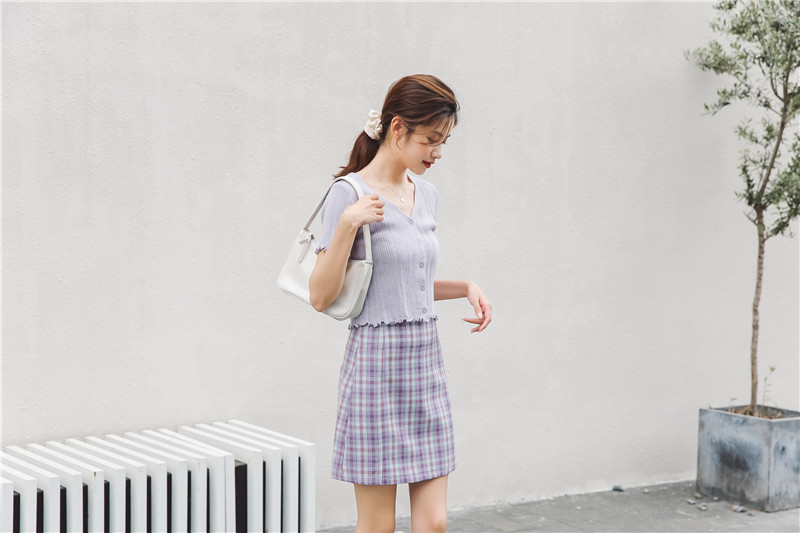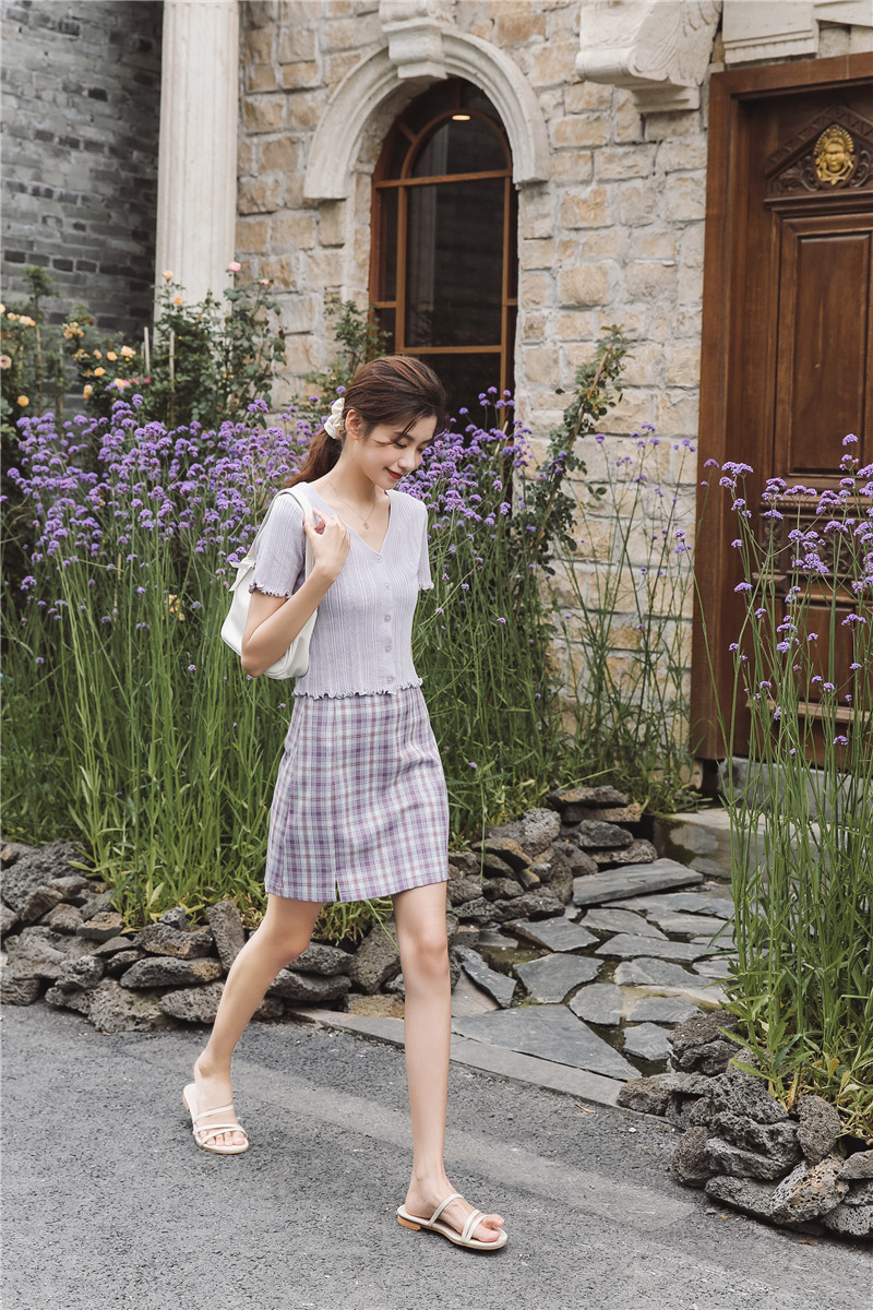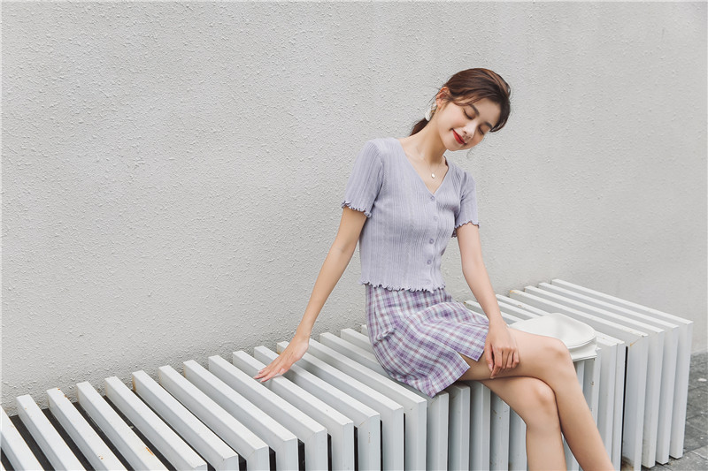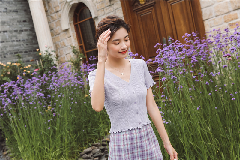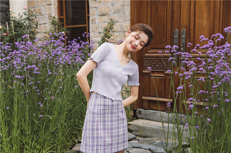 Трикотажный свежий милый сиреневый свитер, короткий рукав