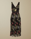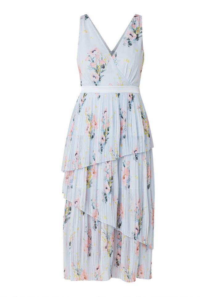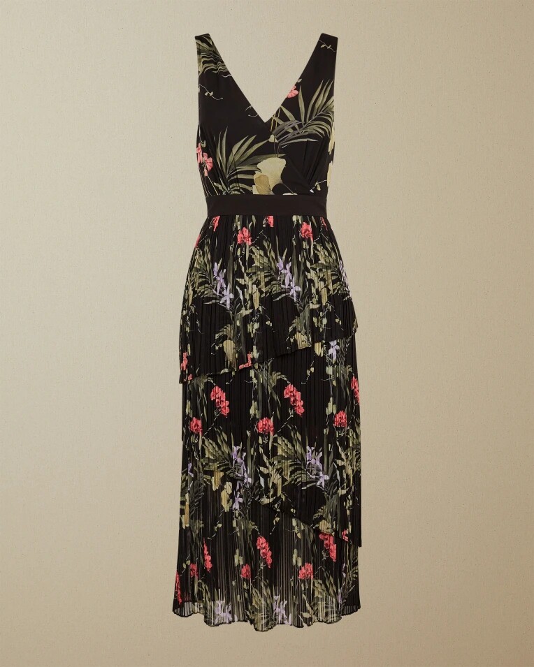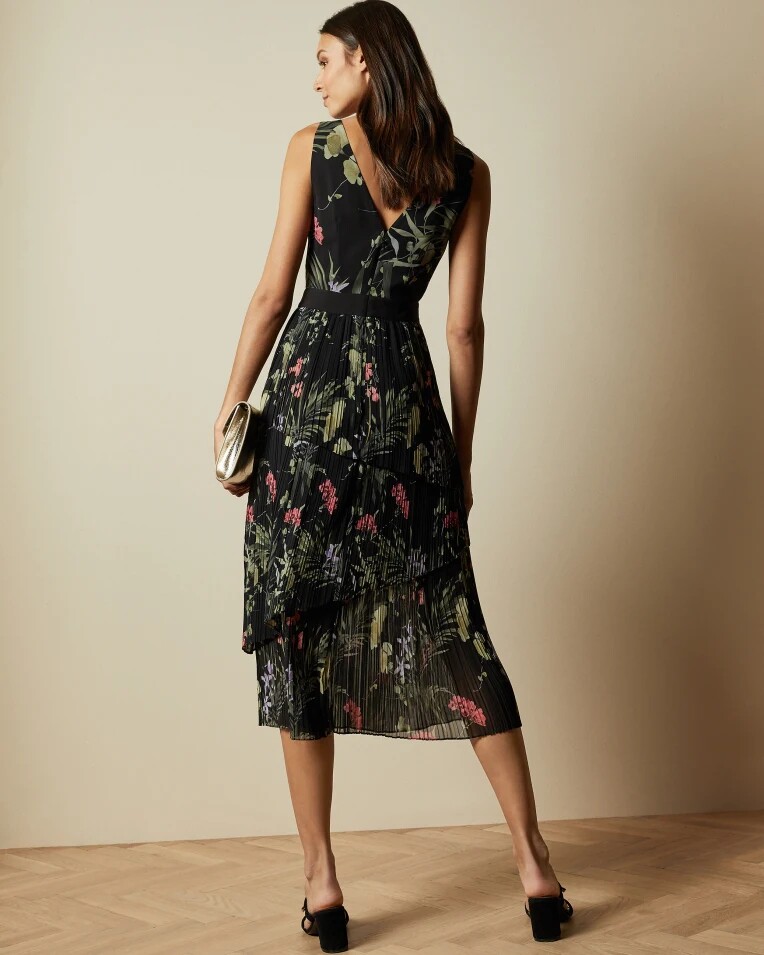 Глубокие V-образные вырезы спереди и сзади, со слоями плиссированного подола, элегантного и гибкого