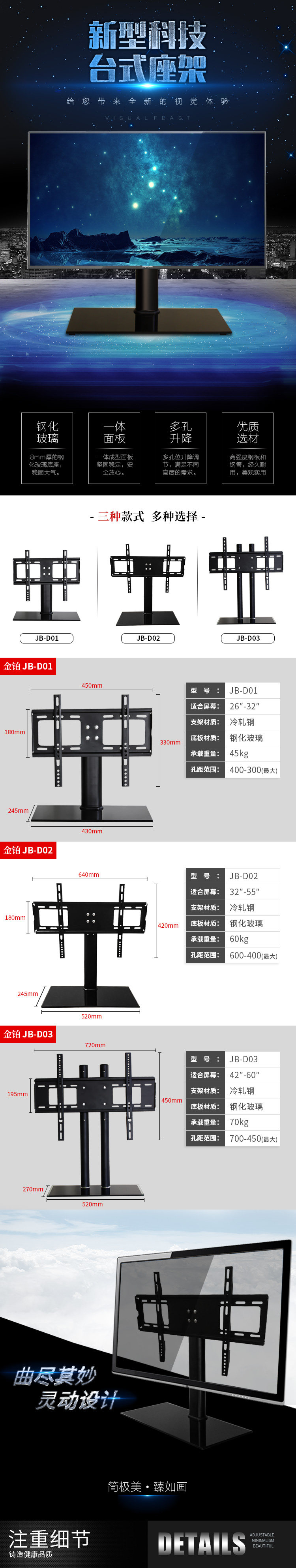| Классификация цветов: | 14-37 дюймов обычно, 37-55-дюймовая улучшенная версия, 42-70-дюймовая модель с двойным столбцом, 42-65-дюймовая модель ротации, Обновление версии нового продукта негабаритного веса |