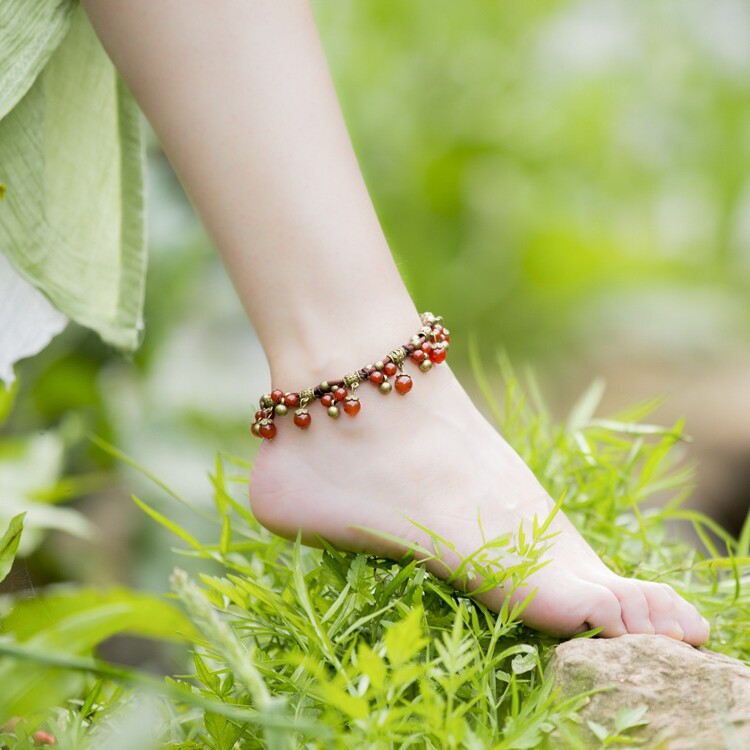 Плетеный этнический агатовый ретро браслет на ногу ручной работы с кисточками, колокольчик, подвеска, этнический стиль, стиль бохо
