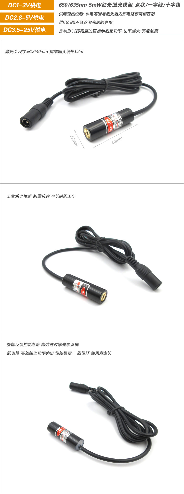 | FU650X5-FBD12 | 650nm/5mW | DC3.5-25V (Типичное значение 6 В 9V 12V 24 В) | |