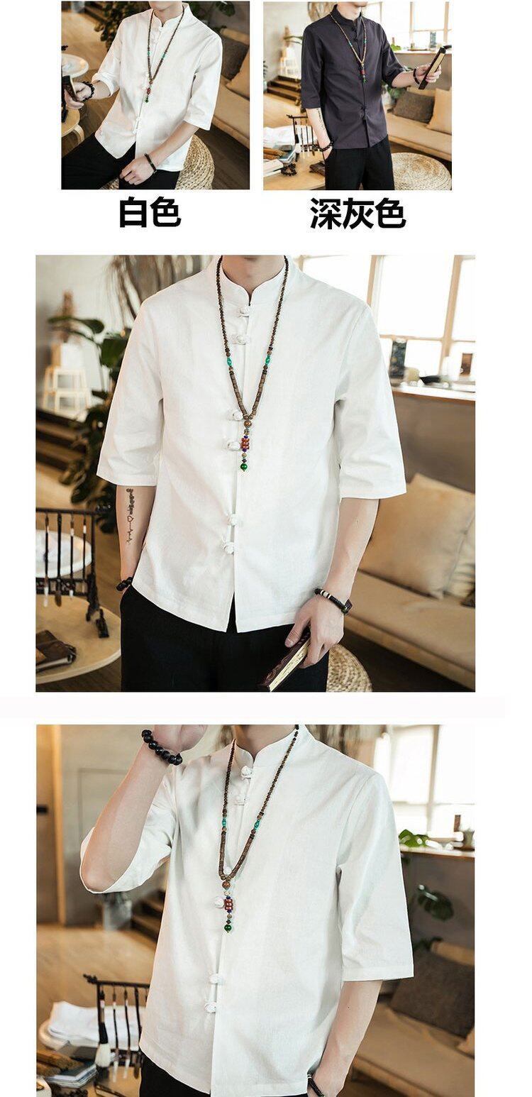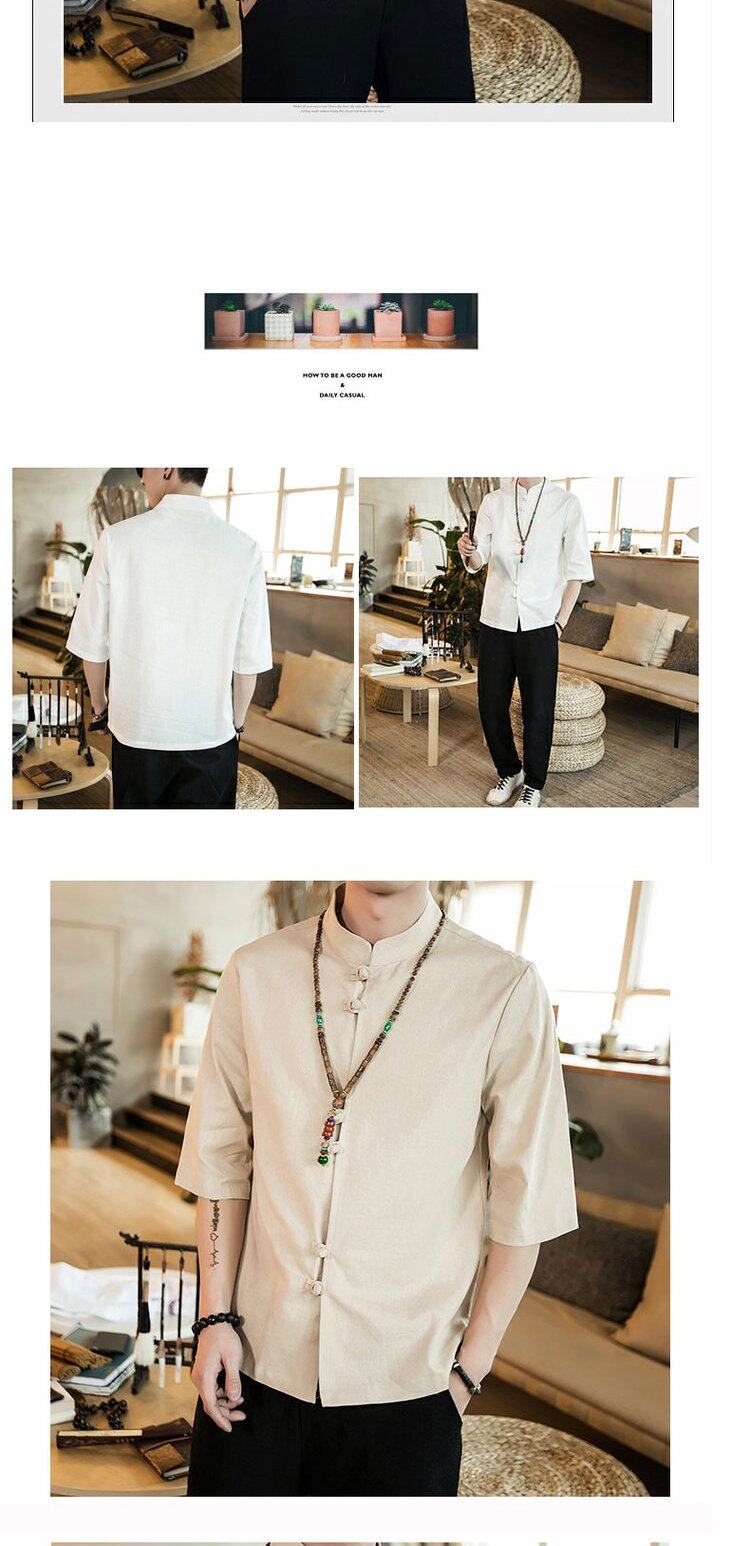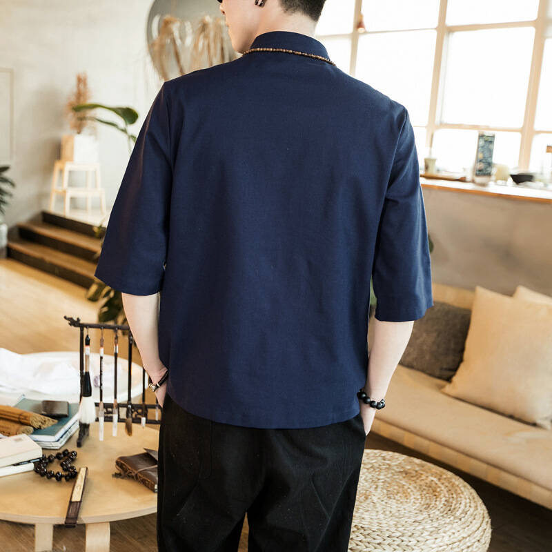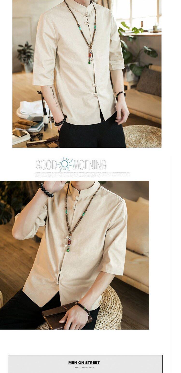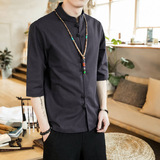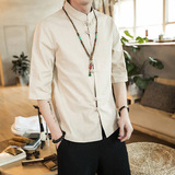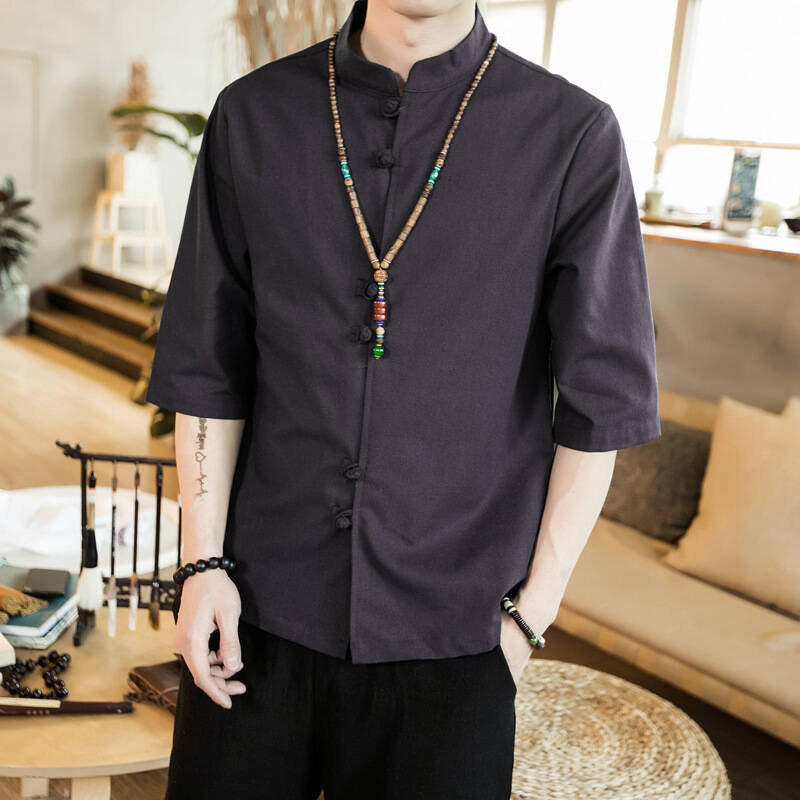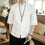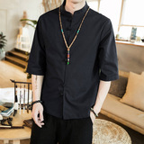 Ретро рубашка, свободный крой, из хлопка и льна, китайский стиль, короткий рукав