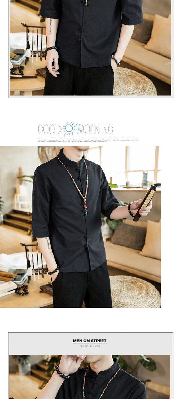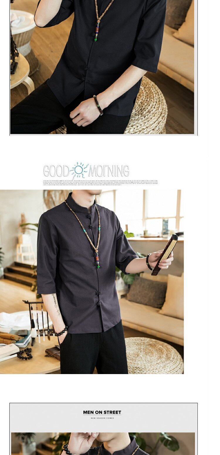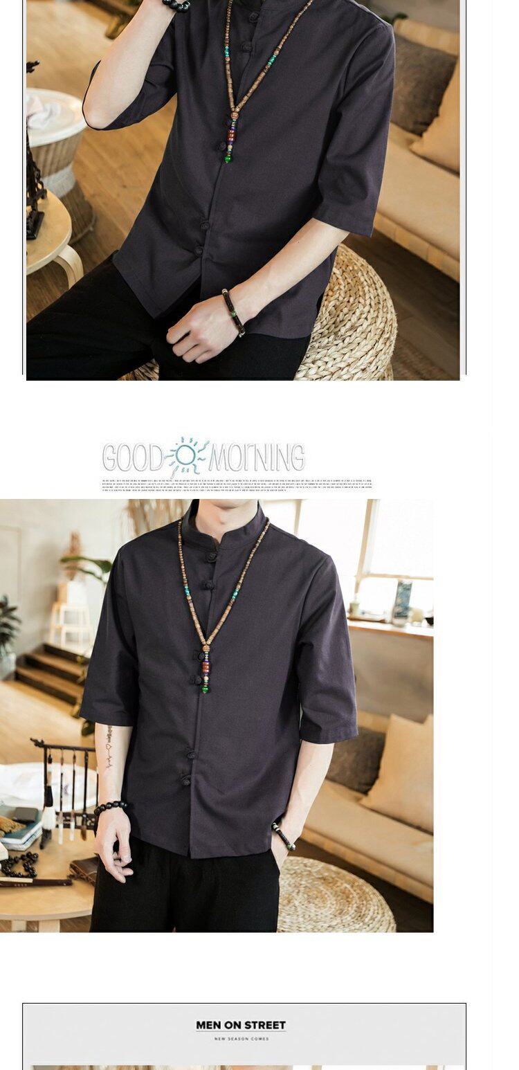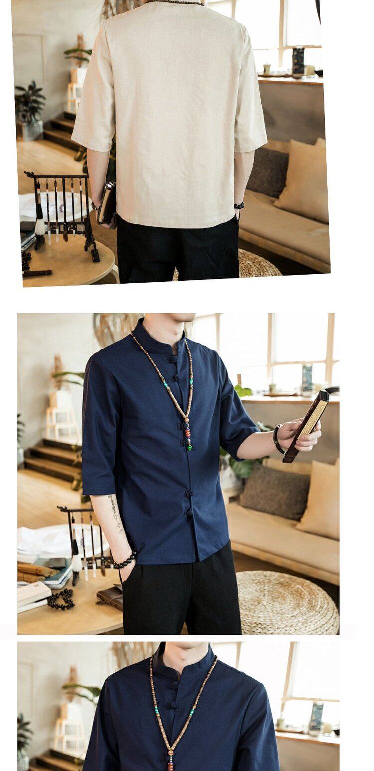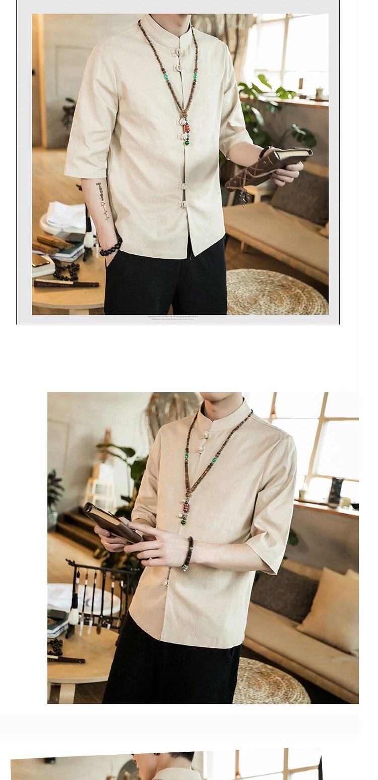 Ретро рубашка, свободный крой, из хлопка и льна, китайский стиль, короткий рукав