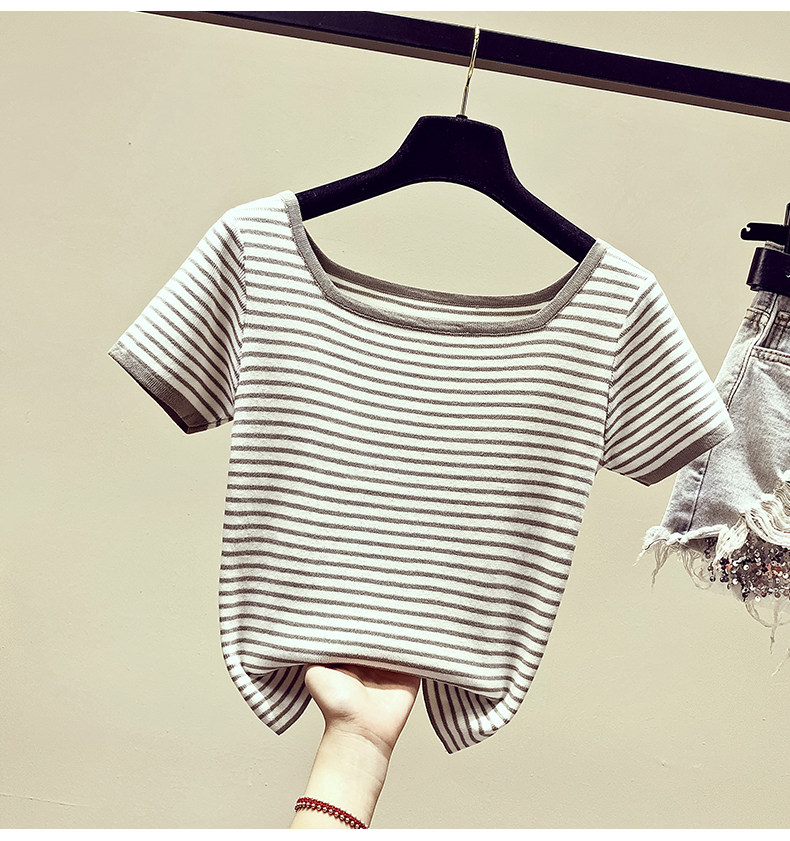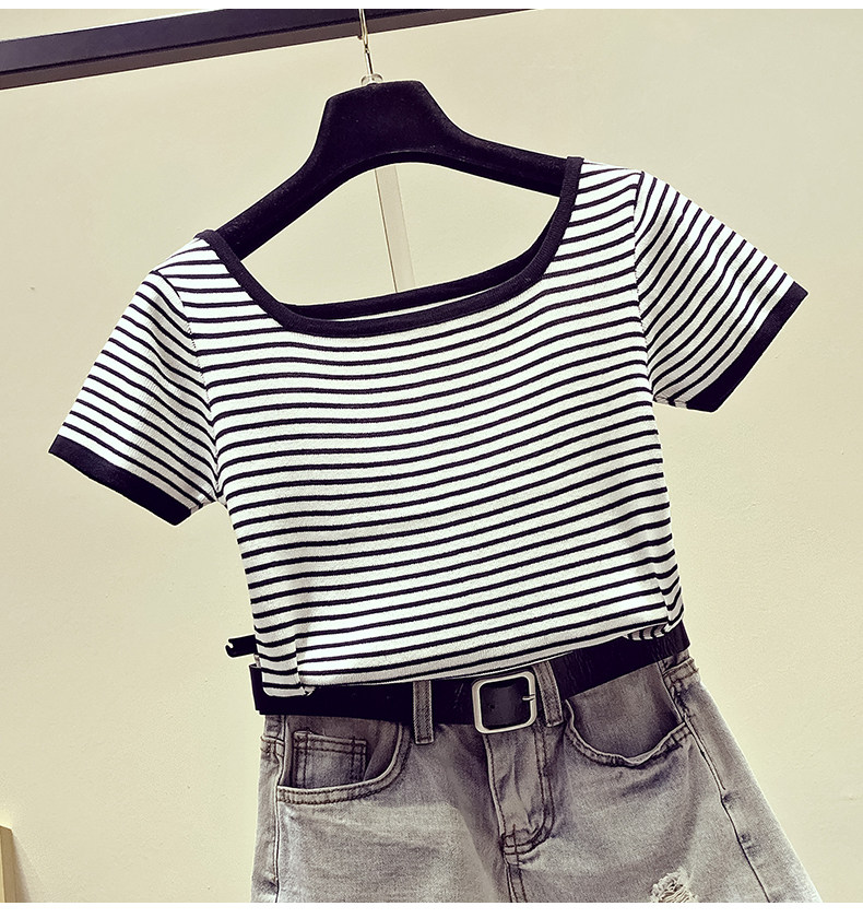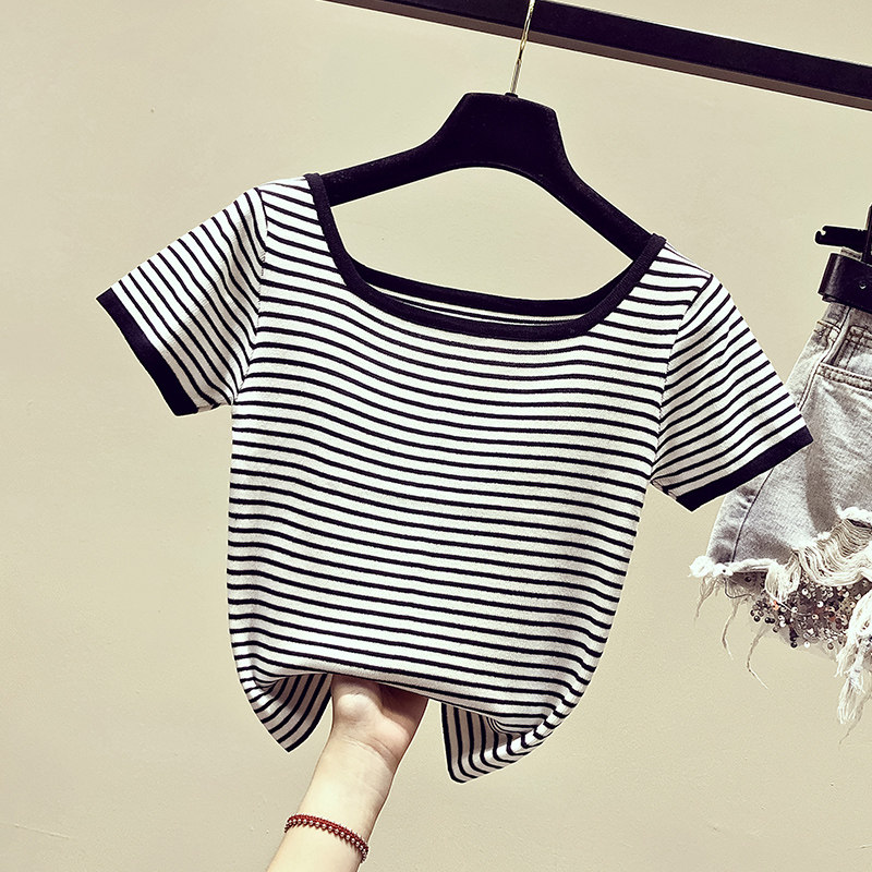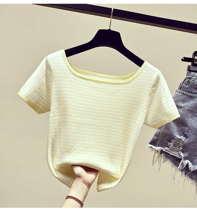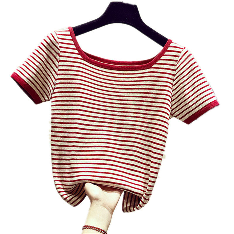 Летняя приталенная трикотажная короткая футболка с коротким рукавом, коллекция 2021, в корейском стиле, открытые плечи
