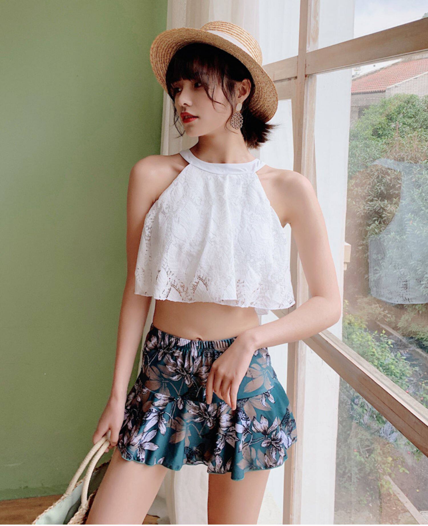 Купальник, мини-юбка, юбка, штаны, белая малахитовая зелёная пищевая добавка с железом, высокая талия, цветочный принт