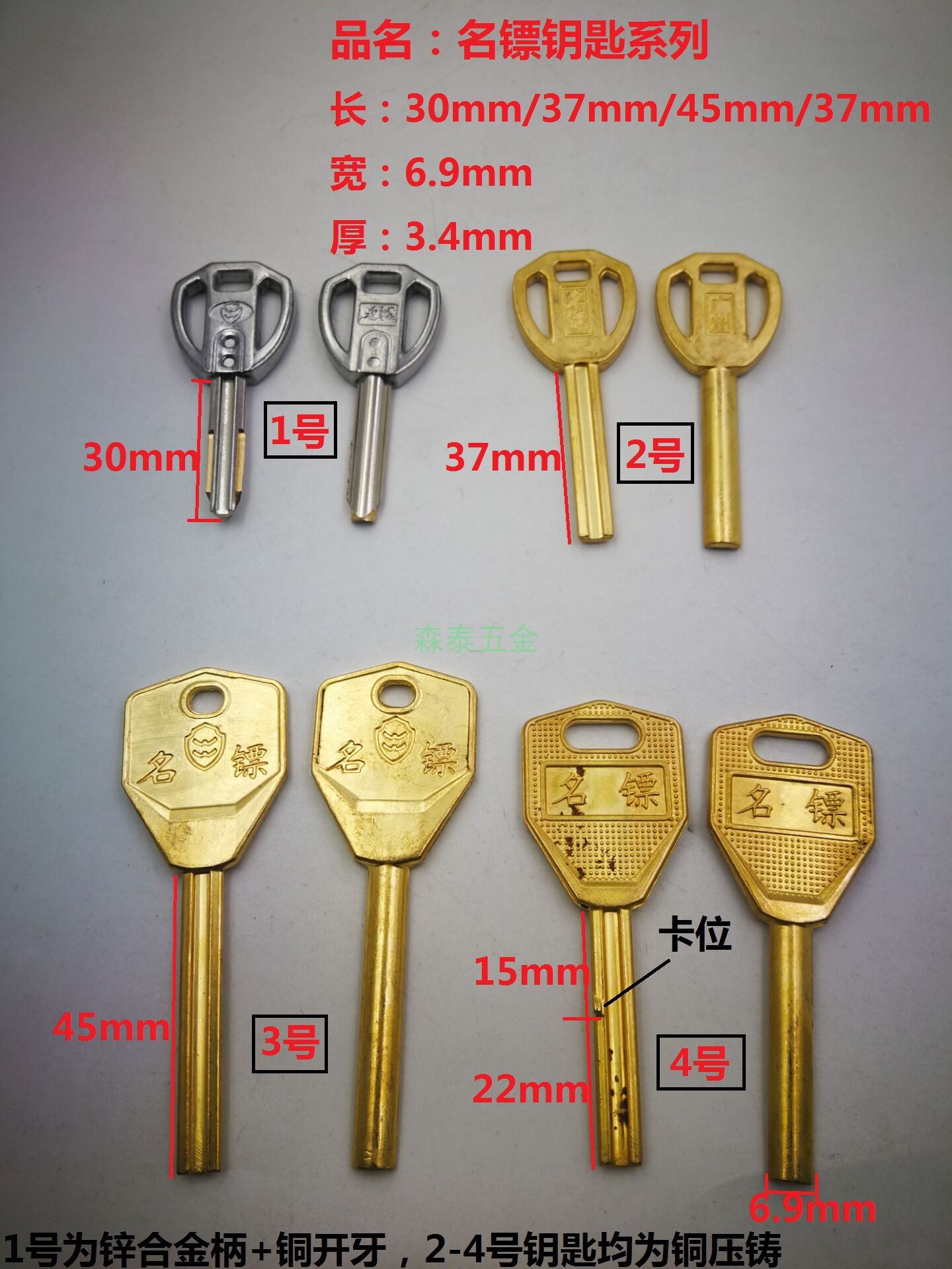 [适用长名镖 钥匙坯 全铜半圆金刚 中短款 空转防盗门锁芯钥匙料]