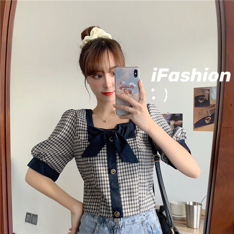 Ретро короткая рубашка, большой размер, короткий рукав, подходит для полных девушек, по фигуре, квадратный вырез