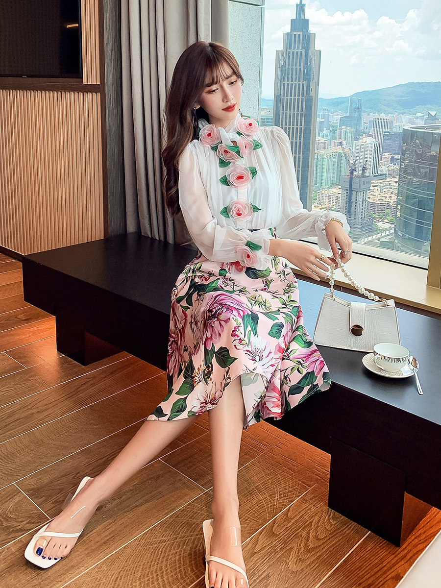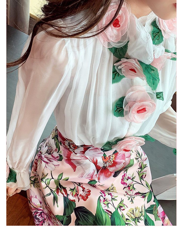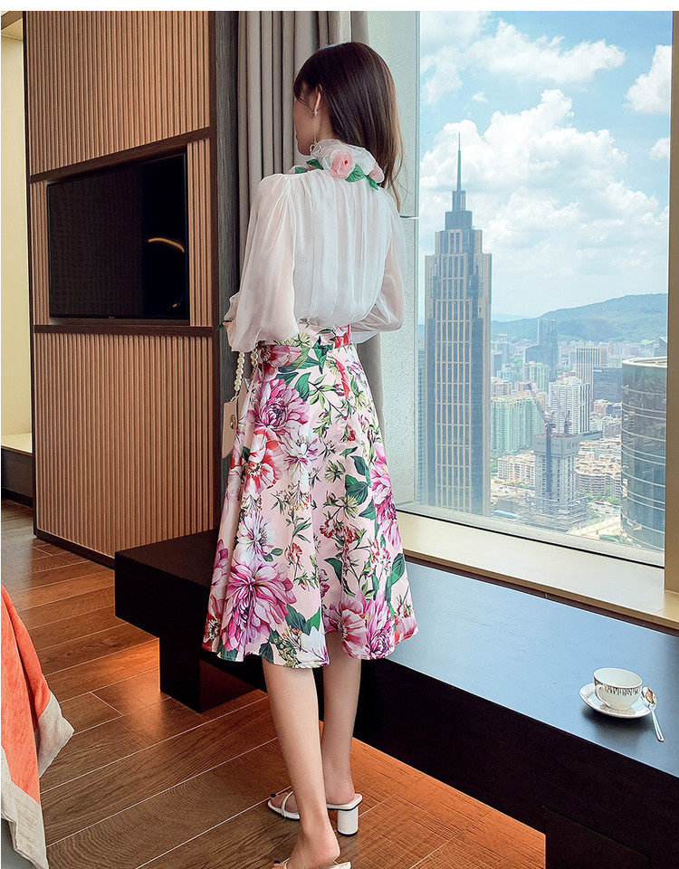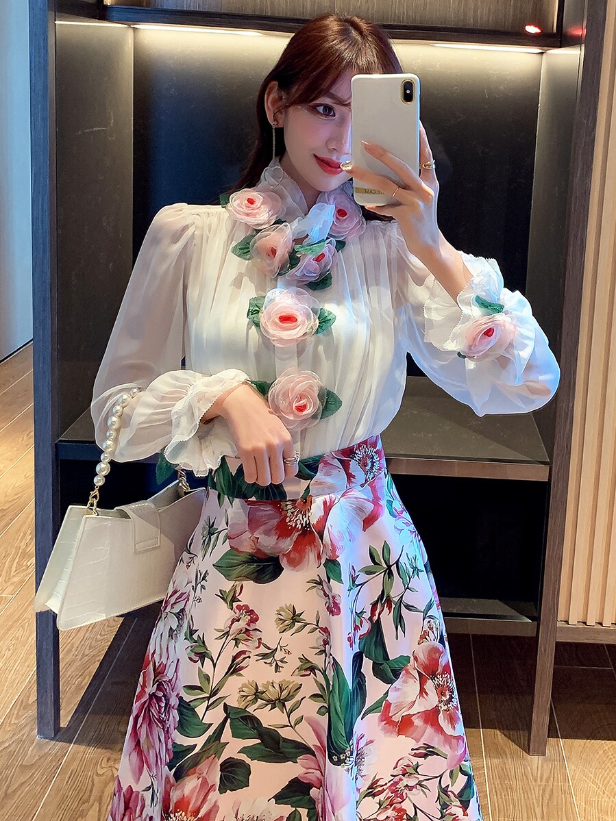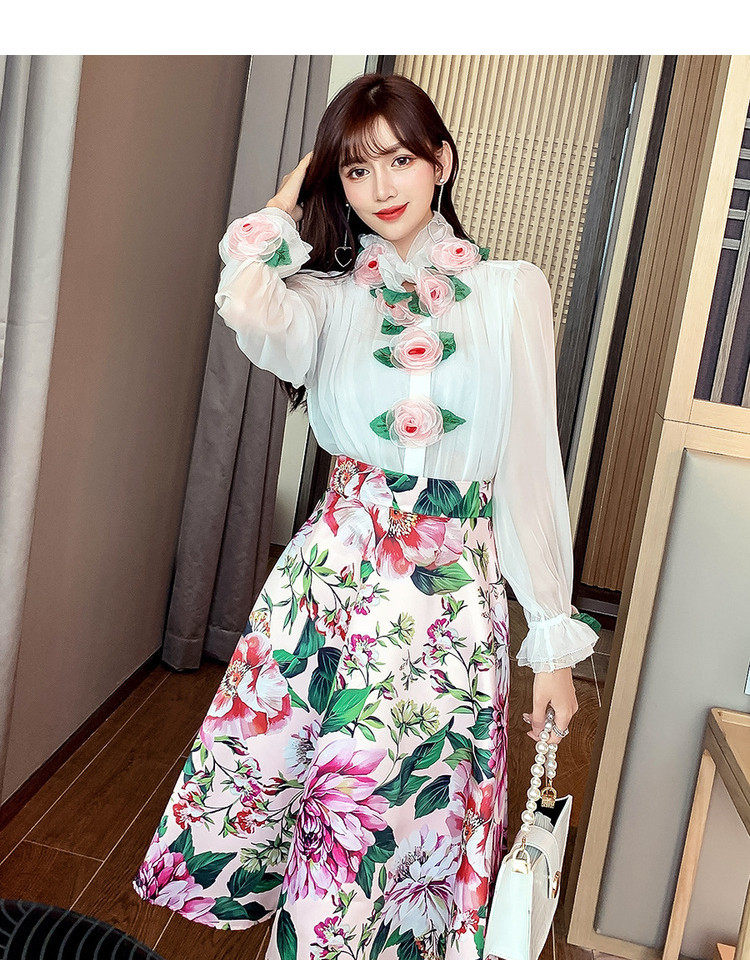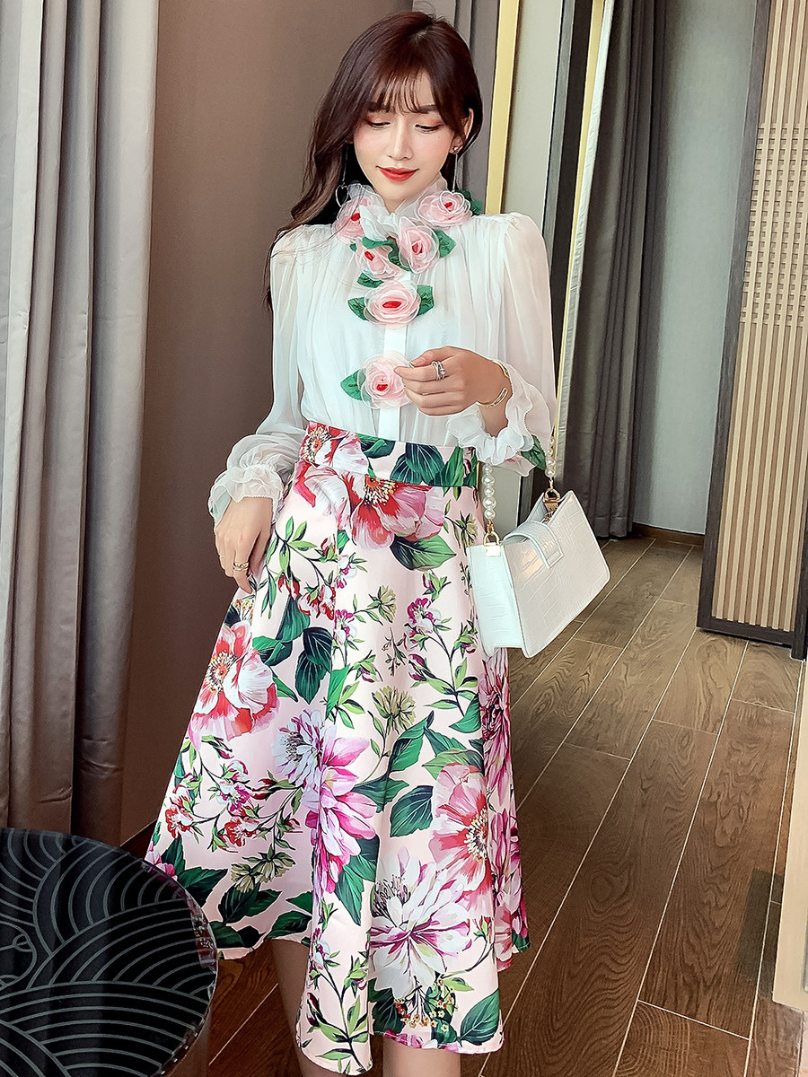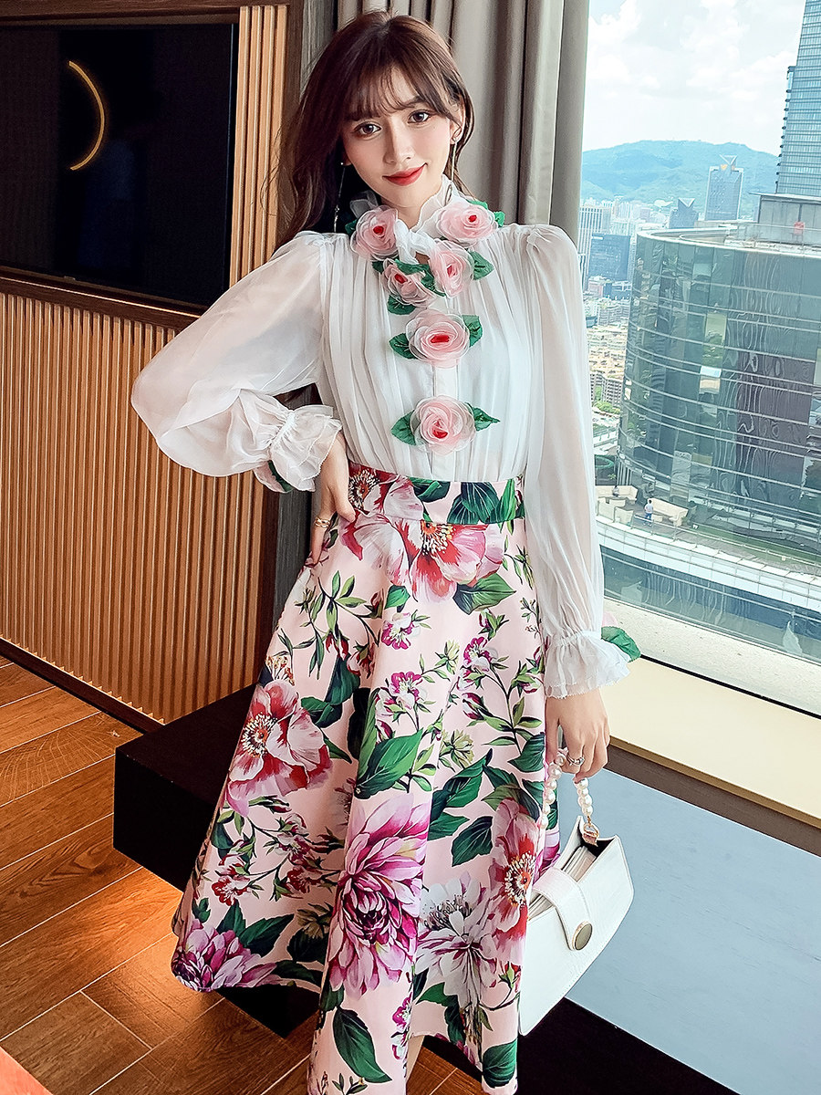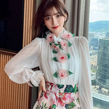 Рубашка, белый фонарь, шелковый лонгслив, комплект, в стиле Шанель, изысканный стиль, яркий броский стиль, в западном стиле, розы, в цветочек