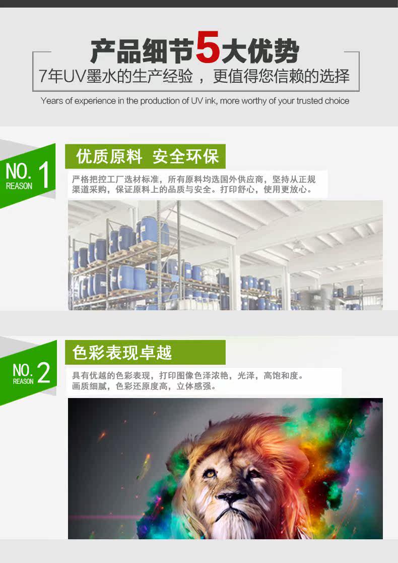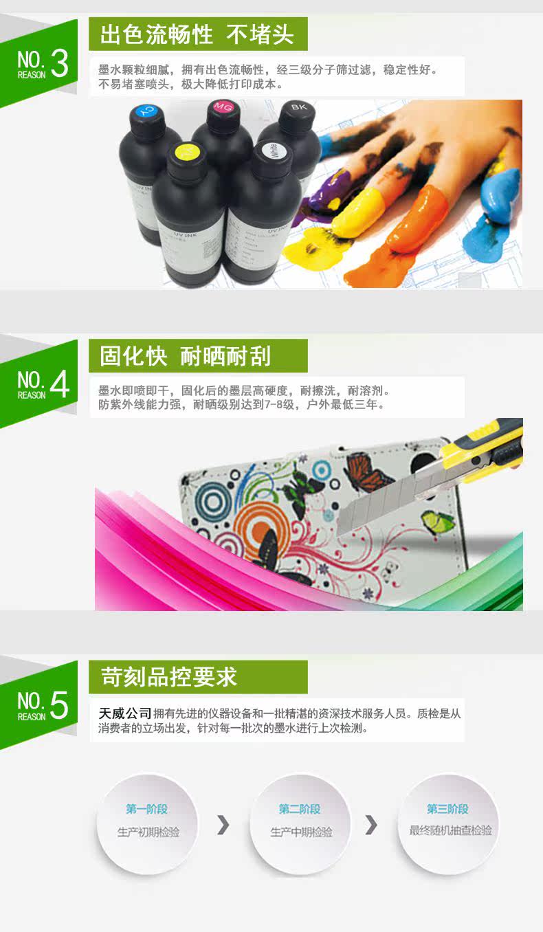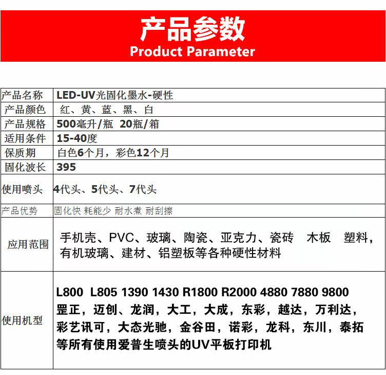 Подходит для широких материалов: УФ -чернила подходят для печати металлических металлических пластин, стекла, керамики, деревянных досок, пола, обоев, ПК, ПВХ, пресса и других материалов.Он был успешно применен к струйной машине из УФ -таблички, такой как Konica 512, Seiko, Toshiba, Spectra, Epson Led Led Cold Light Source.