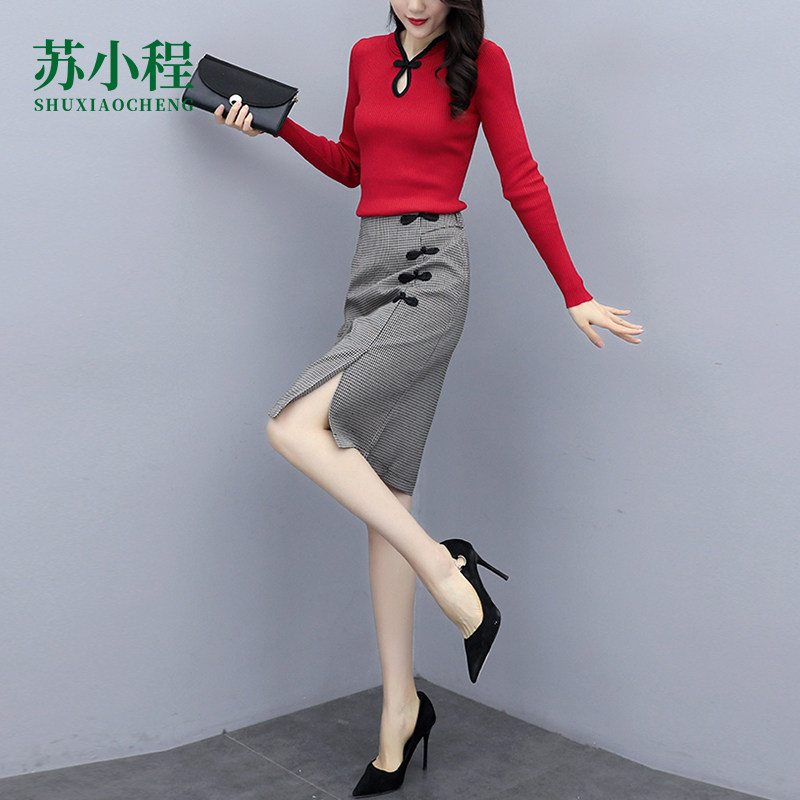 Комплект, осенняя юбка, платье, 2020, в западном стиле, высокая талия, китайский стиль