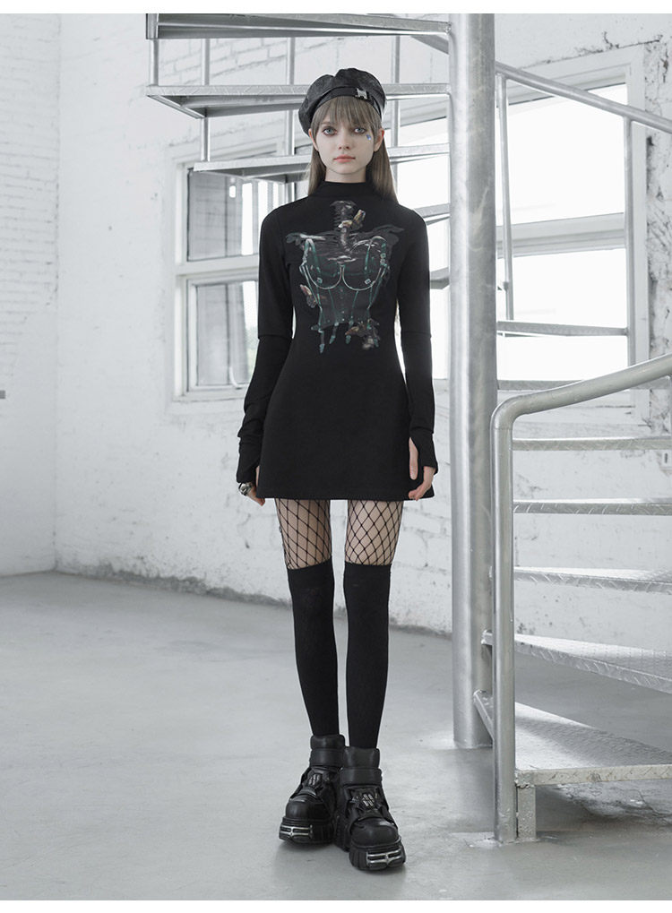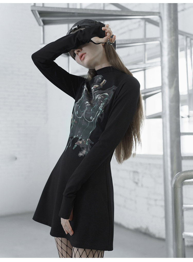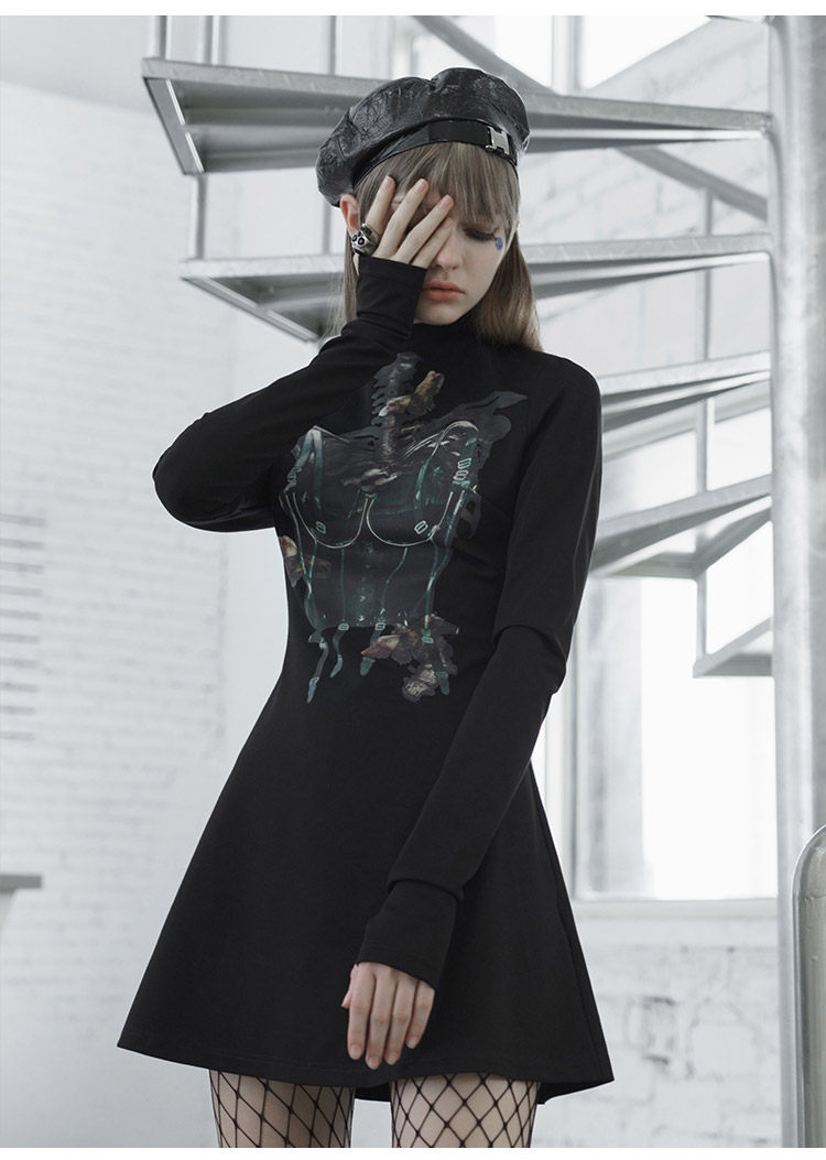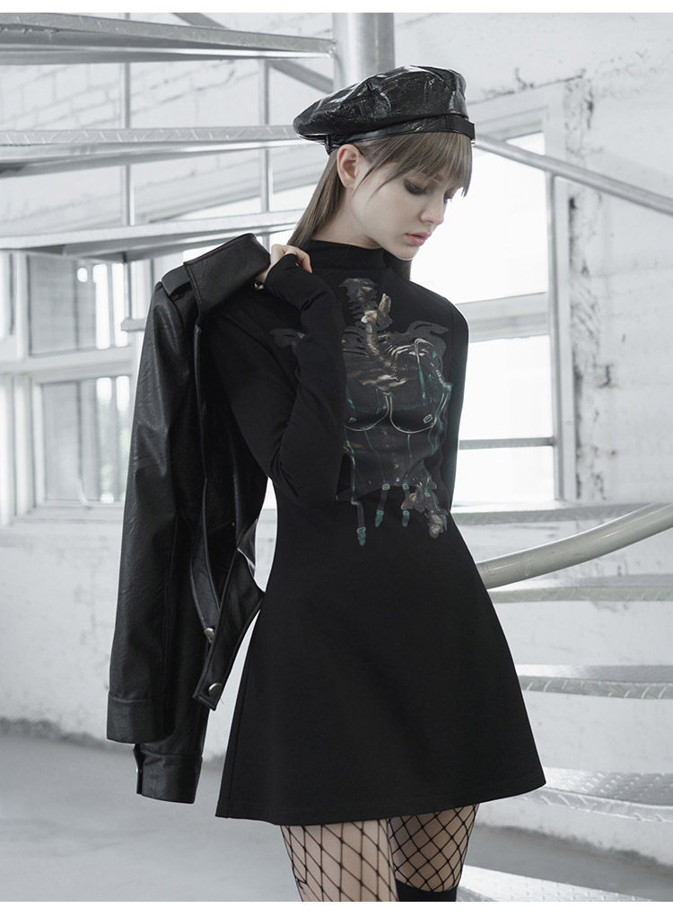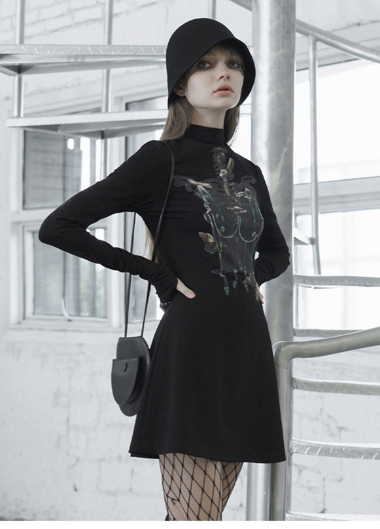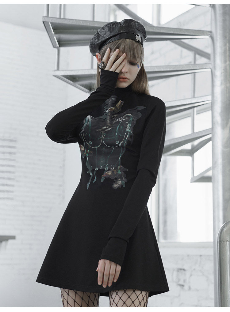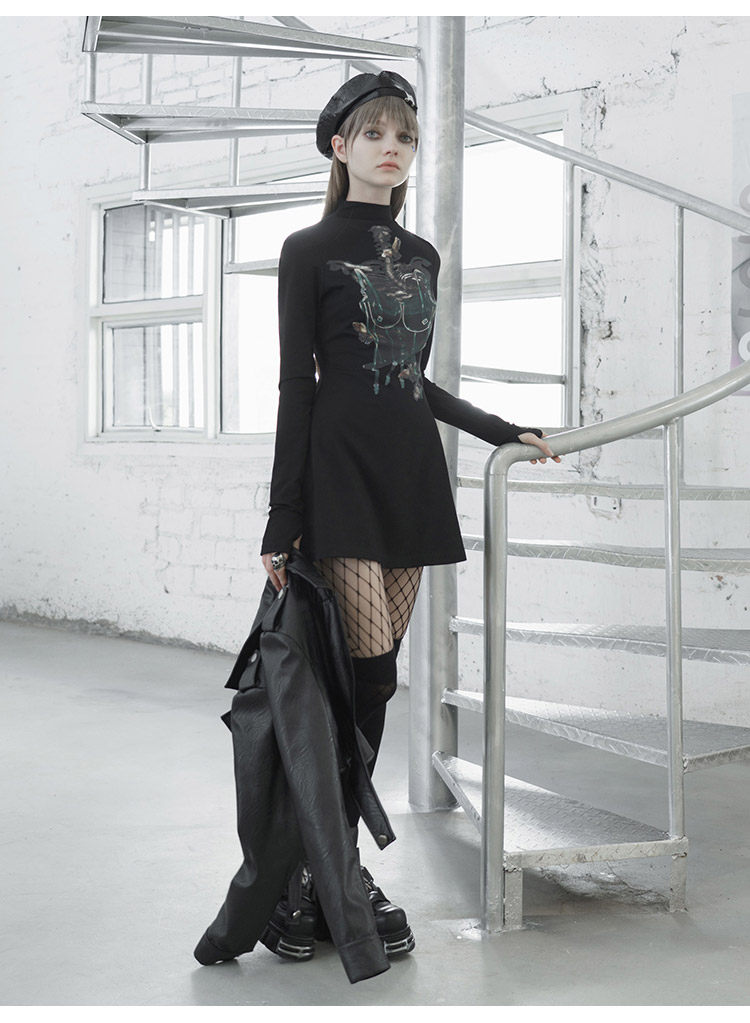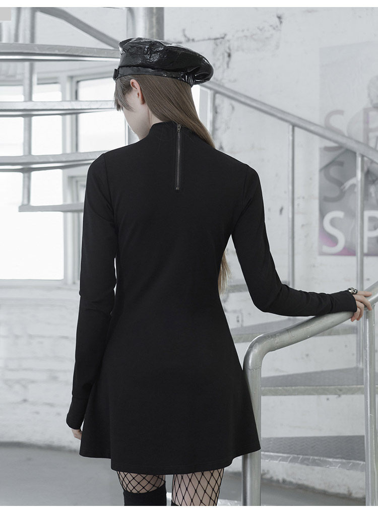 Черное приталенное платье, лонгслив, демисезонная юбка, высокий воротник, А-силуэт