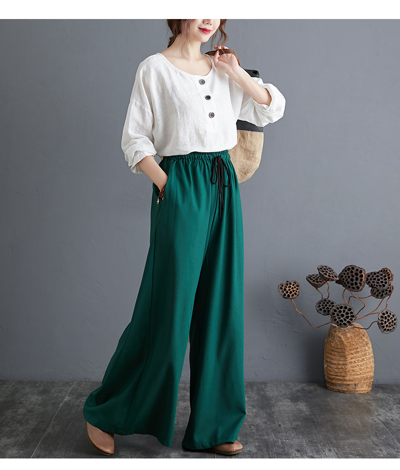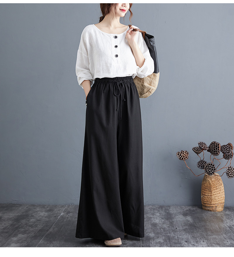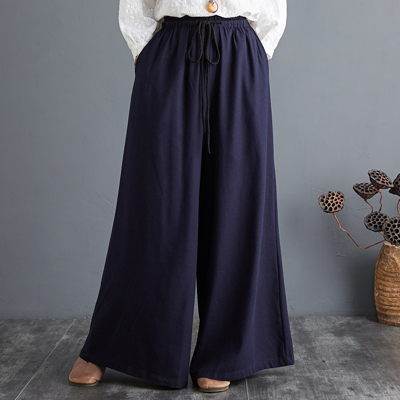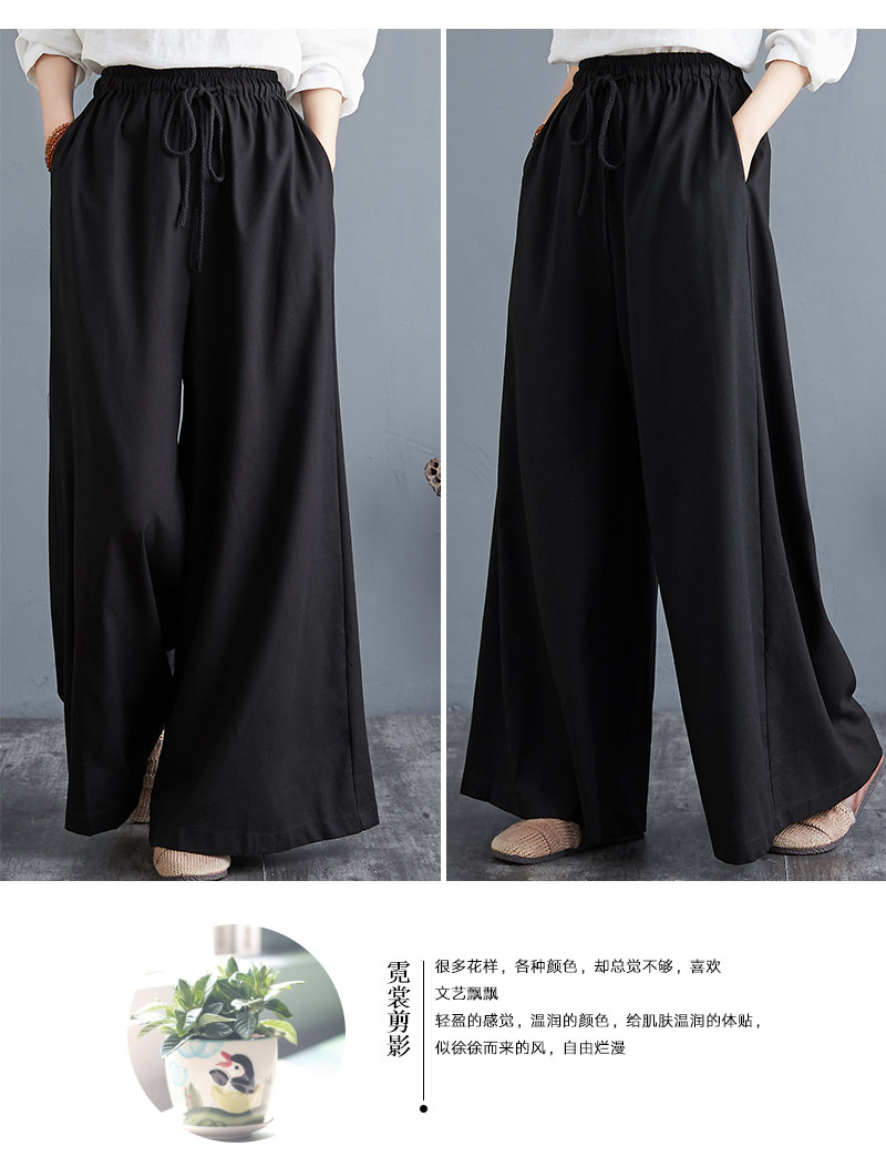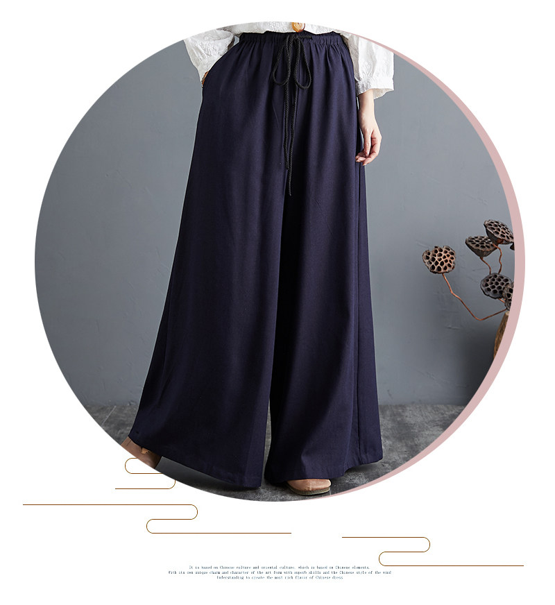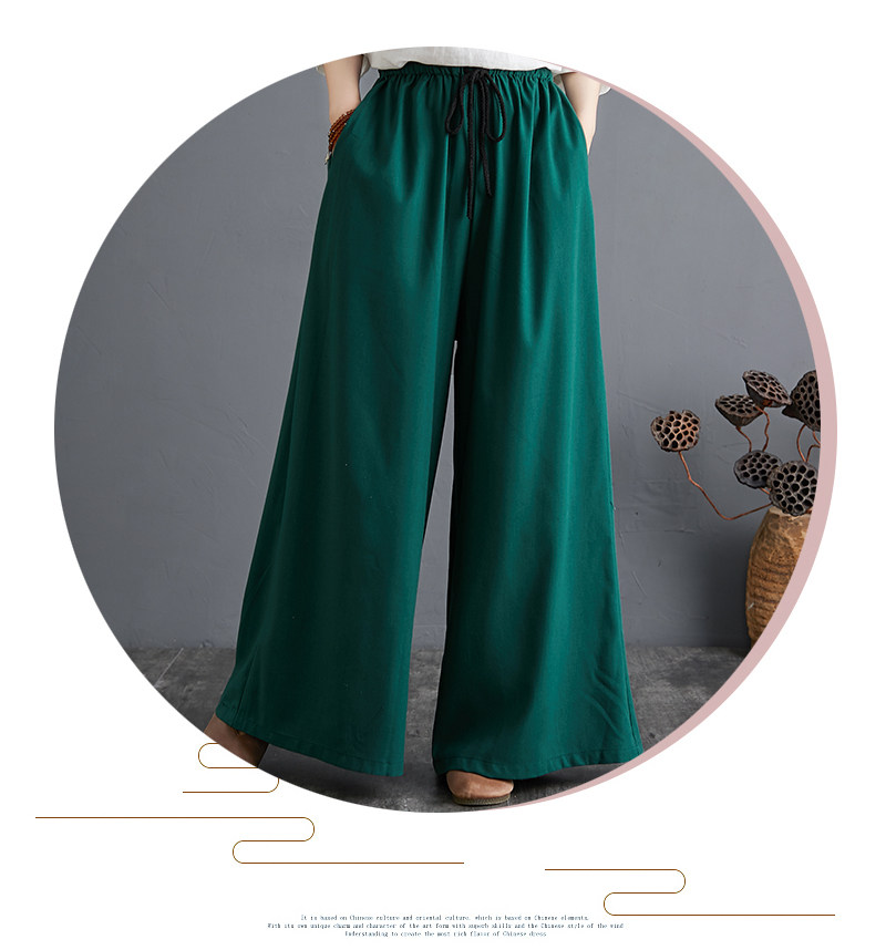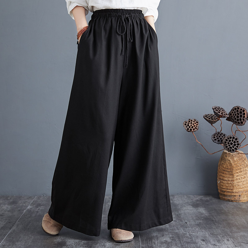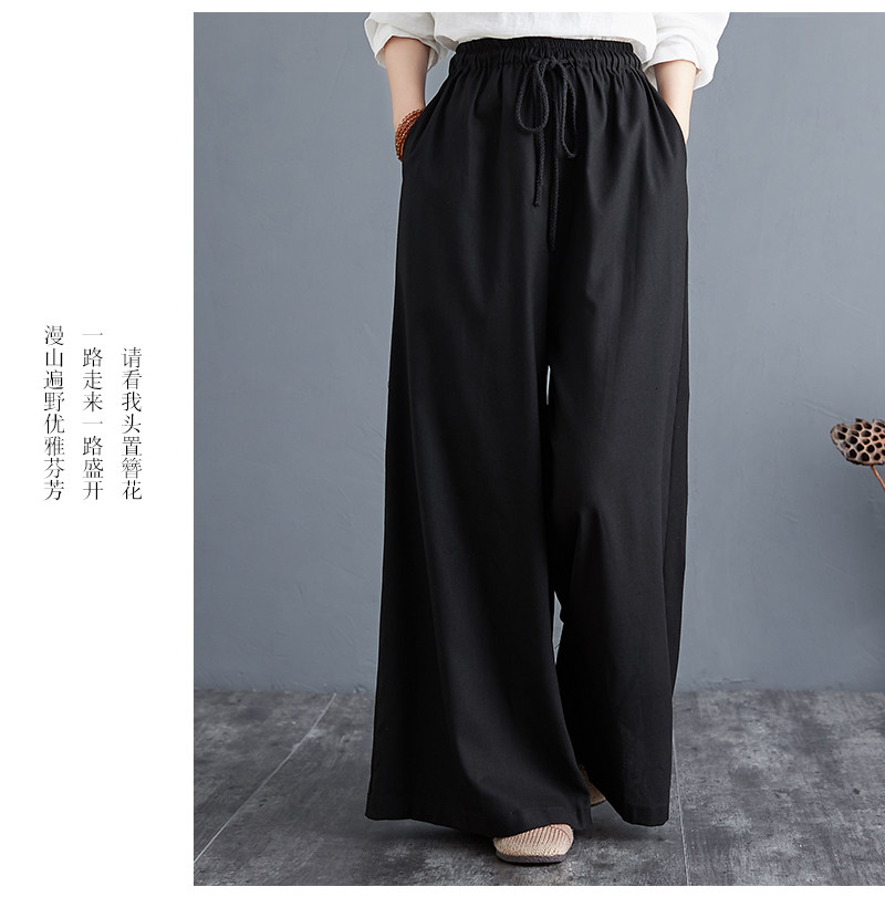 Штаны, из хлопка и льна, высокая талия, свободный прямой крой, китайский стиль