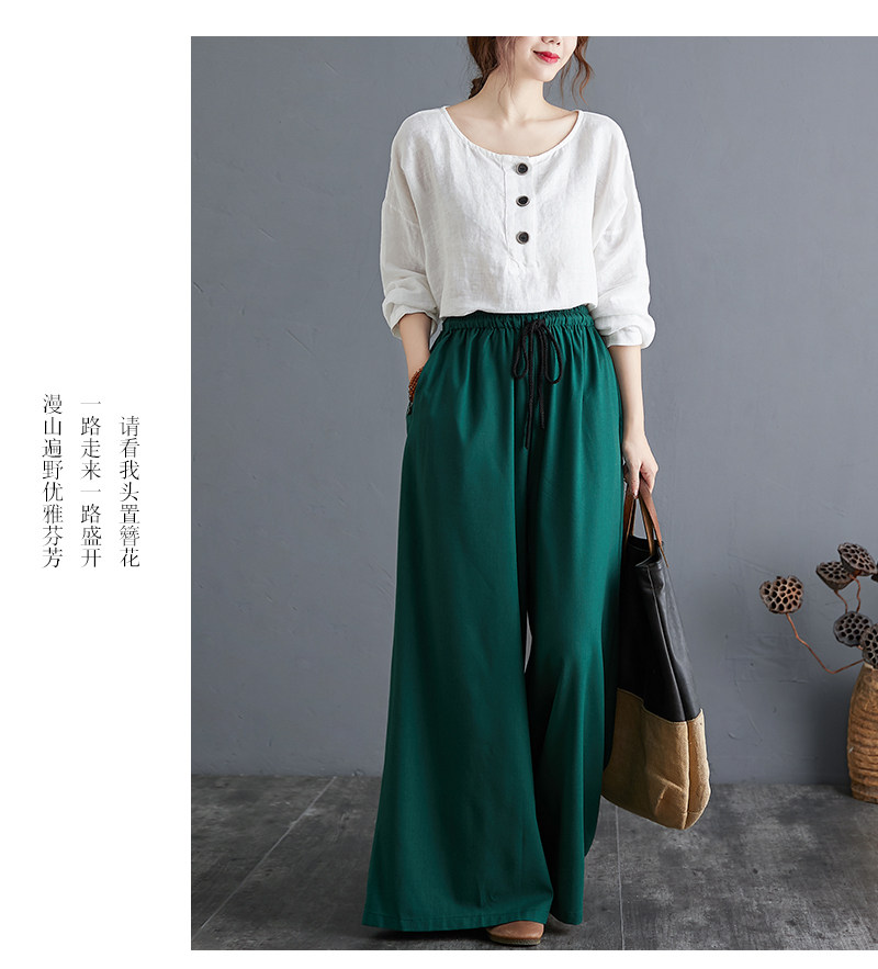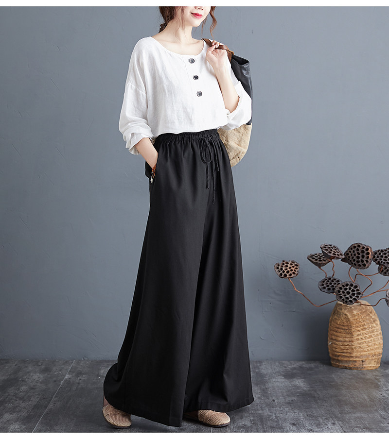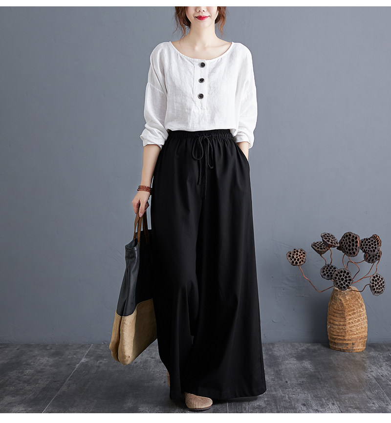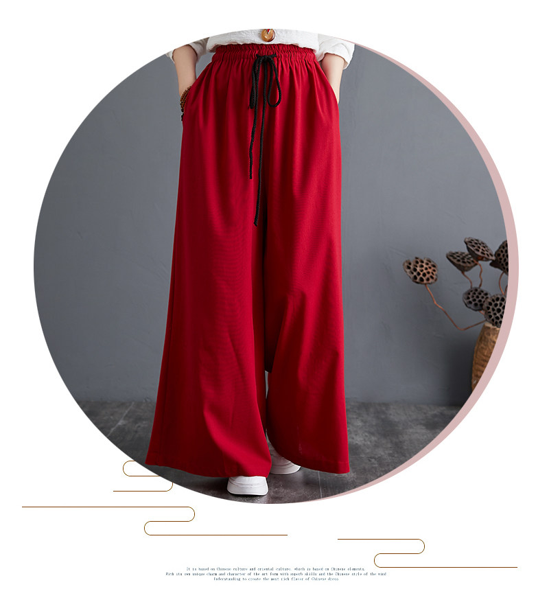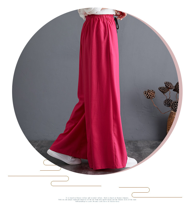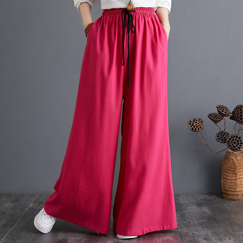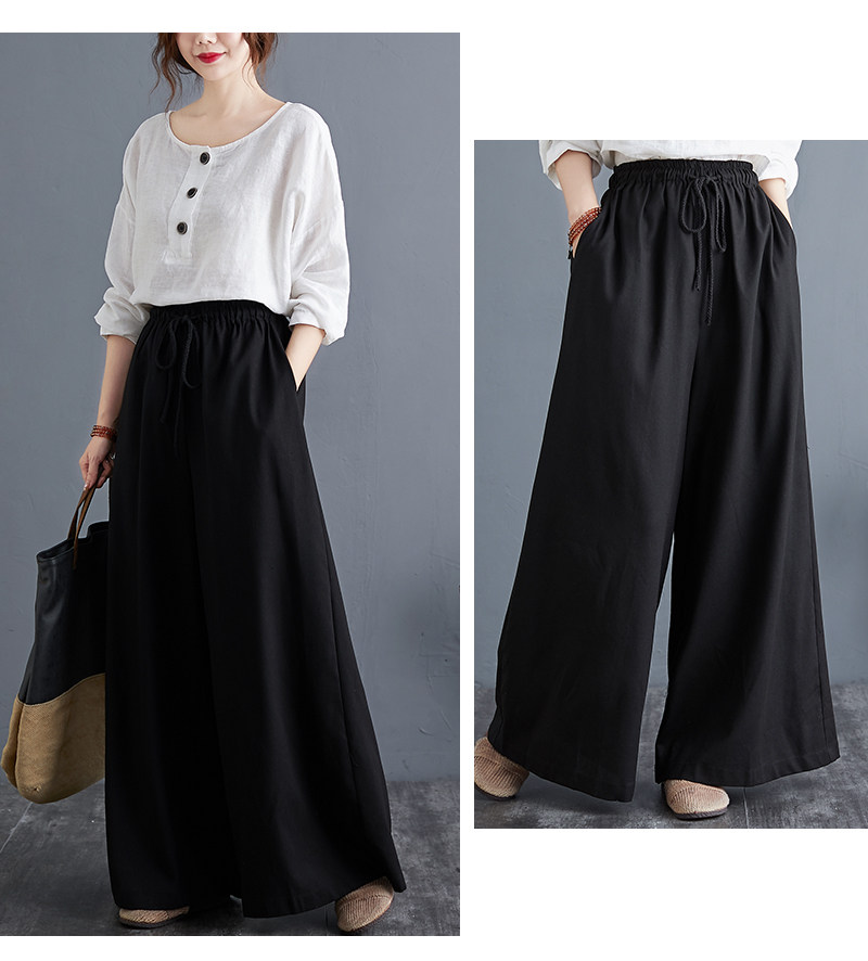 Штаны, из хлопка и льна, высокая талия, свободный прямой крой, китайский стиль