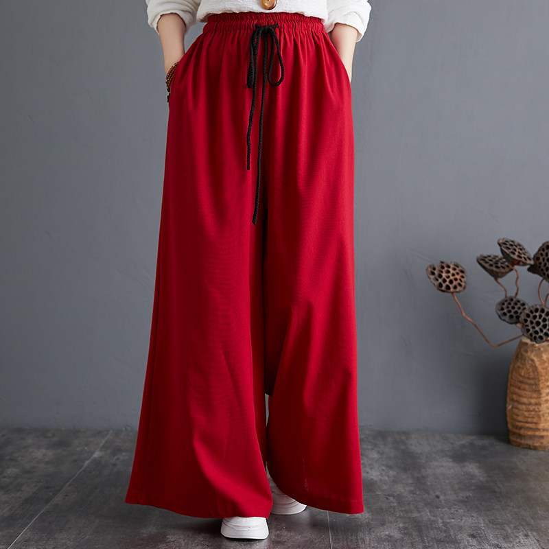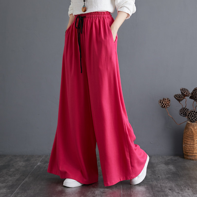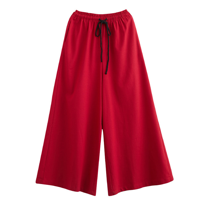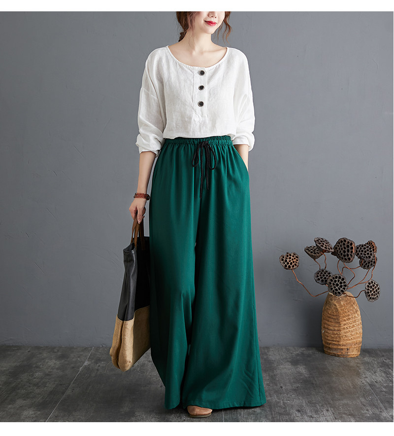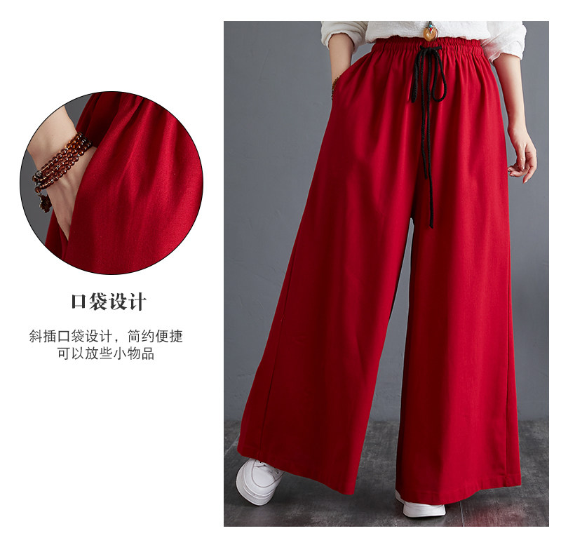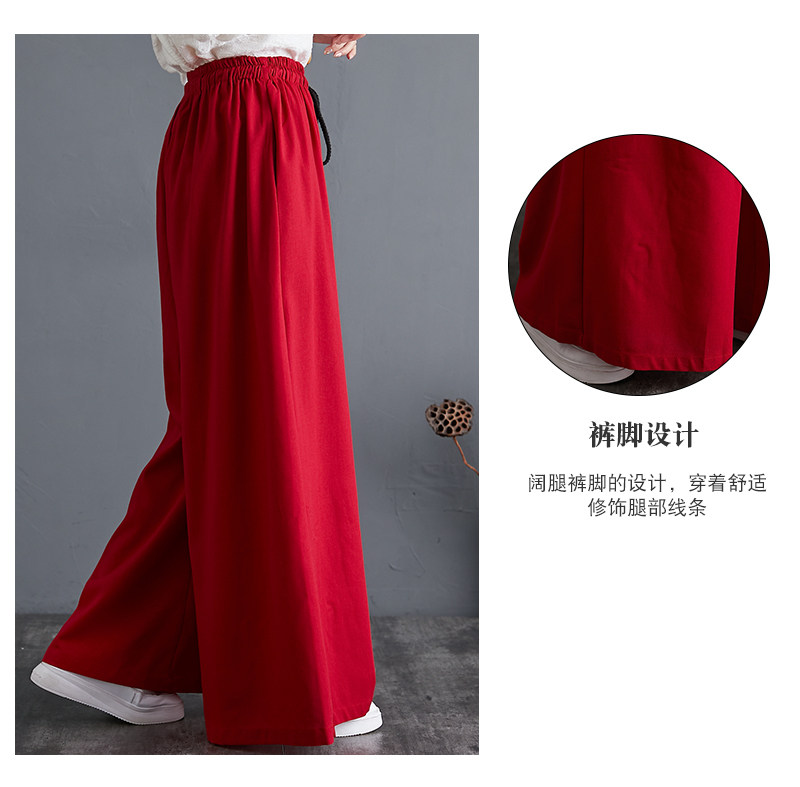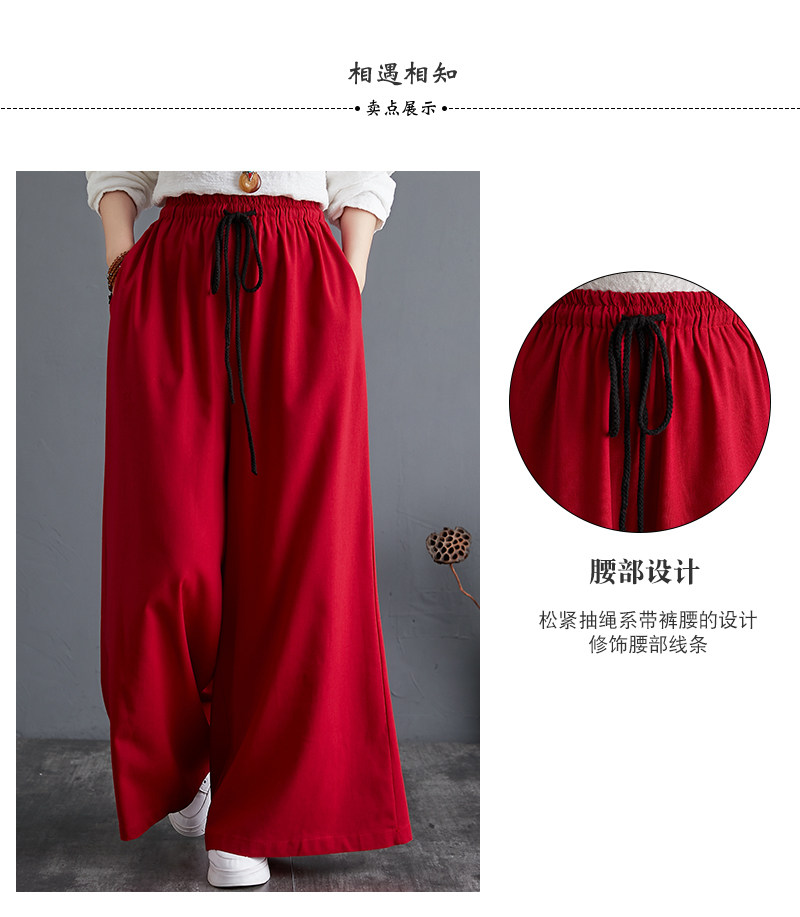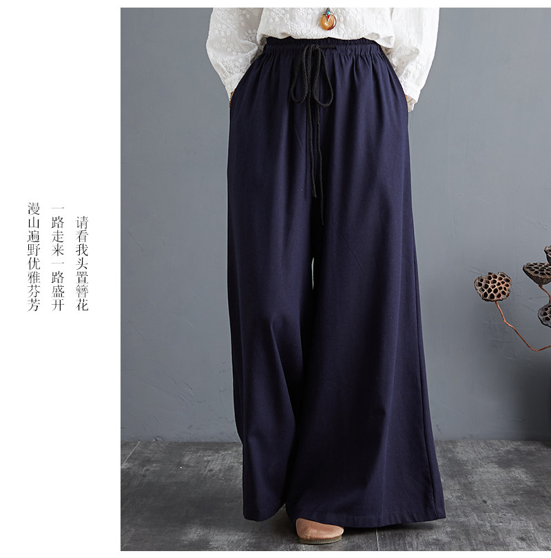 Штаны, из хлопка и льна, высокая талия, свободный прямой крой, китайский стиль