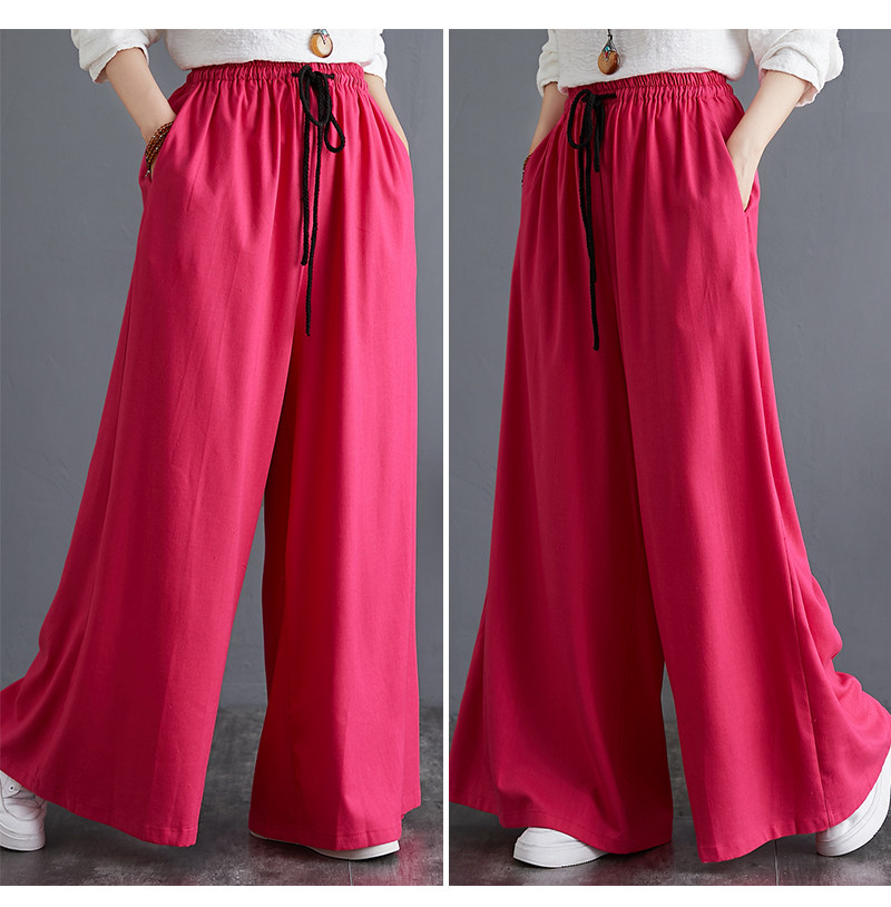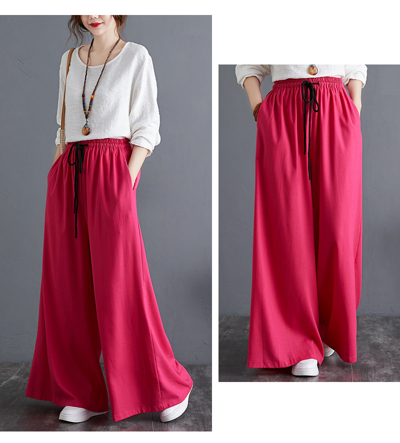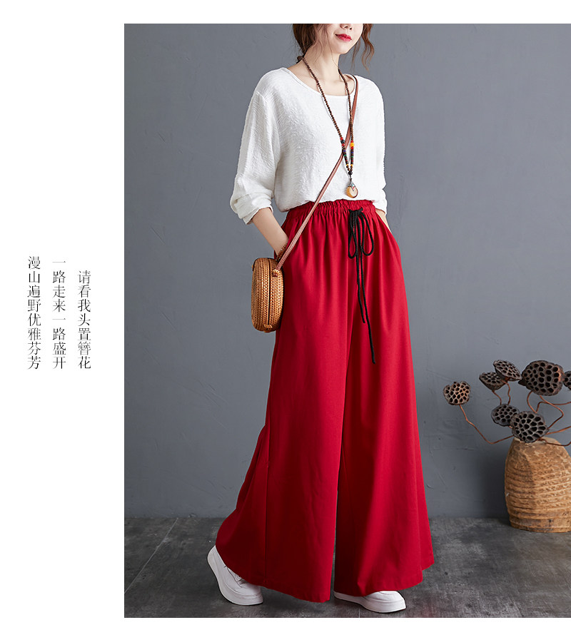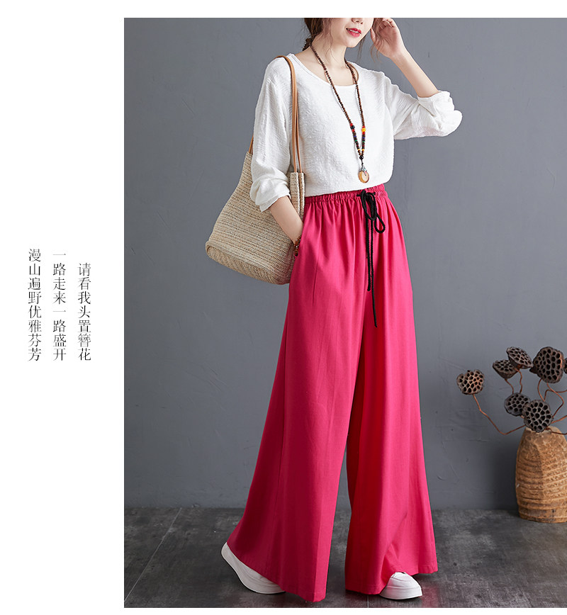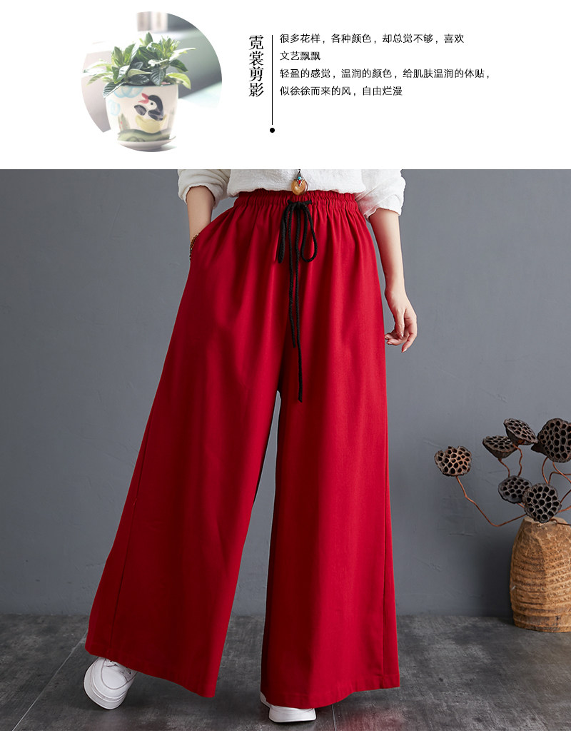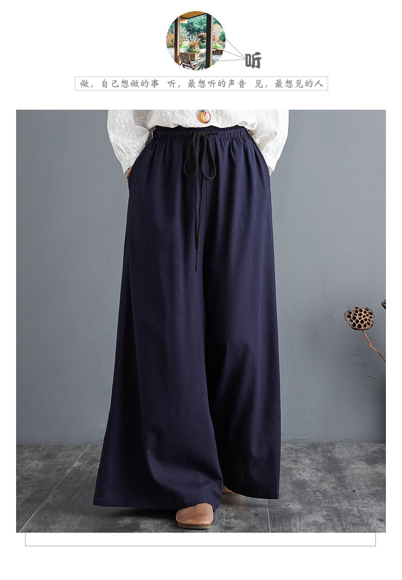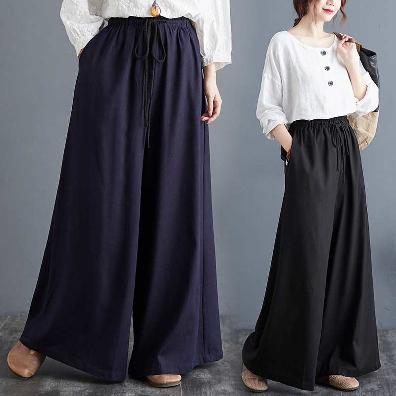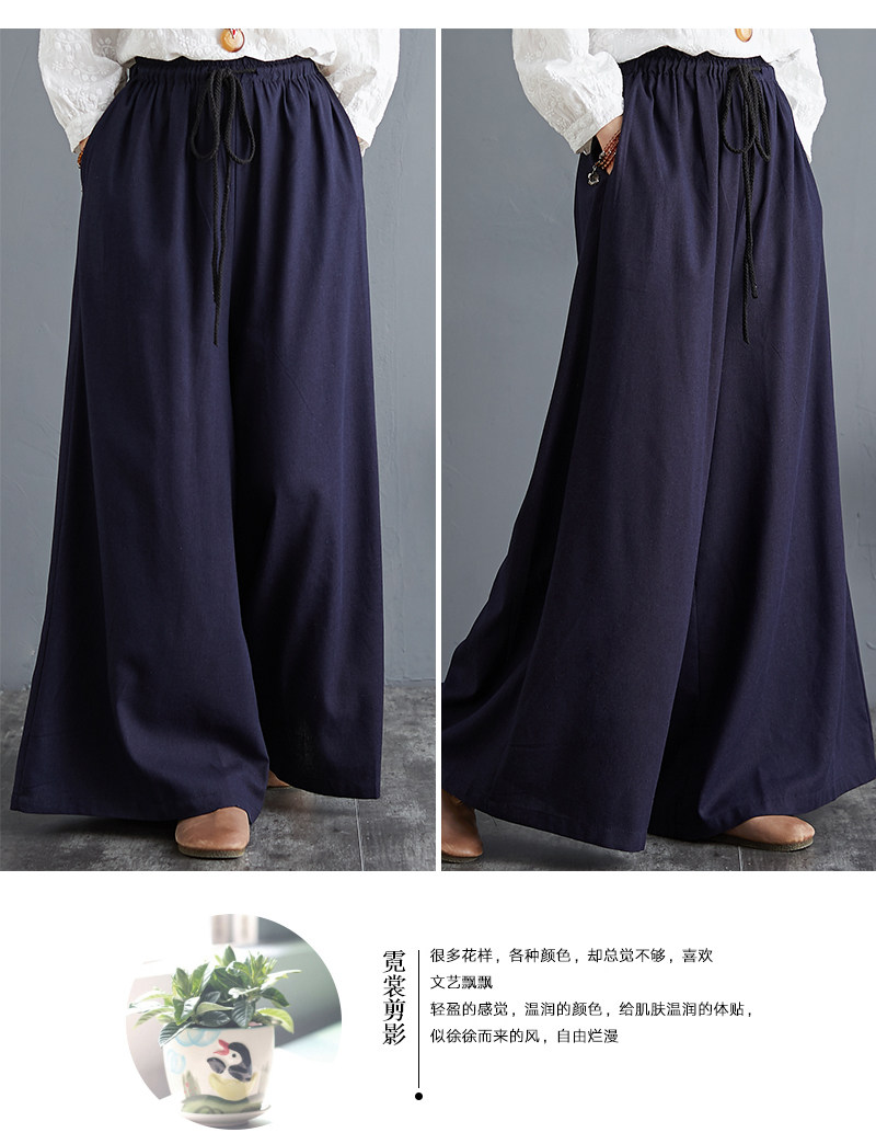 Штаны, из хлопка и льна, высокая талия, свободный прямой крой, китайский стиль