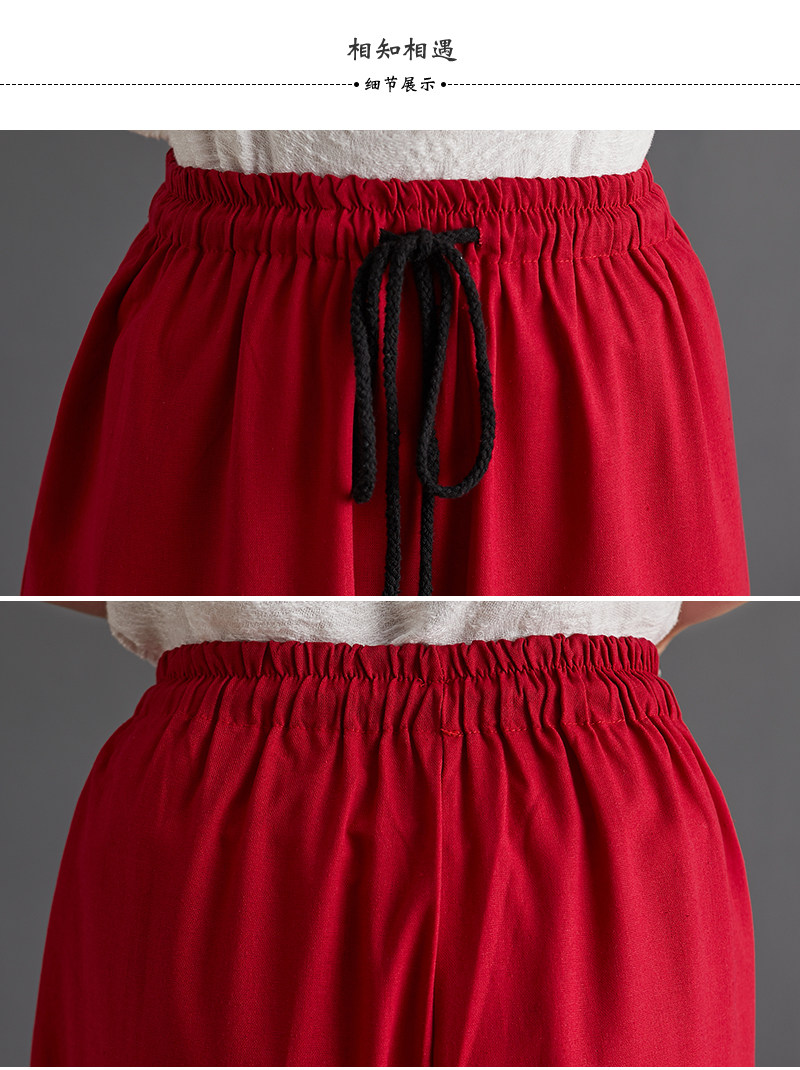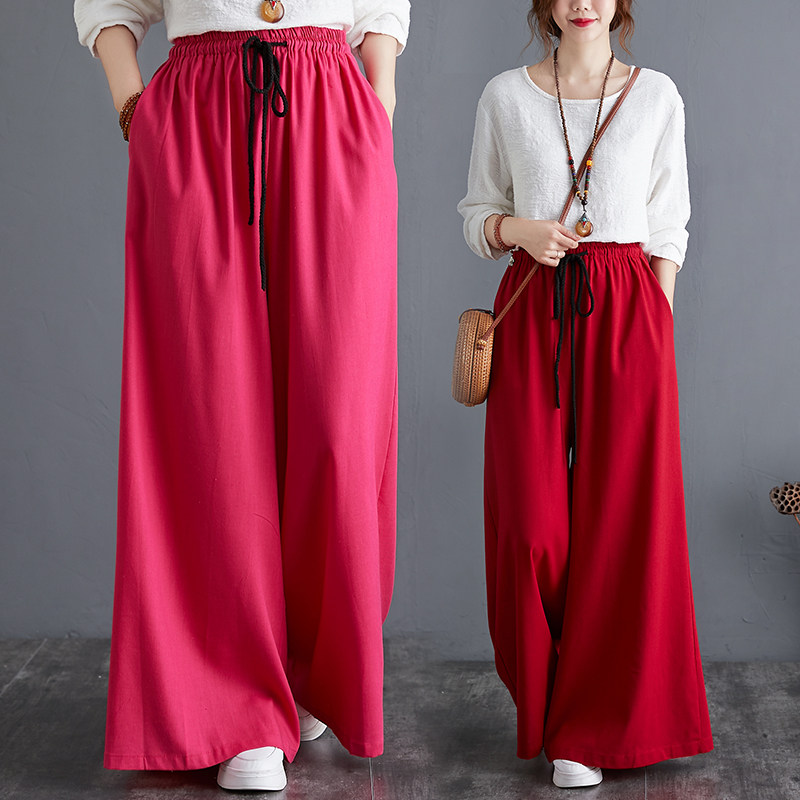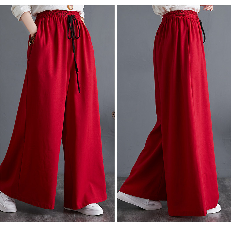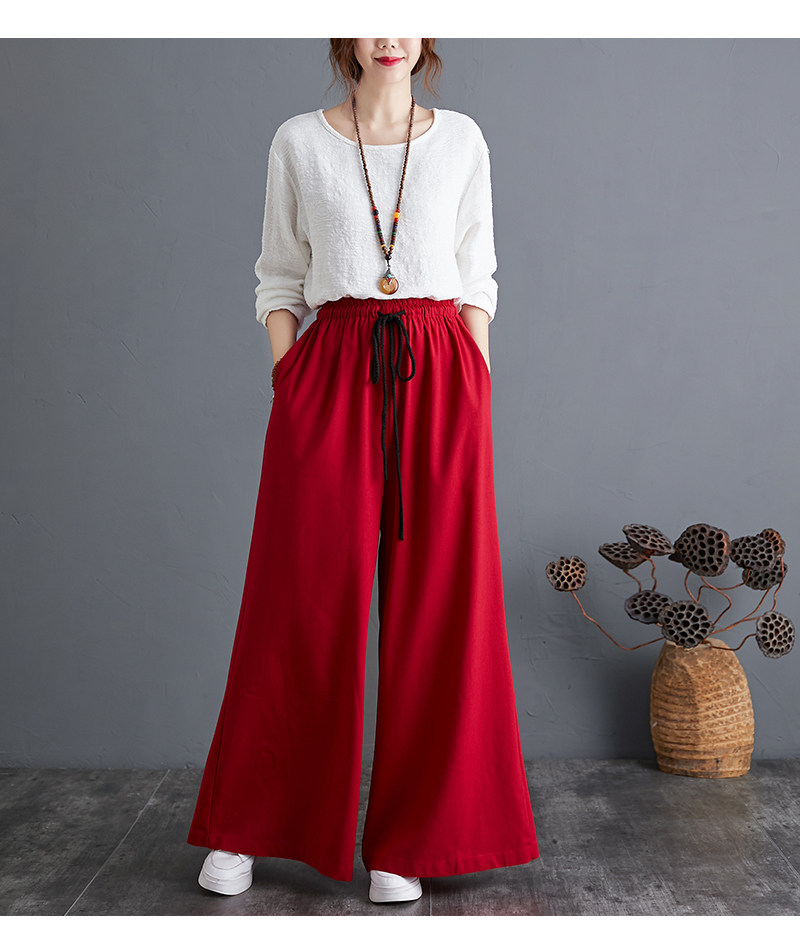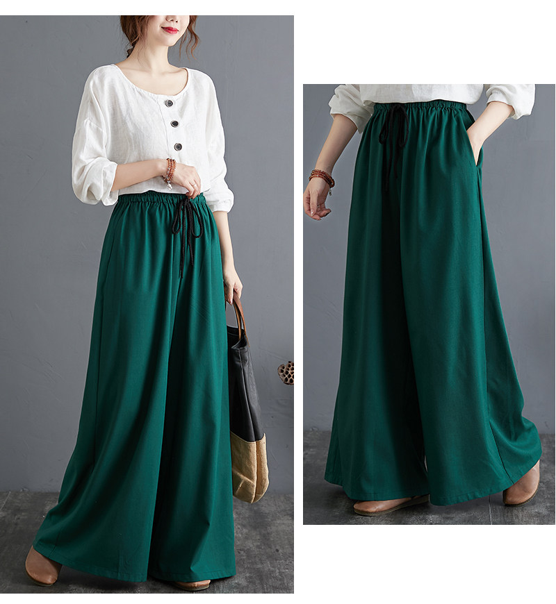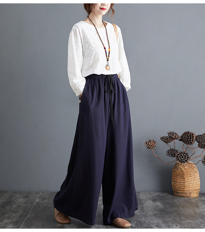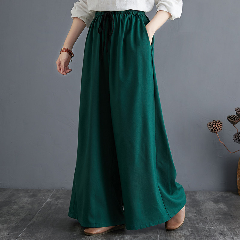 Штаны, из хлопка и льна, высокая талия, свободный прямой крой, китайский стиль