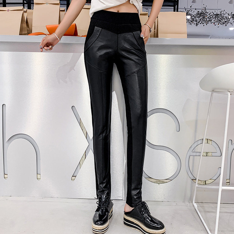 Штаны, универсальный комбинезон, эластичный карандаш, европейский стиль, из натуральной кожи, в обтяжку, эластичная талия