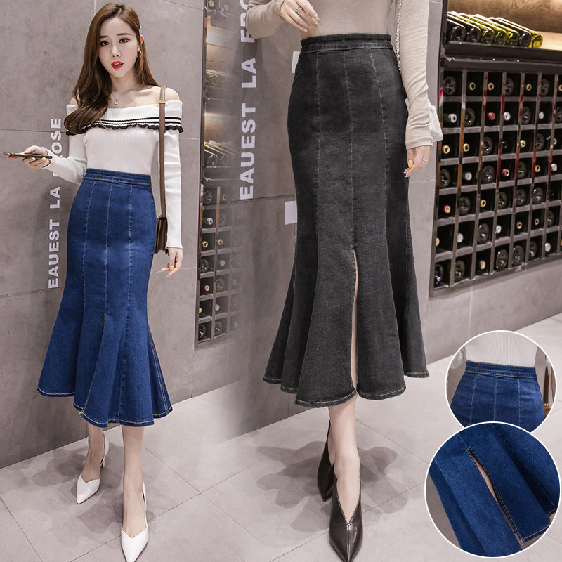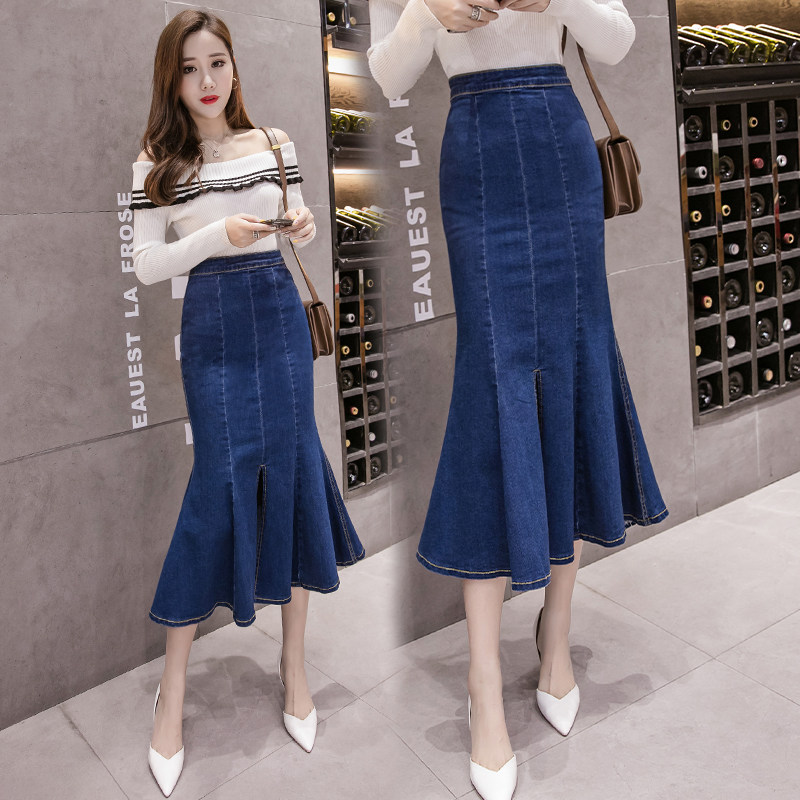 Осенняя длинная джинсовая юбка, средней длины, высокая талия, А-силуэт, с акцентом на бедрах, рыбий хвост