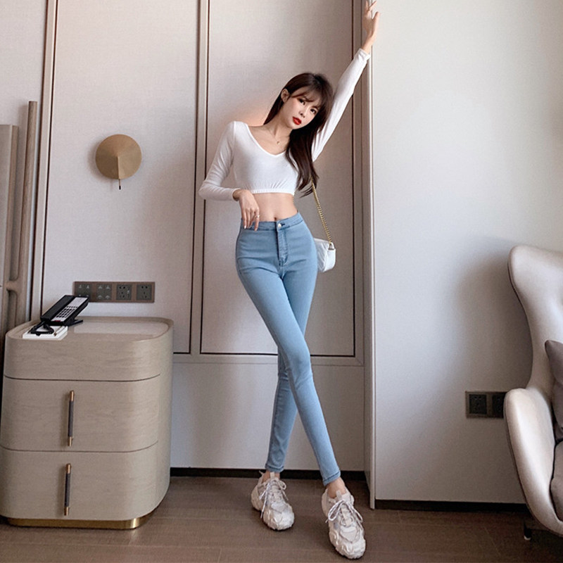 Джинсы, синие цветные эластичные штаны, джинсовый карандаш, 2021 года, высокая талия, в обтяжку, с акцентом на бедрах, облегающий крой