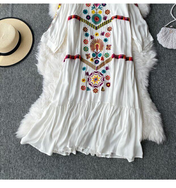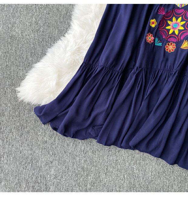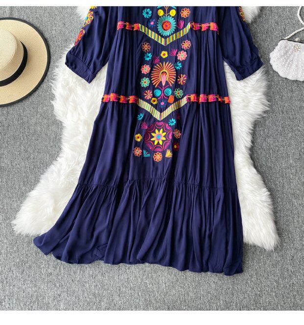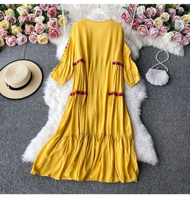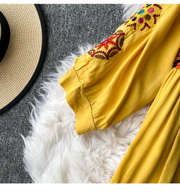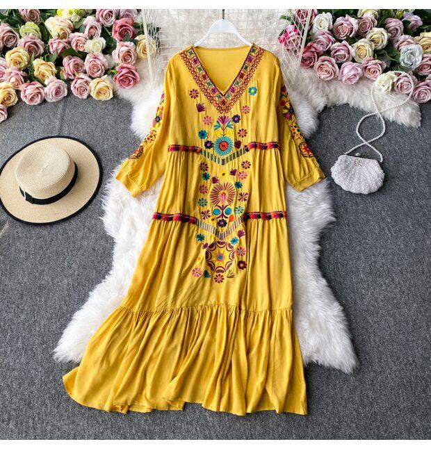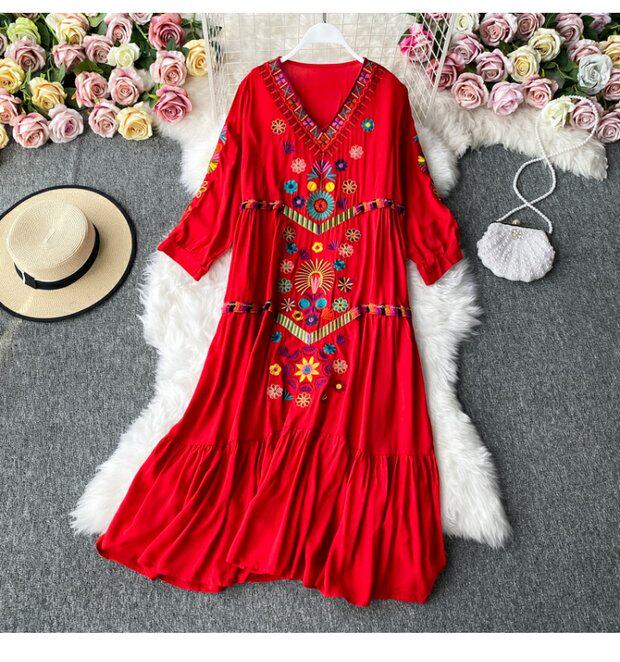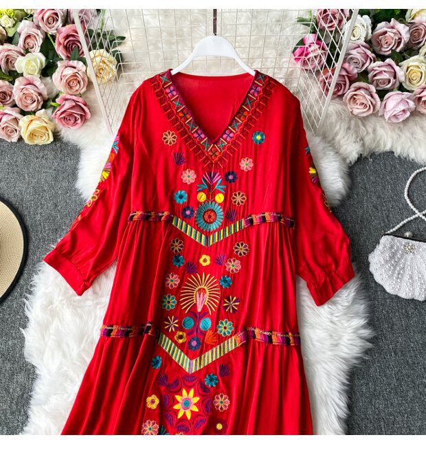 Осенняя этническая длинная юбка, платье, стиль бохо, этнический стиль, большой размер, средней длины, с вышивкой, из хлопка и льна, V-образный вырез