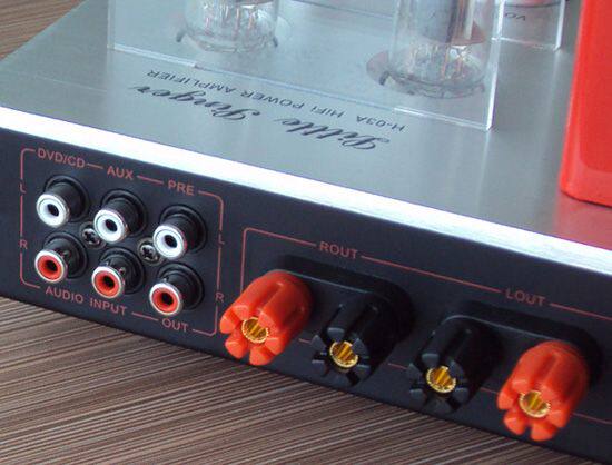 Крупным планом задний интерфейс H-03A: слева направо вход DVD/CD, многоцелевой вход AUX, выход предусилителя PRE, клеммы для подключения выхода усилителя мощности.