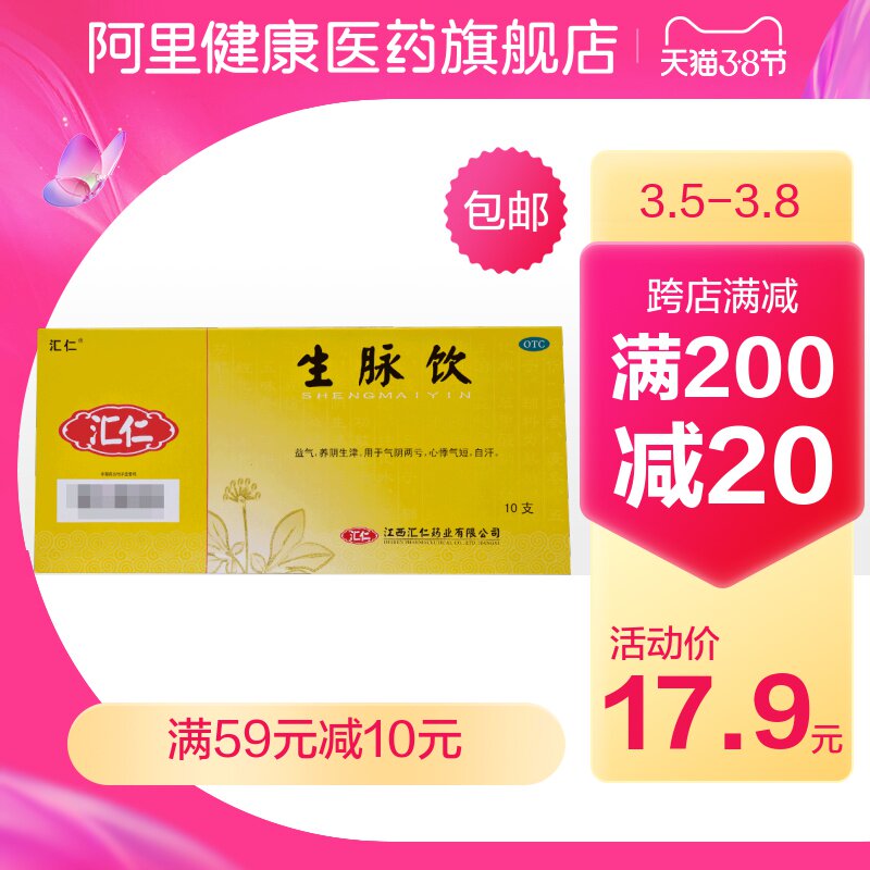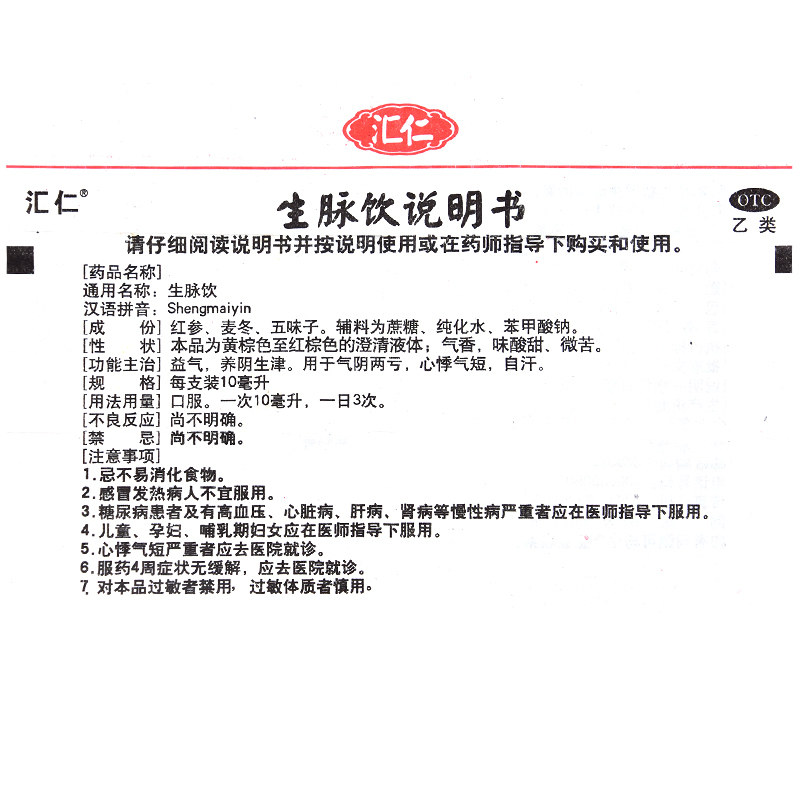汇仁 Shengmai Prink (рецепт женьшеня) 10 центров/коробки Yiqi qi nourish Инь, Инь, Инь, Инь и Инь, сердцебиение сердца, сердце