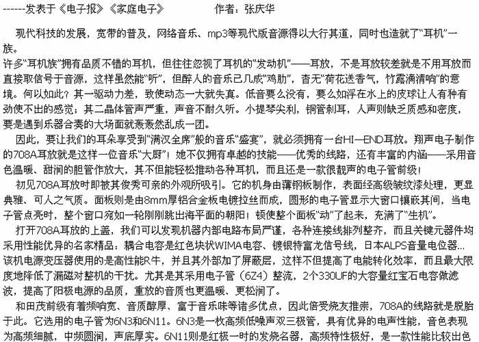 После фактического прослушивания этот усилитель 708B является динамичным, высоко анализируется, тройки ясный, прозрачный, освежающий и приятный;Звук теплый и долговечный, с высоко восстановленным качеством звука, тихой и сухой музыкальной фон.