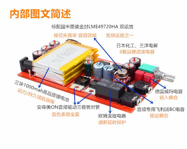 выходной конец использует 2 Philips Professional Audio BC конденсаторов; входной терминал использует 2 немецких конденсаторов WIMA, чтобы насладиться хорошим голосом!~