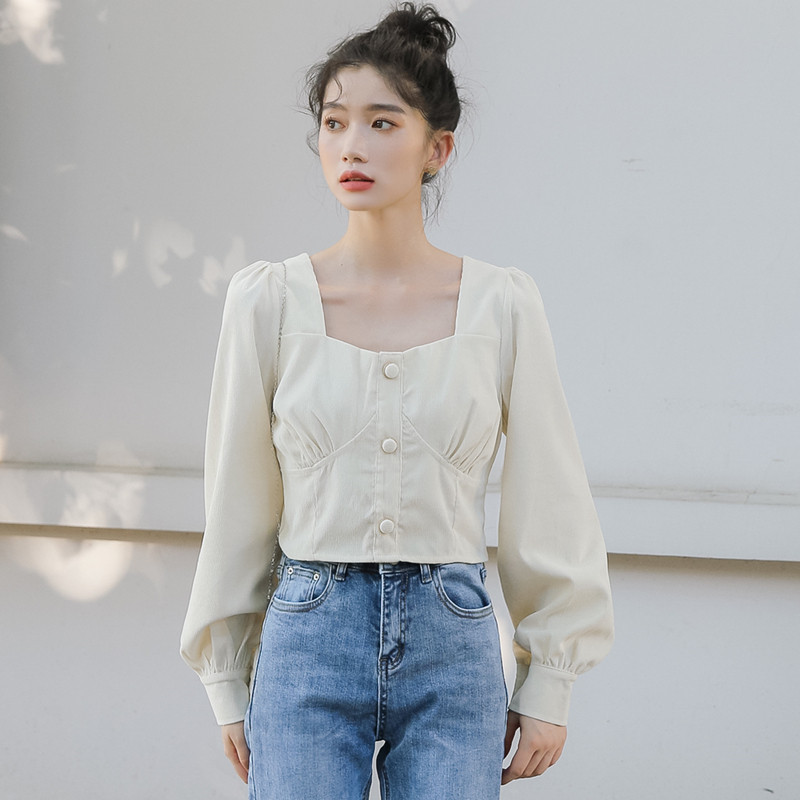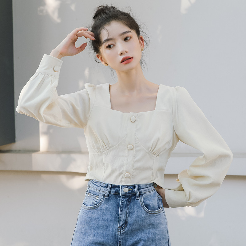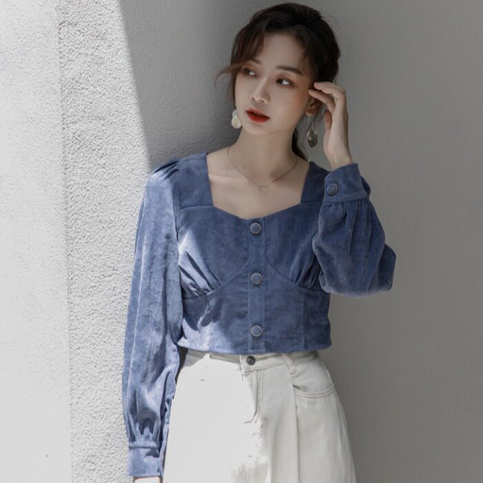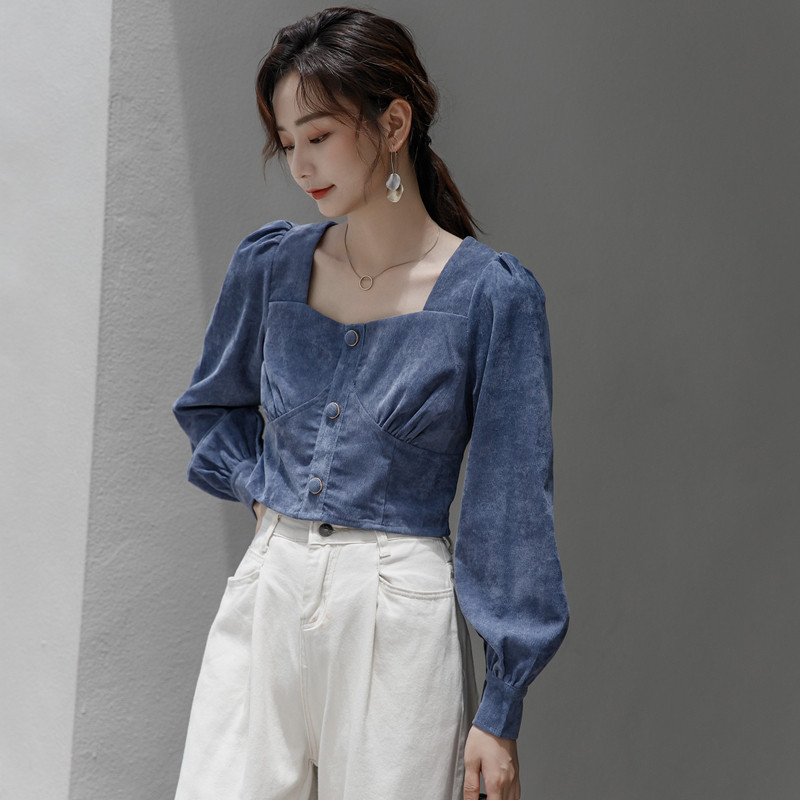 Короткая синяя небольшая свежая весенняя рубашка, рукава фонарики, высокая талия
