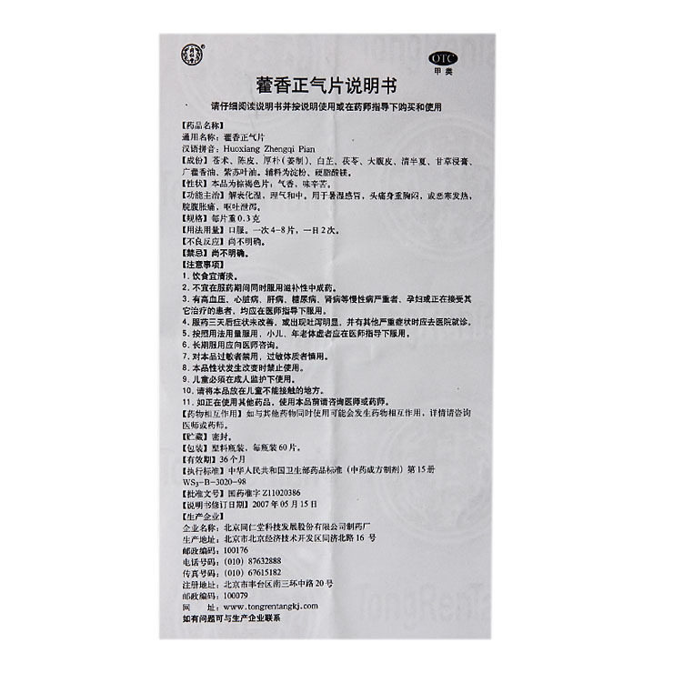 同仁堂 Huoxiang Zhengqi Таблетки 60 Таблетки головной боли головной боли головной боли головной боли, селезенка и желудка, холод, холод, тепло, рвота, диарея, отеки живота