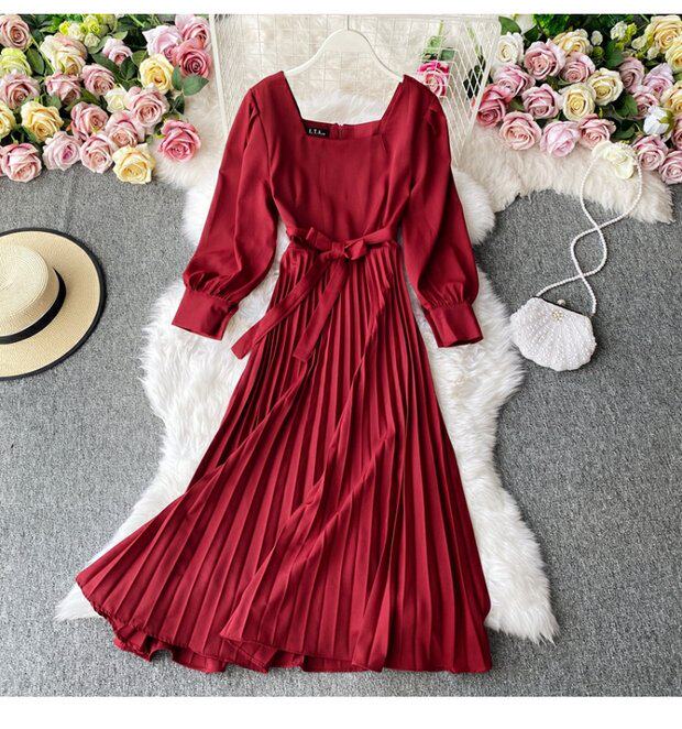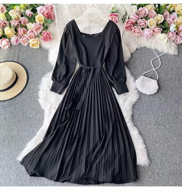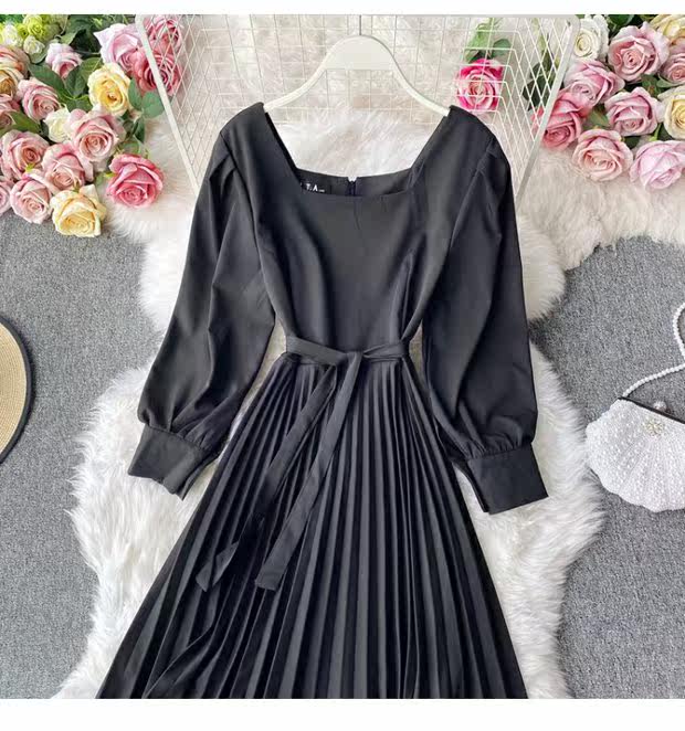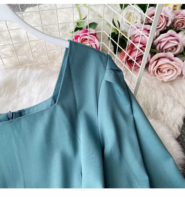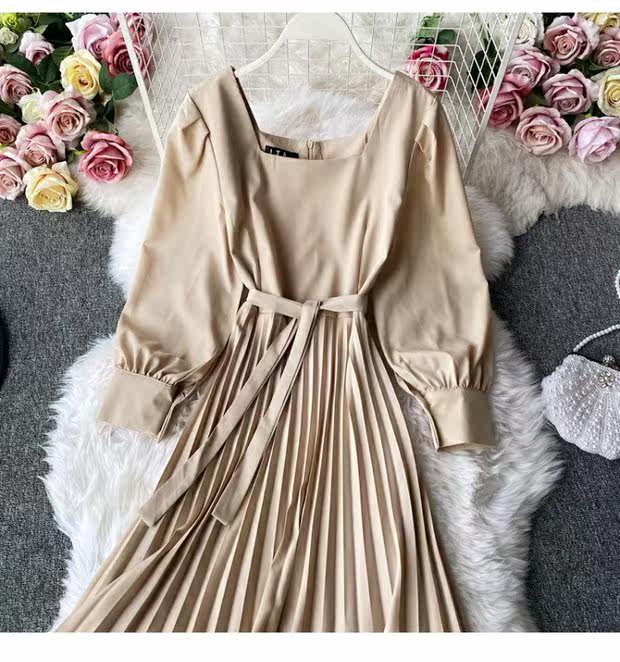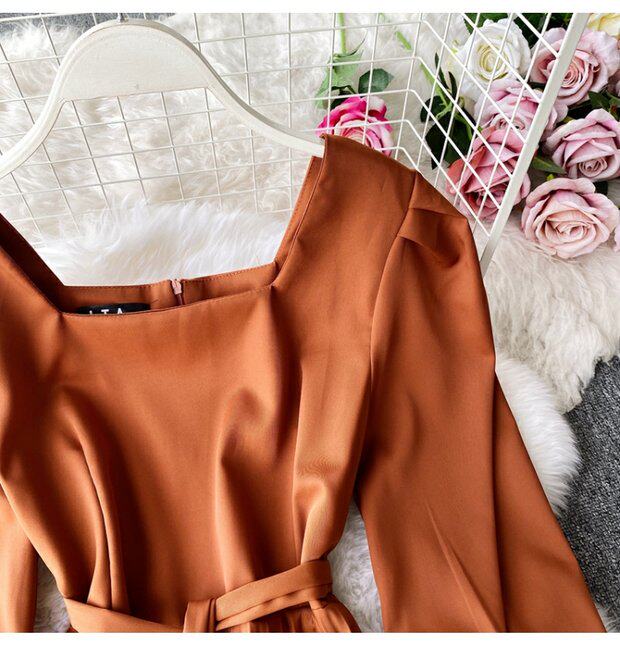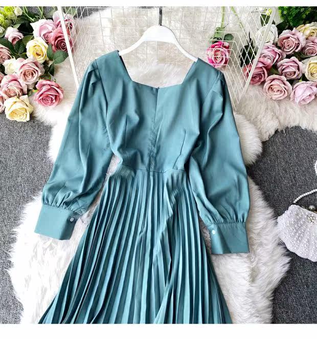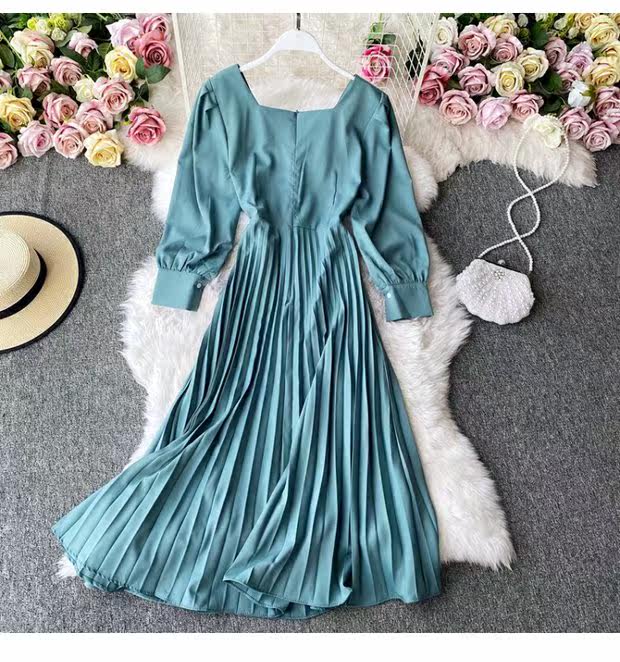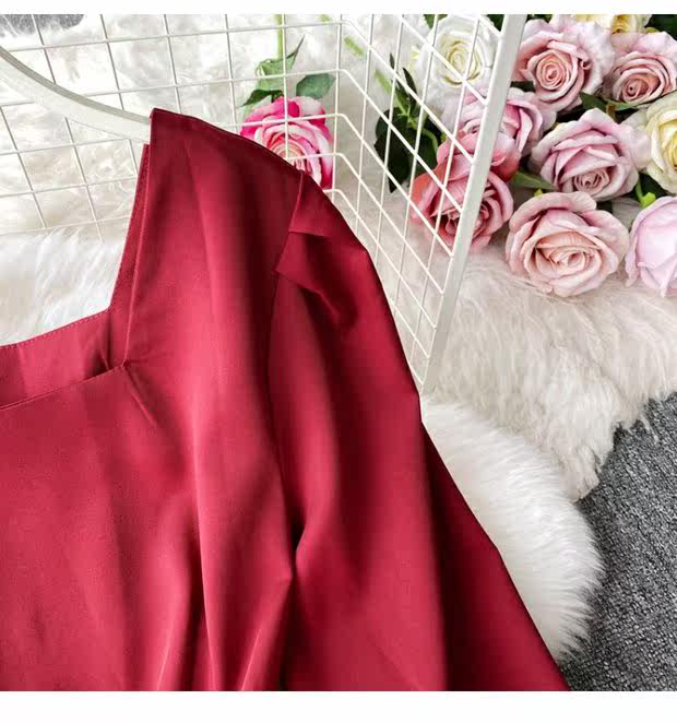 Демисезонное модное платье, длинная юбка, коллекция 2021, французский стиль, квадратный вырез, в корейском стиле, яркий броский стиль, длина макси