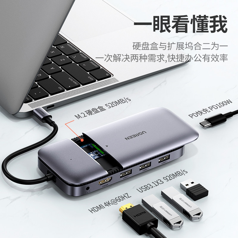 绿联 Typec Expansion Dock M.2 Сплошные твердые жесткие дисковые концентраторы расщепления -Line -Line Extender HDMI Multi -Interface SATA до SSD2242 Lightning 3 Подходит для Apple MacBook Computer Rotor NGFF