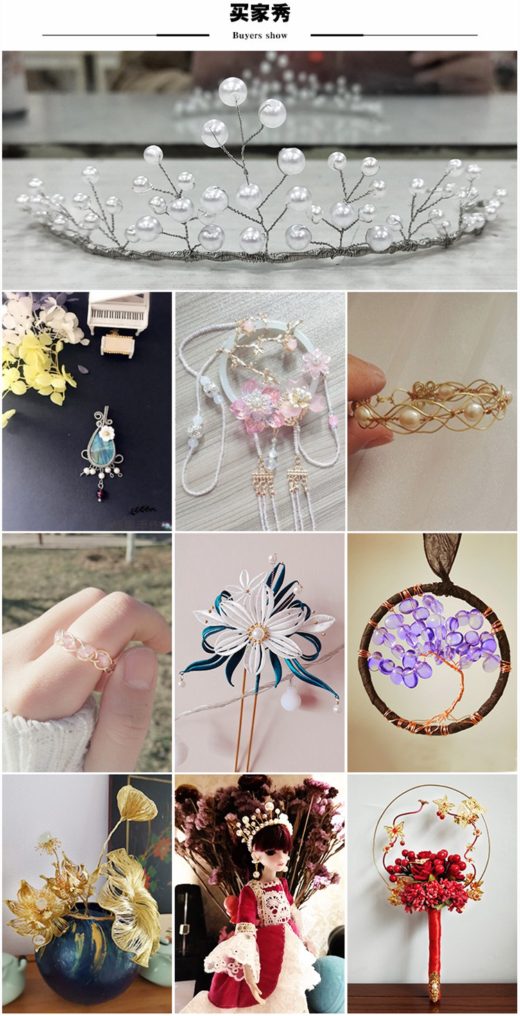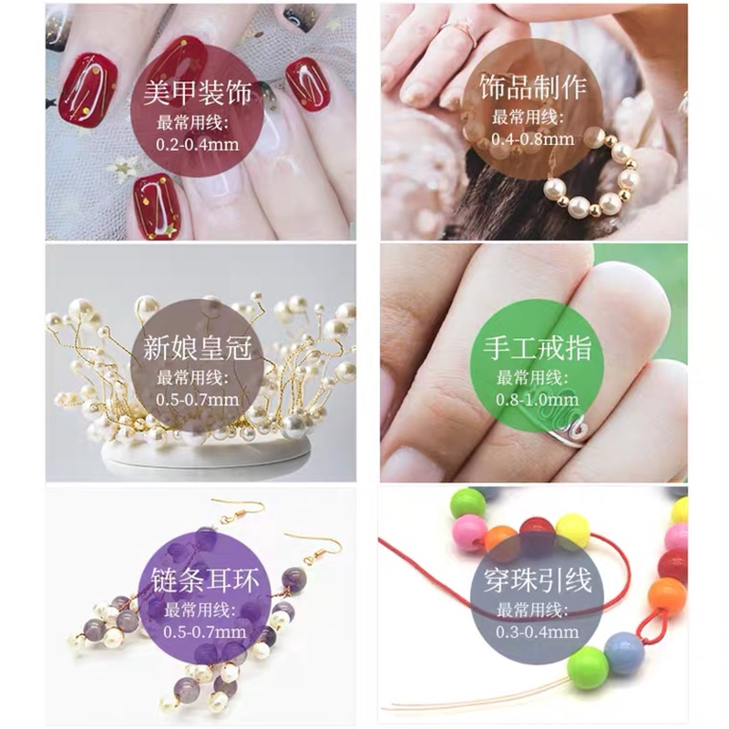 Медный шелк мягкий, может быть свободно согнуть, установить или заменить 9 стежков вместо 9 стежковВставьте в небольшую бусин или аксессуары, если перфорированный внутренний диаметр вашего материала превышает 0,7 мм, вам не нужно использовать медный проволоку, и вы можете использовать 9 стежков напрямую.