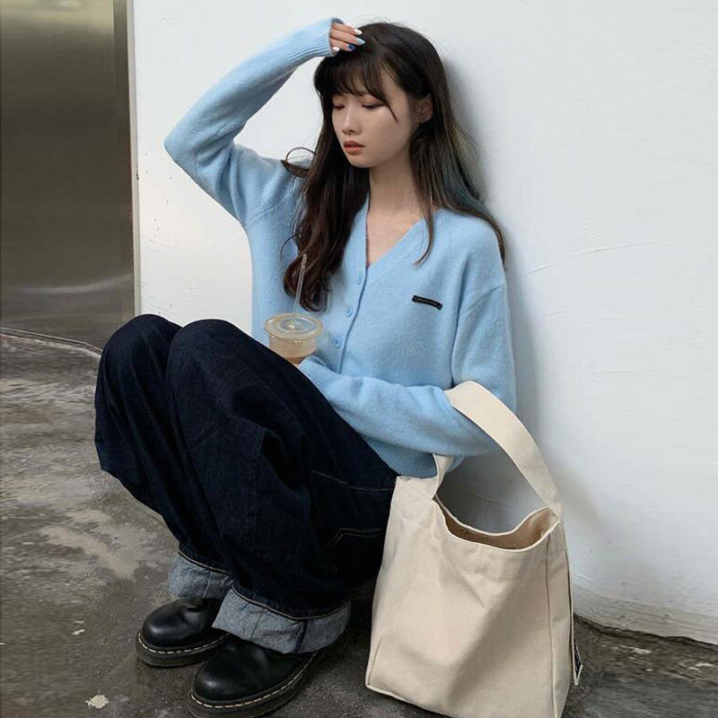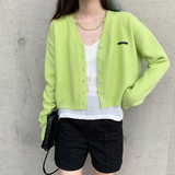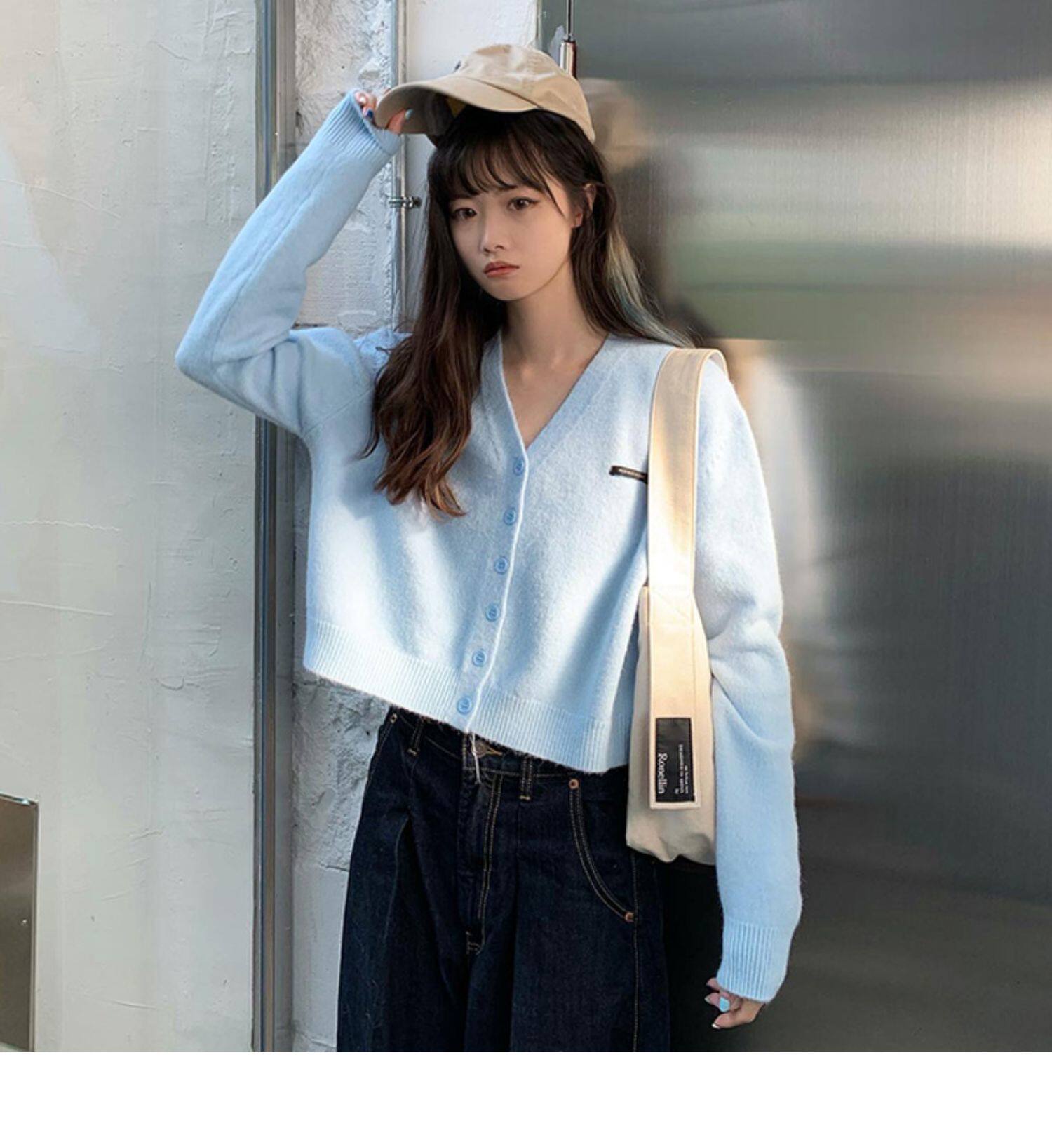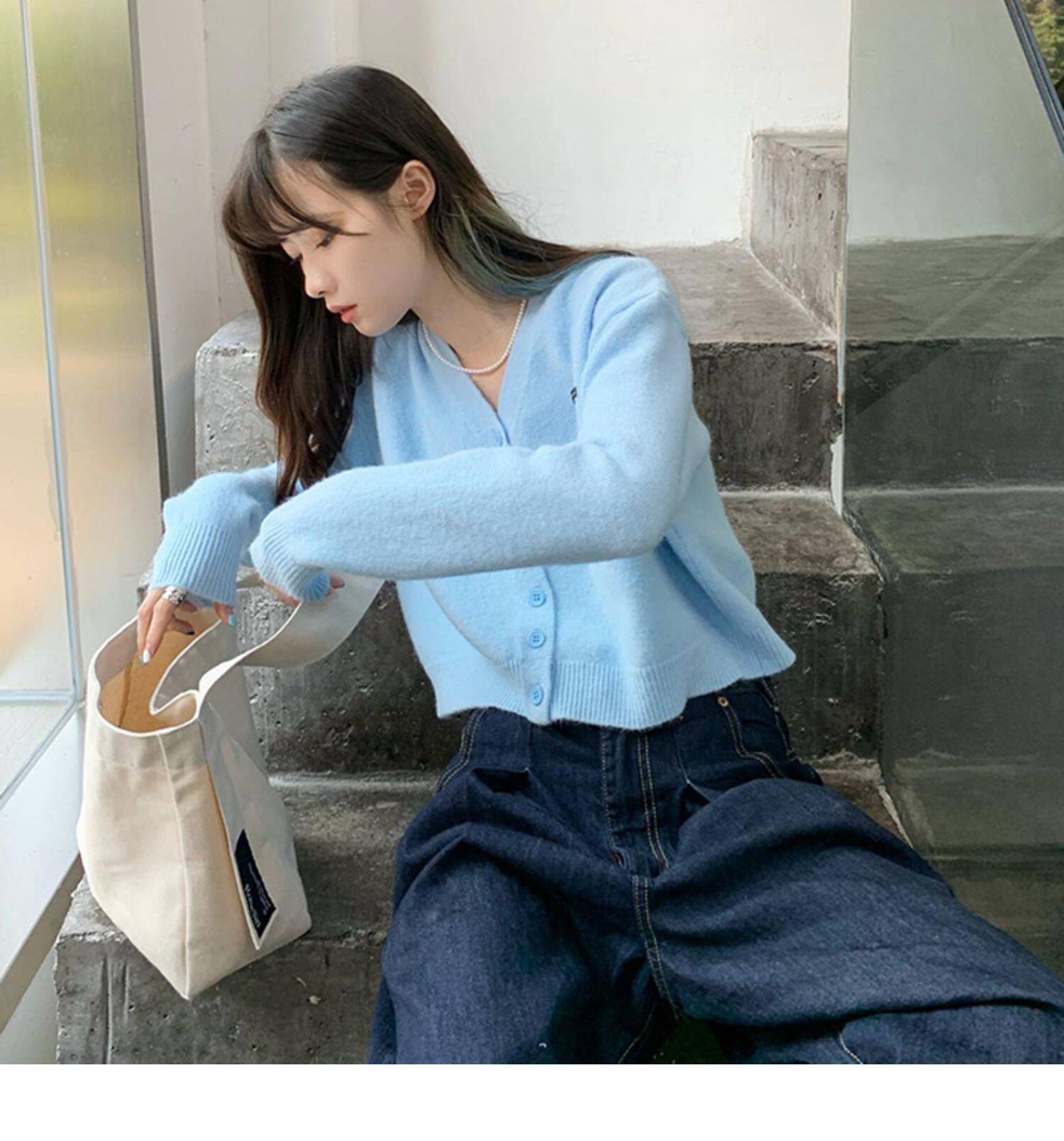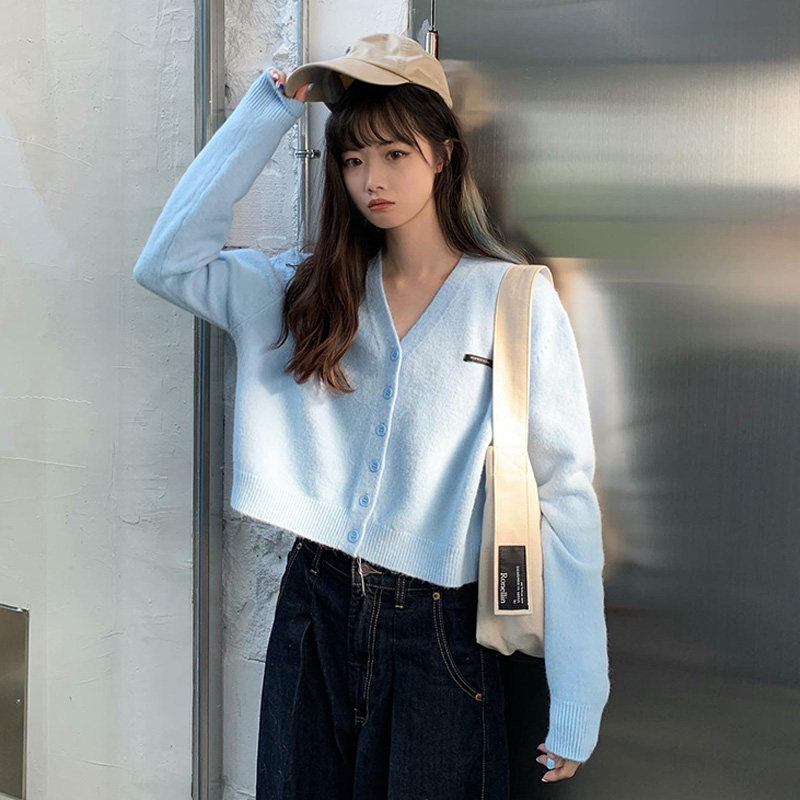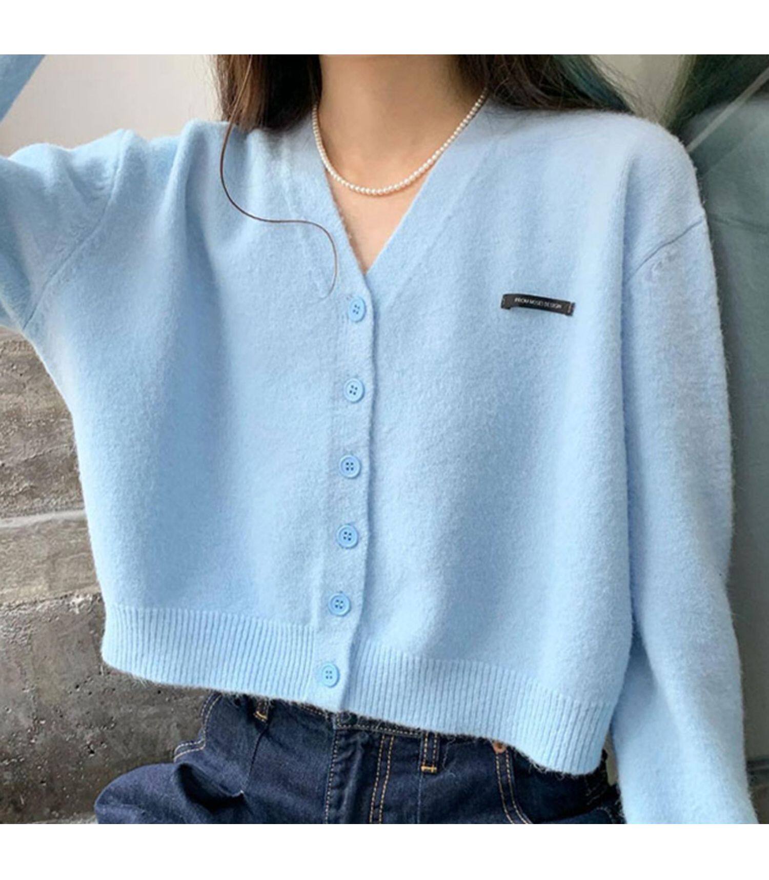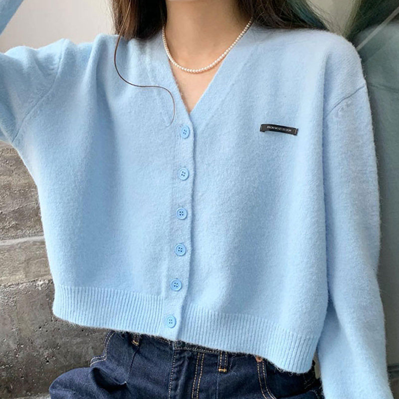 Кардиган, брендовый свитер, короткая лазурная трикотажная куртка, французский стиль, подходит для подростков, V-образный вырез