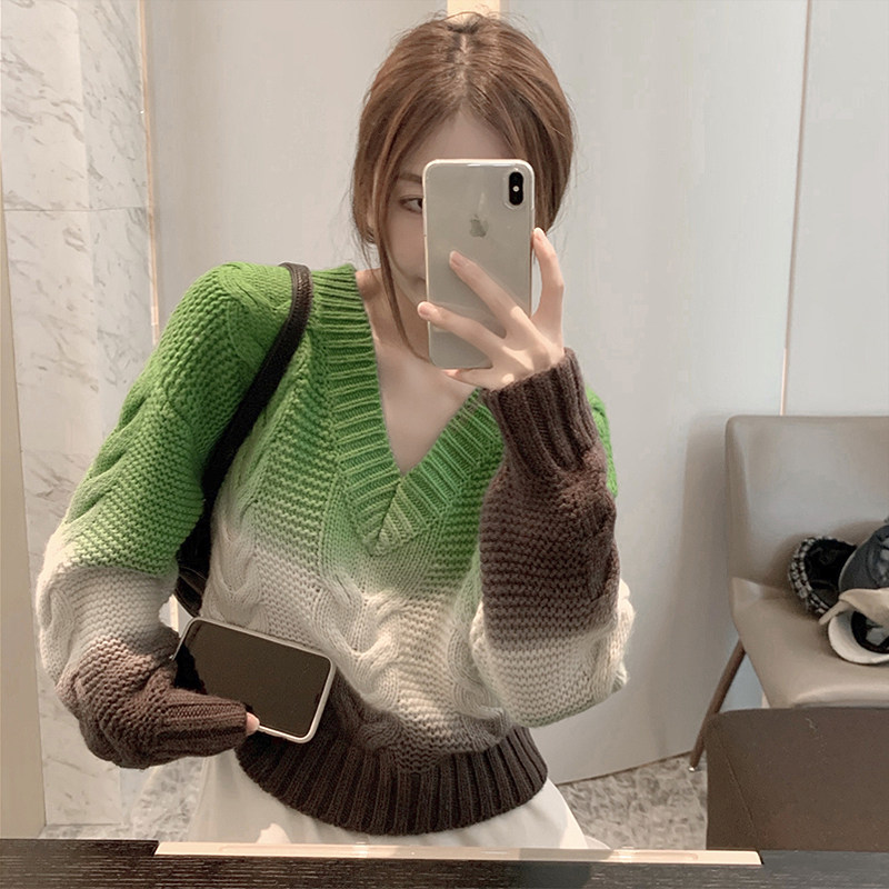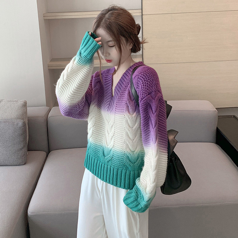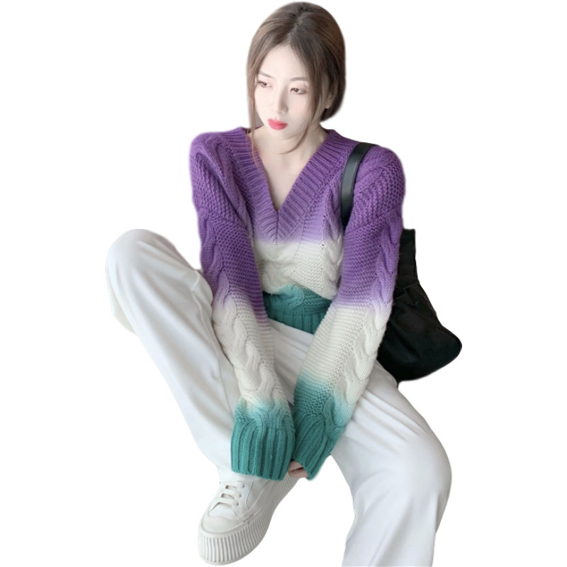Комплект, трикотажный свитер, белые штаны, V-образный вырез, градиент, оверсайз, высокая талия, свободный прямой крой