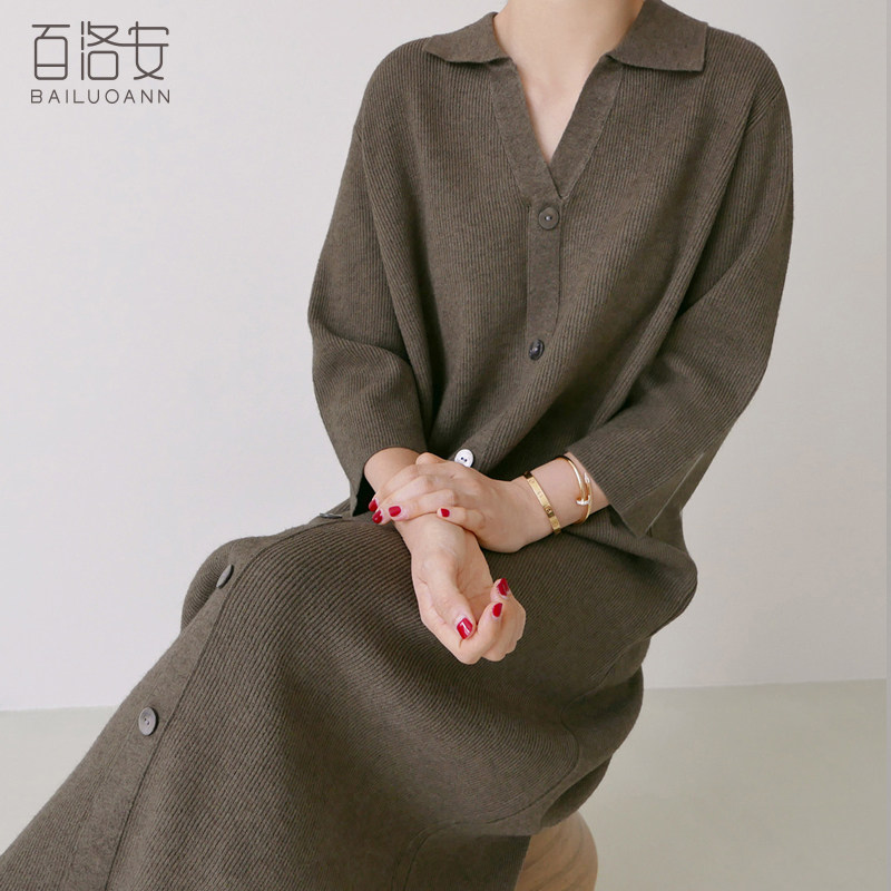 百洛安 Длинный демисезонный свитер, булавка, трикотажное платье, длина макси, оверсайз, в корейском стиле