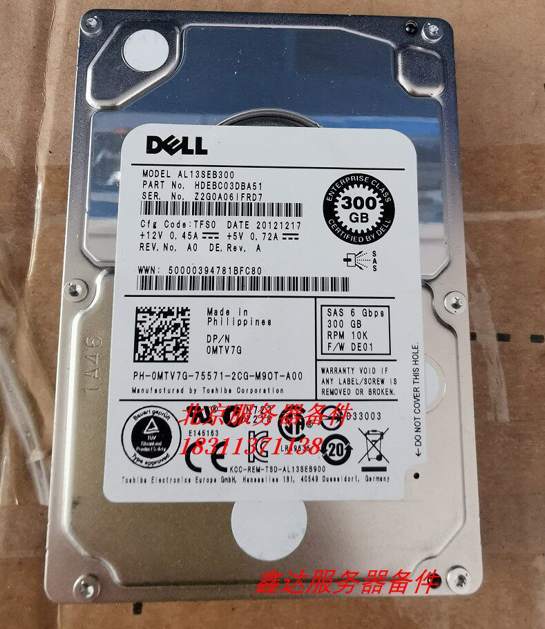 Жесткий диск сервера DELL/Dell 300G 10K SAS 2,5 6 ГБ 0MTV7G AL13SEB300