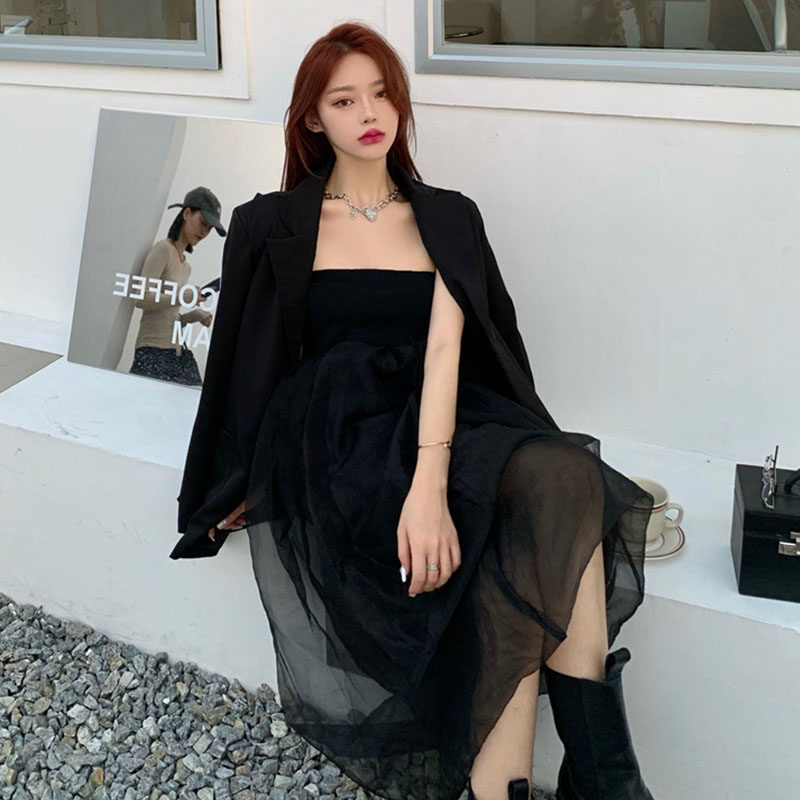 Комплект, универсальный пиджак классического кроя, топ без лямок, вечернее платье, в корейском стиле